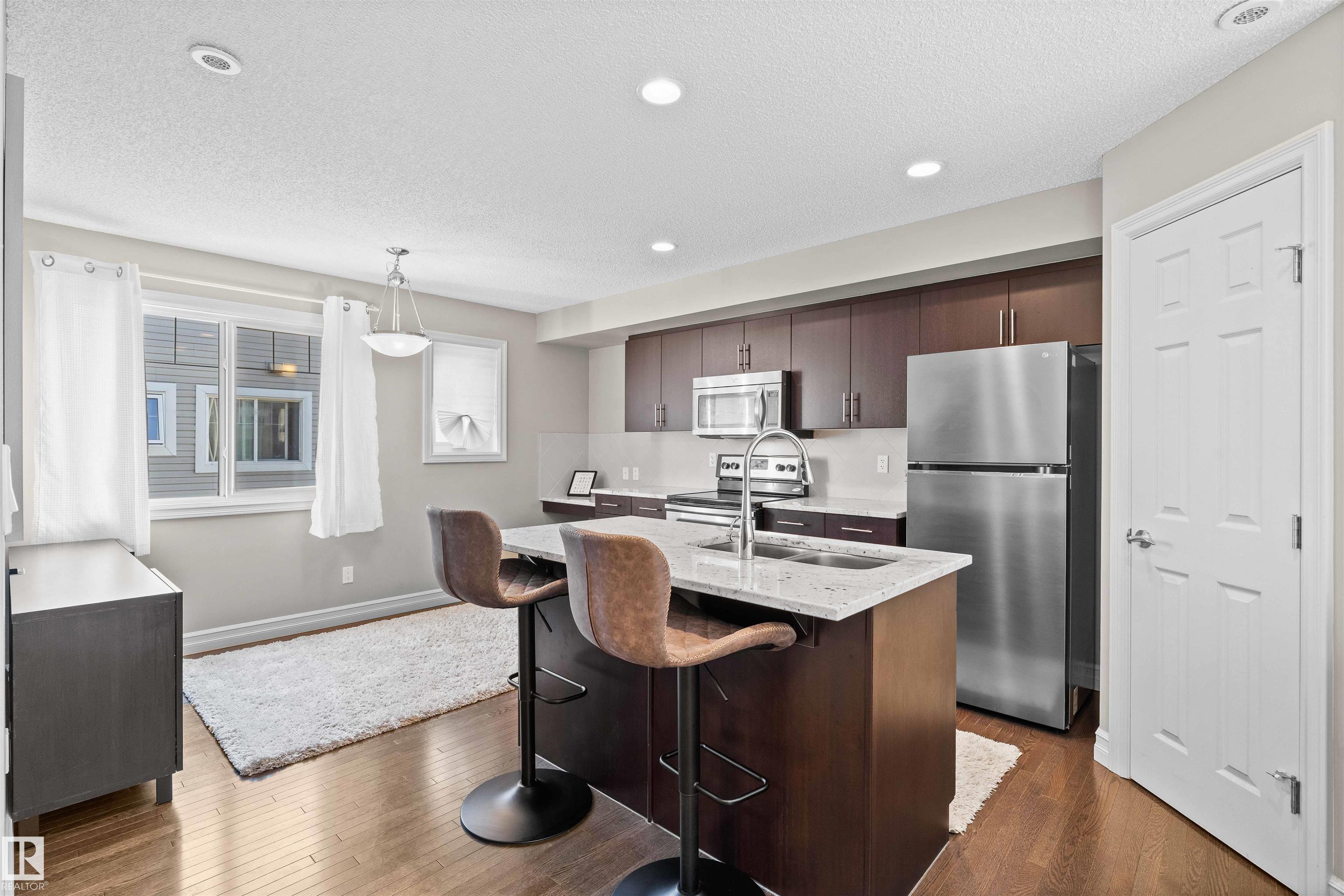 Welcome to this modern 3-bedroom, 2.5-bathroom END UNIT home w/double attached garage & LOW condo fees in one of South Edmonton?s most desirable communities! Perfect for first-time buyers or investors, this property offers nearly 1,400 sq ft of stylish living space. The main floor features a bright open-concept layout w/extra windows for more natural light, a spacious dining area & kitchen with granite countertops & stainless steel appliances. For added convenience, you?ll also find a powder room & a generous laundry room on the main level. Upstairs, enjoy three spacious bedrooms, including a primary suite with a walk-in closet & private ensuite. A second full bathroom serves bedrooms 2 and 3. The front yard is perfect for kids or pets to play, while the double attached garage makes Alberta winter mornings a little easier. As an end unit, you?ll also appreciate the extra privacy, additional windows, and increased natural light throughout. Don?t miss the chance to own this beautiful, low-maintenance home!