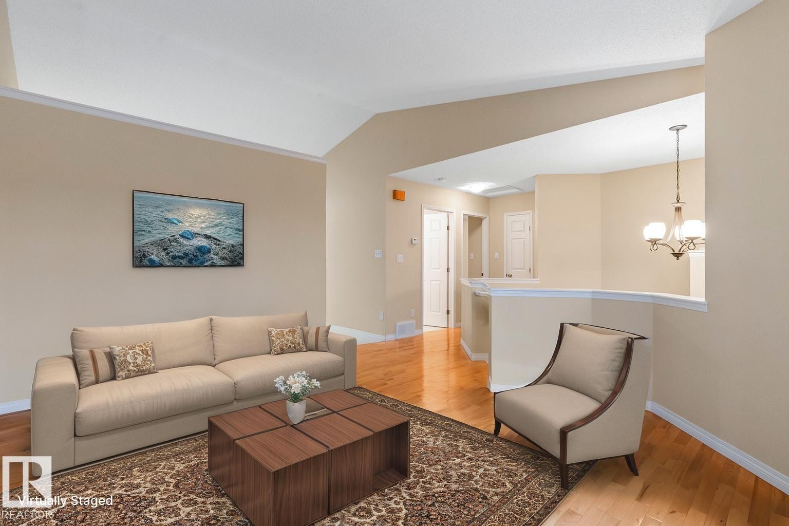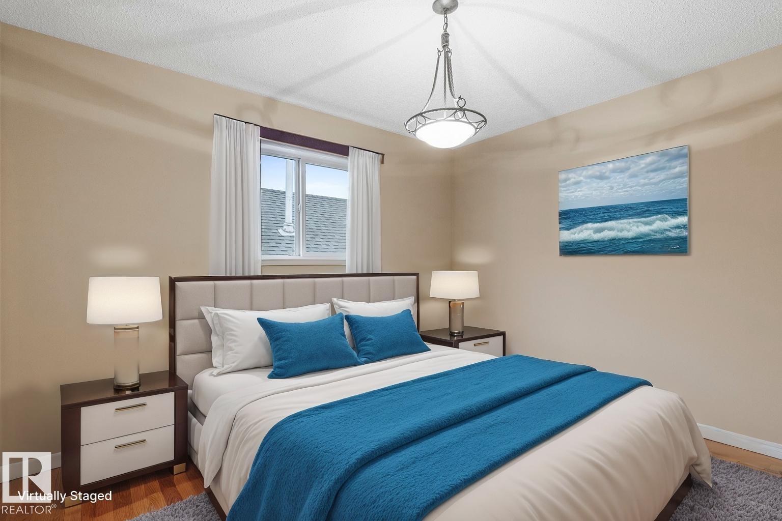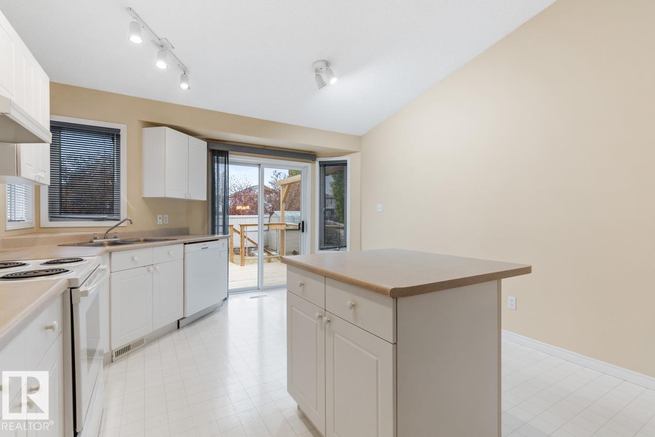 Tucked onto a quiet cul-de-sac, this beautifully maintained bi-level is filled with natural light and features 3 bedrooms and 3 baths. A spacious foyer welcomes you in and opens to a bright living room with vaulted ceilings and gleaming hardwood floors. The kitchen offers plenty of cabinets, a corner pantry, and an island overlooking the dining area, perfect for family gatherings. The hardwood continues into the king-sized primary suite complete with a 3pc ensuite, while a generous second bedroom and 4pc main bath complete the main level. The fully finished basement provides even more living space with a large rec room and cozy fireplace, 3rd bedroom, 3pc bath, and an oversized laundry/storage room. Updates include shingles (2020) and a new deck overlooking the fenced, landscaped yard and garden. Ideally located steps from Strathcona Athletic Park, Heritage Wetlands, schools, and parks, this is the perfect place to call home!