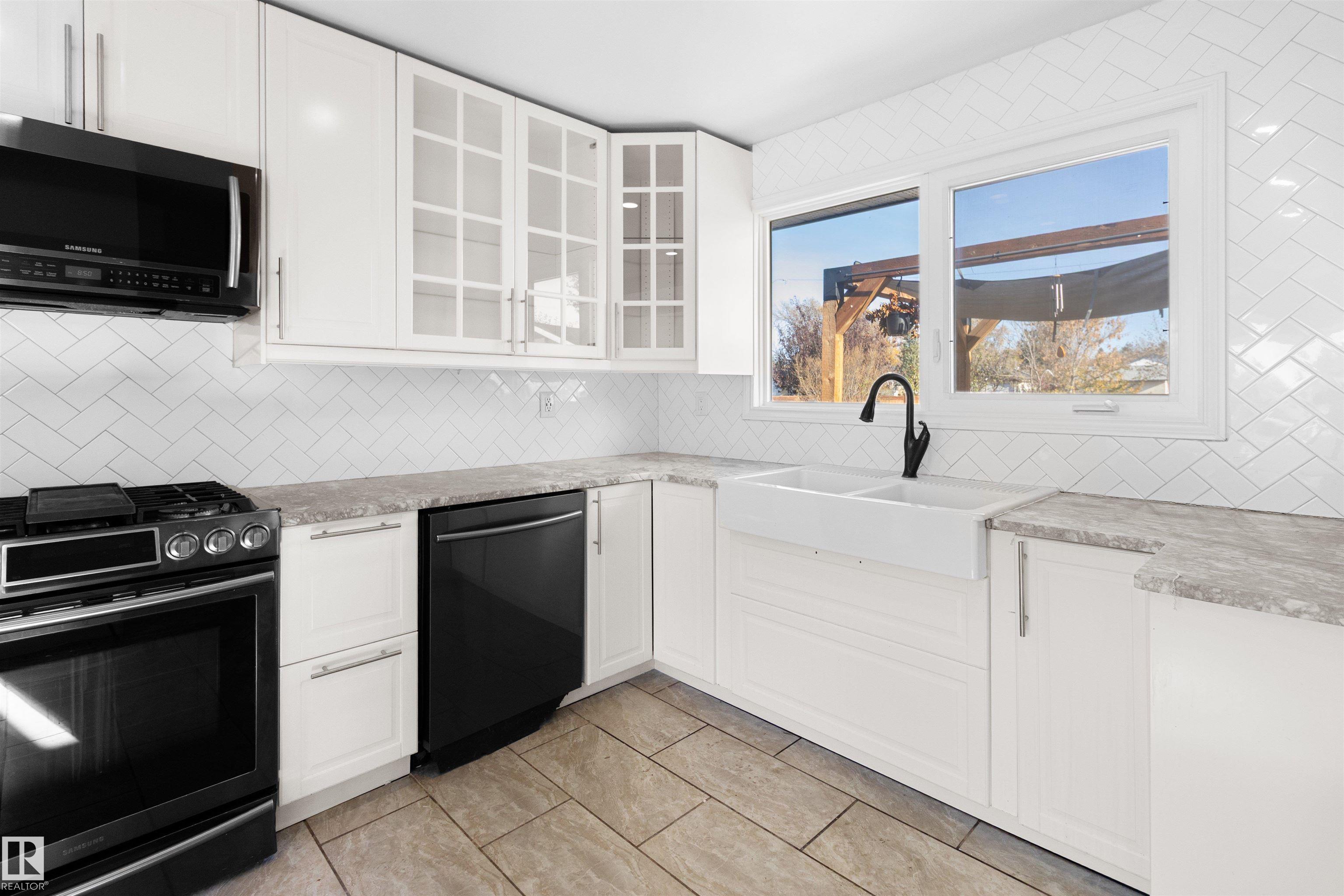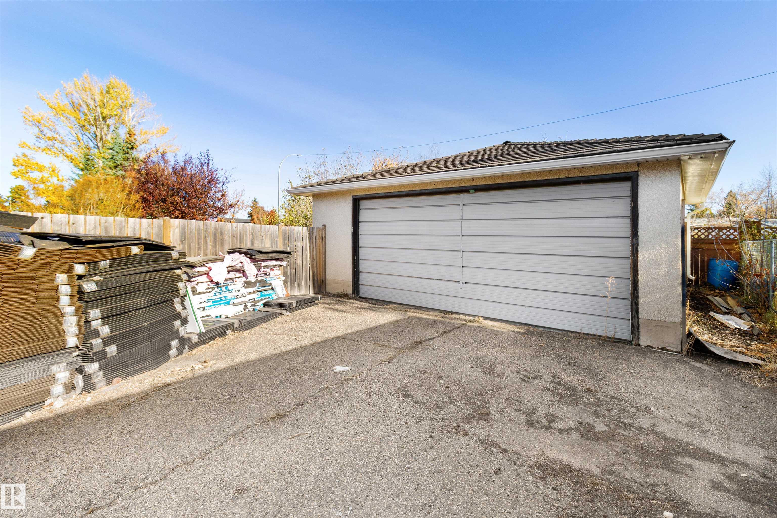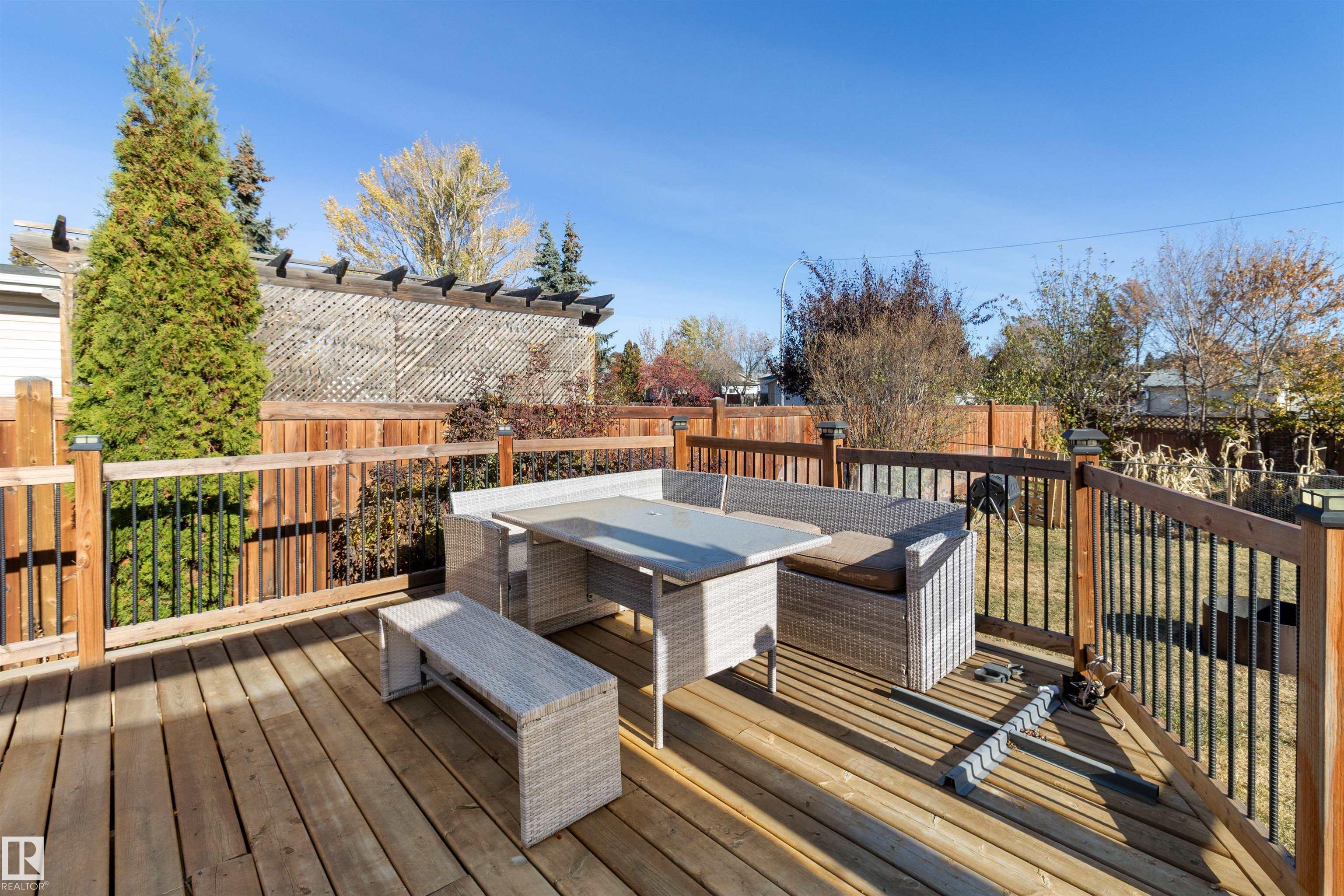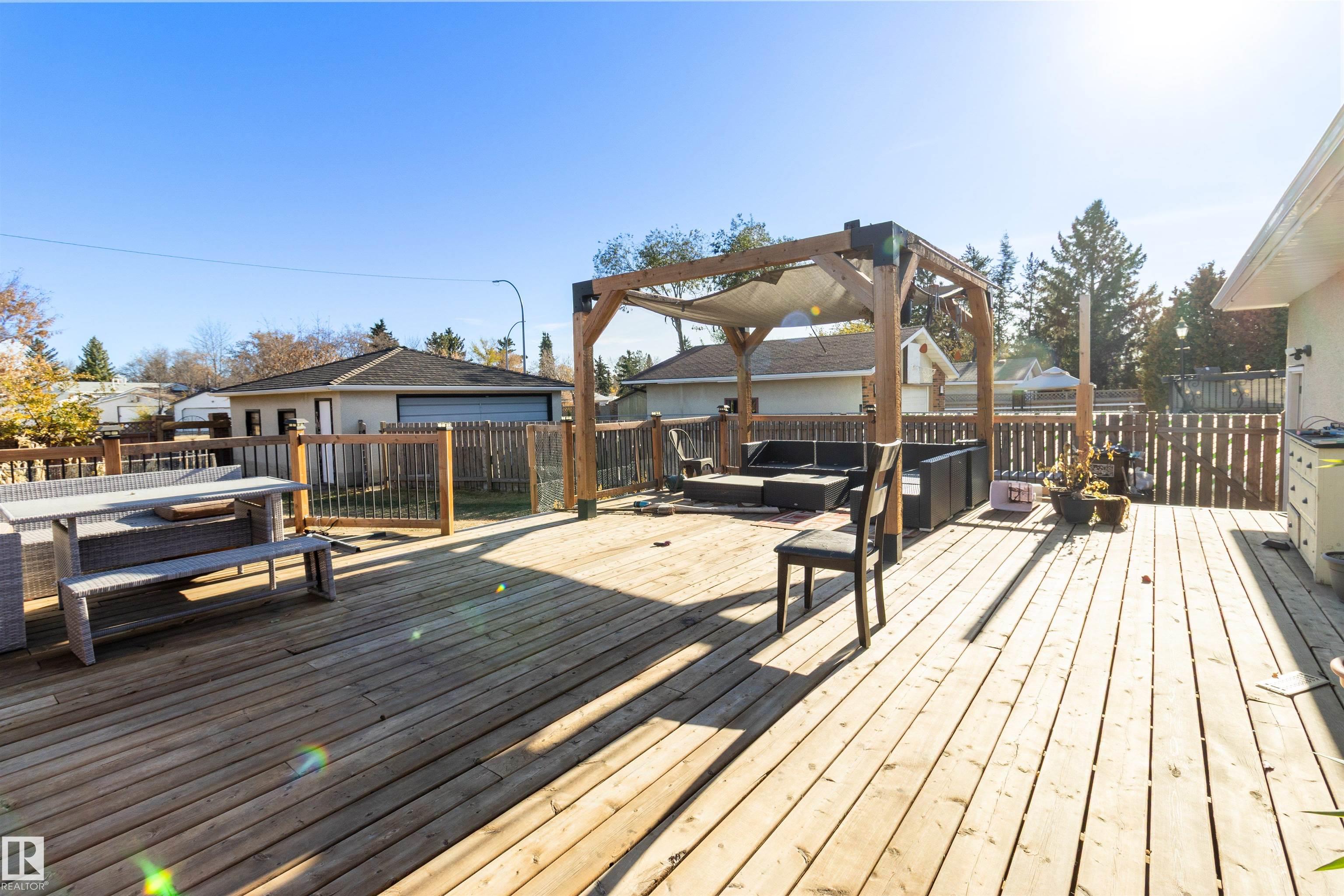 Welcome to this beautifully updated 1,200 sq. ft. open-concept bungalow, ideally situated in quiet cresent near transit, the Henday, and shopping. Step inside to discover a bright, modern main floor featuring new flooring, fresh paint, and three spacious bedrooms. The updated kitchen is perfect for entertaining, with generous counter space and storage for all your culinary needs. New patio doors lead to a massive backyard and large custom deck ? an inviting space for summer BBQs and outdoor fun. The double detached garage includes a durable Euroshield roof, adding long-term value and peace of mind. The fully finished basement, with its own entrance, offers exceptional flexibility ? complete with a second kitchen, laundry, two bedrooms, and a full bath, making it perfect for guests or extended family. Additional highlights include a 2020 furnace and a tankless water heater, combining comfort, efficiency, and style in one move-in-ready home.