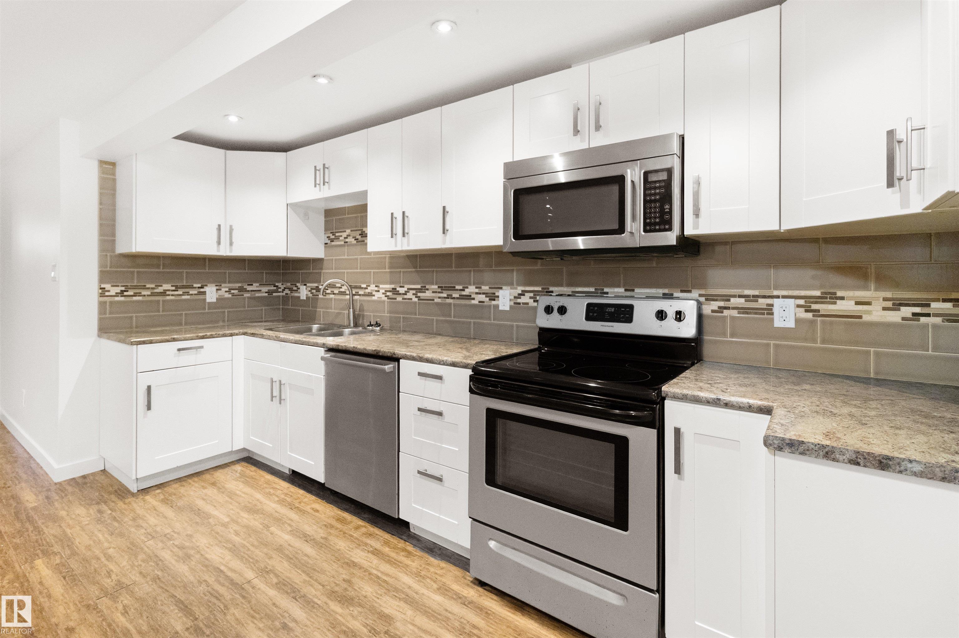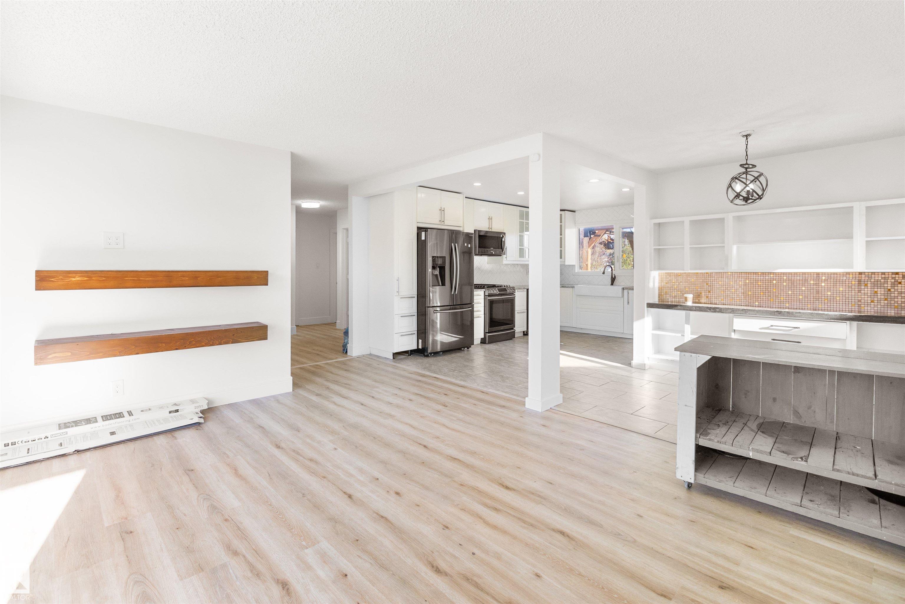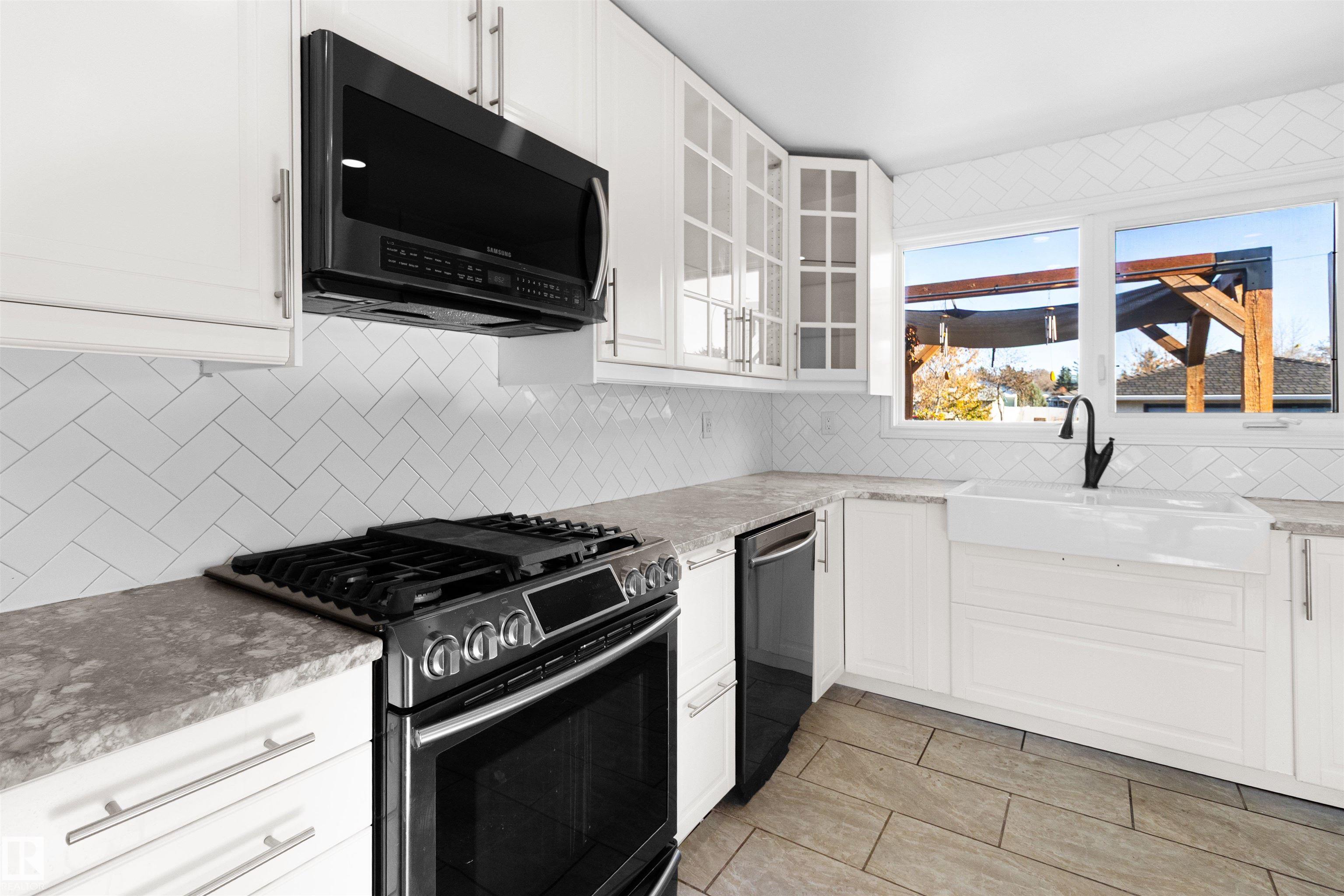 Welcome to this beautifully updated 1,200 sq. ft. open-concept bungalow, ideally situated in quiet cresent near transit, the Henday, and shopping. Step inside to discover a bright, modern main floor featuring new flooring, fresh paint, and three spacious bedrooms. The updated kitchen is perfect for entertaining, with generous counter space and storage for all your culinary needs. New patio doors lead to a massive backyard and large custom deck ? an inviting space for summer BBQs and outdoor fun. The double detached garage includes a durable Euroshield roof, adding long-term value and peace of mind. The fully finished basement, with its own entrance, offers exceptional flexibility ? complete with a second kitchen, laundry, two bedrooms, and a full bath, making it perfect for guests or extended family. Additional highlights include a 2020 furnace and a tankless water heater, combining comfort, efficiency, and style in one move-in-ready home.