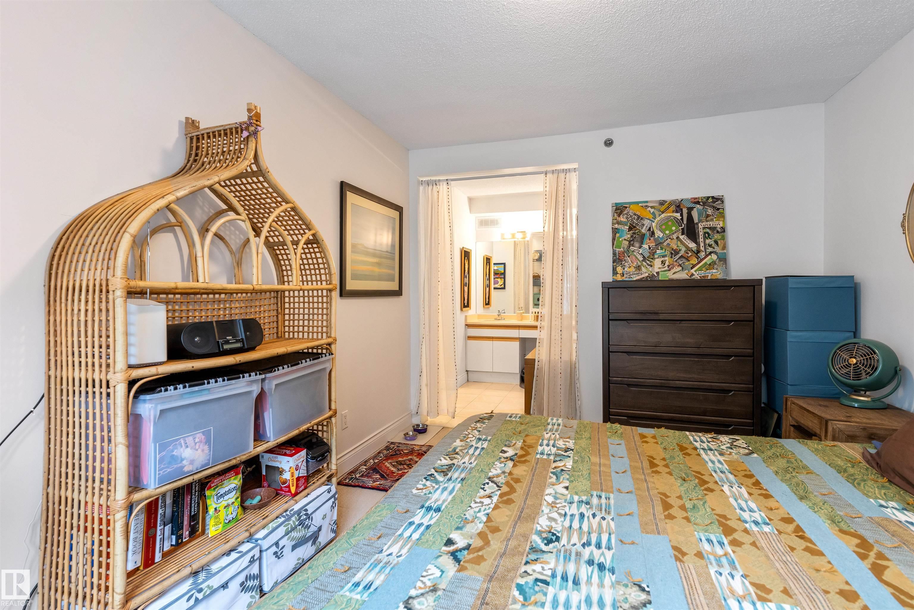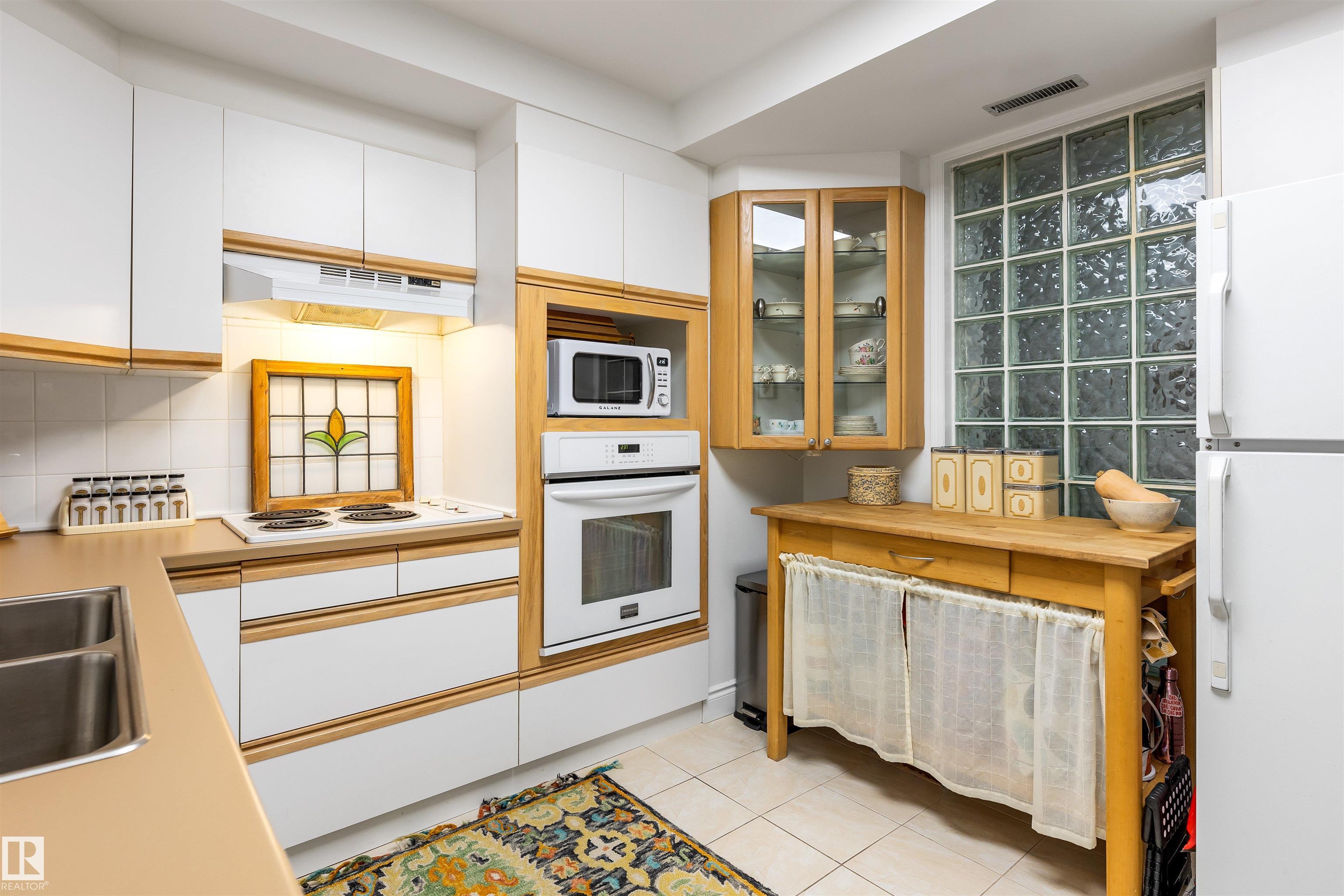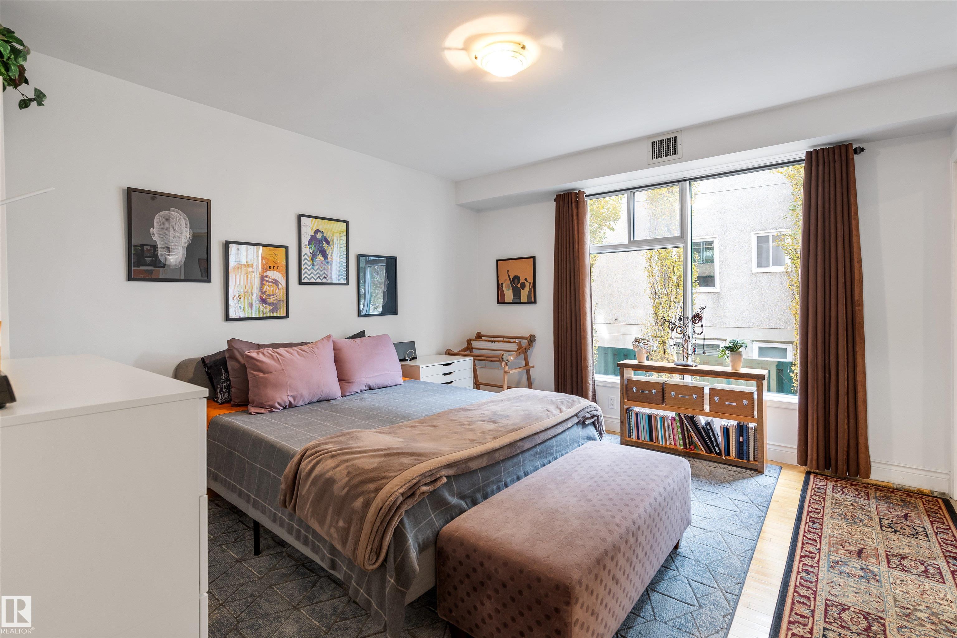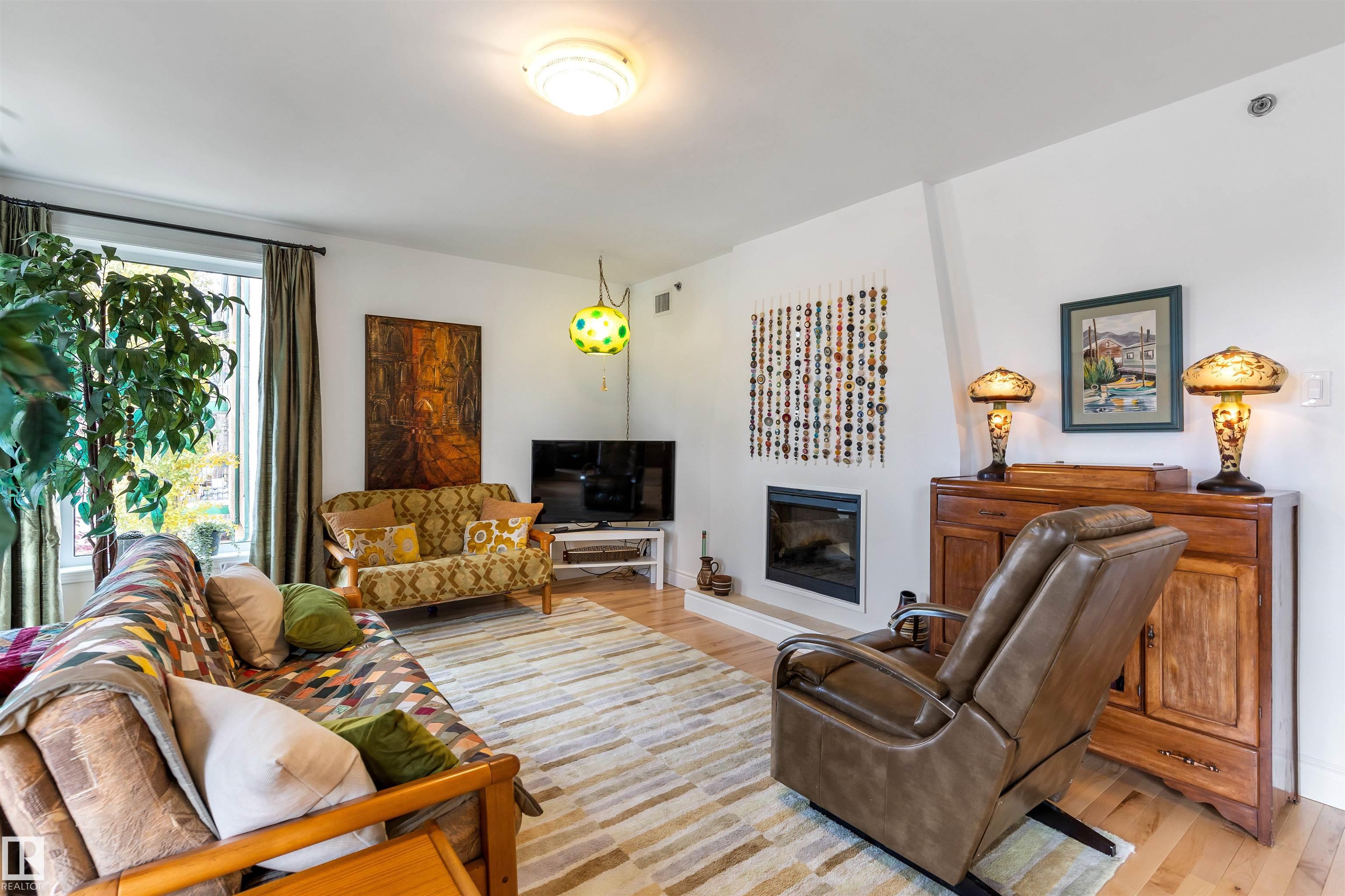 Steps from the Edmonton River Valley discover this SPACIOUS ONE OF A KIND CONDO in the Rembrandt. The private entrance is a beautiful spot to greet guests. The unit opens into the kitchen with European style cabinetry, tiled back splash, pot/pan drawers & loads of counter space. The dining room can easily accommodate entertaining, has HARDWOOD FLOORING & an abundance of storage with 2 closets. French doors separate the dining room from the central hall. The living room is huge with walls of windows & features a stunning electric fireplace. The living room has additional flex space on one end to accommodate an office. There are 2 BEDROOMS. The primary bedroom features a 5 piece ensuite with double sinks. There is a 3-piece bathroom, in suite laundry & a den with access to the outdoor balcony. The den has a 2nd electric fireplace. This is a unique building with only 16 suites. This is a pet friendly building. Heat & electricity are included in the condo fee. 1 assigned HEATED PARKING stall.