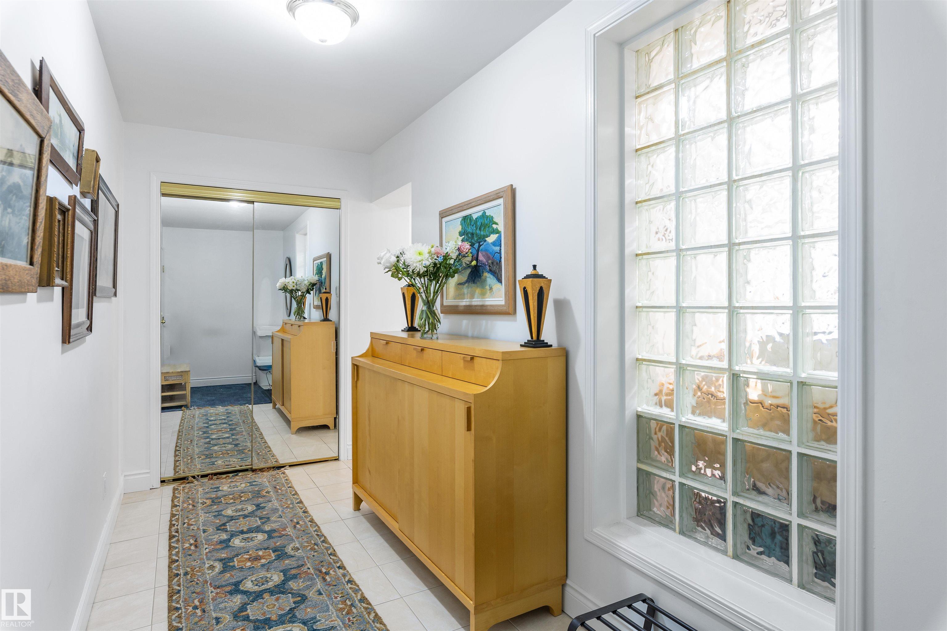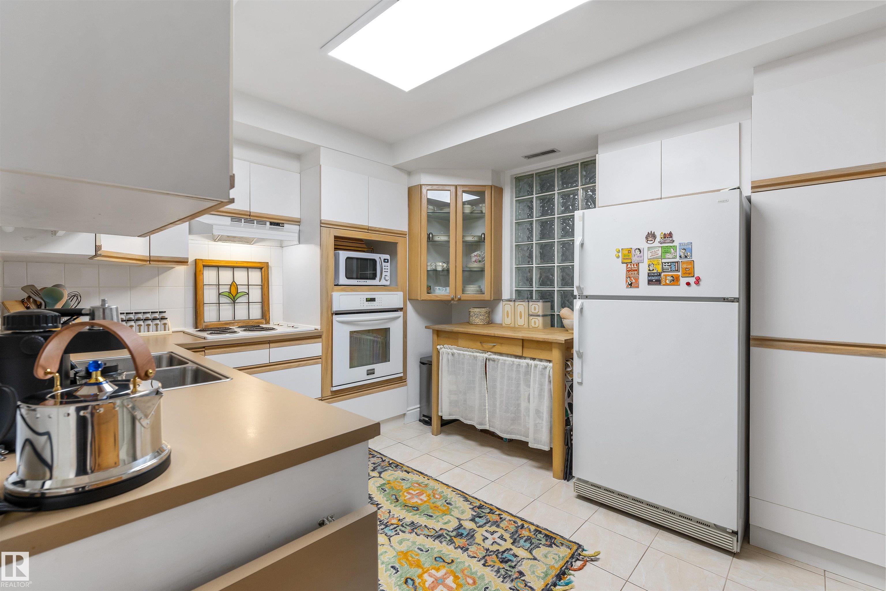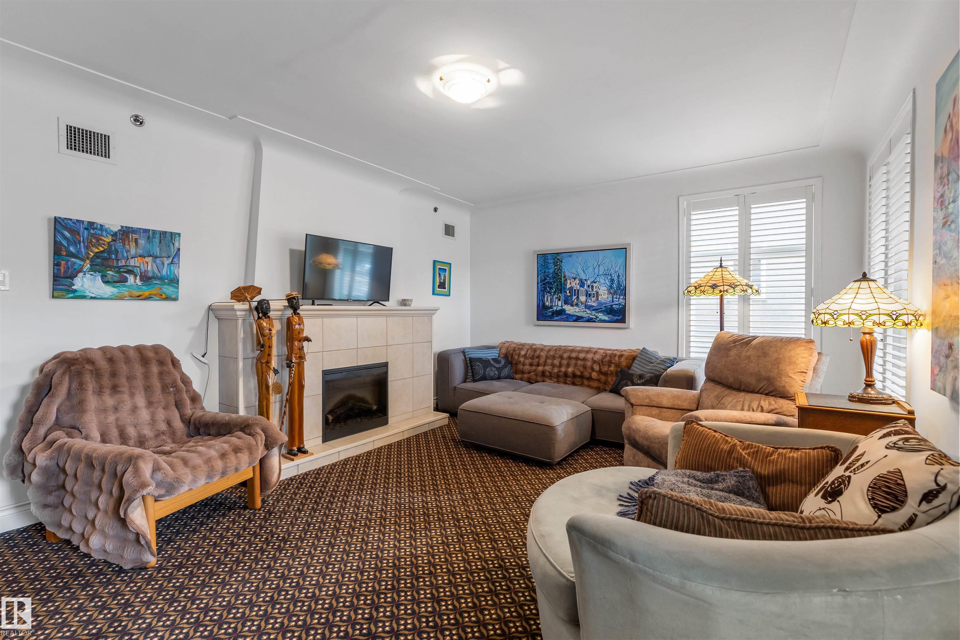 Steps from the Edmonton River Valley discover this SPACIOUS ONE OF A KIND CONDO in the Rembrandt. The private entrance is a beautiful spot to greet guests. The unit opens into the kitchen with European style cabinetry, tiled back splash, pot/pan drawers & loads of counter space. The dining room can easily accommodate entertaining, has HARDWOOD FLOORING & an abundance of storage with 2 closets. French doors separate the dining room from the central hall. The living room is huge with walls of windows & features a stunning electric fireplace. The living room has additional flex space on one end to accommodate an office. There are 2 BEDROOMS. The primary bedroom features a 5 piece ensuite with double sinks. There is a 3-piece bathroom, in suite laundry & a den with access to the outdoor balcony. The den has a 2nd electric fireplace. This is a unique building with only 16 suites. This is a pet friendly building. Heat & electricity are included in the condo fee. 1 assigned HEATED PARKING stall.