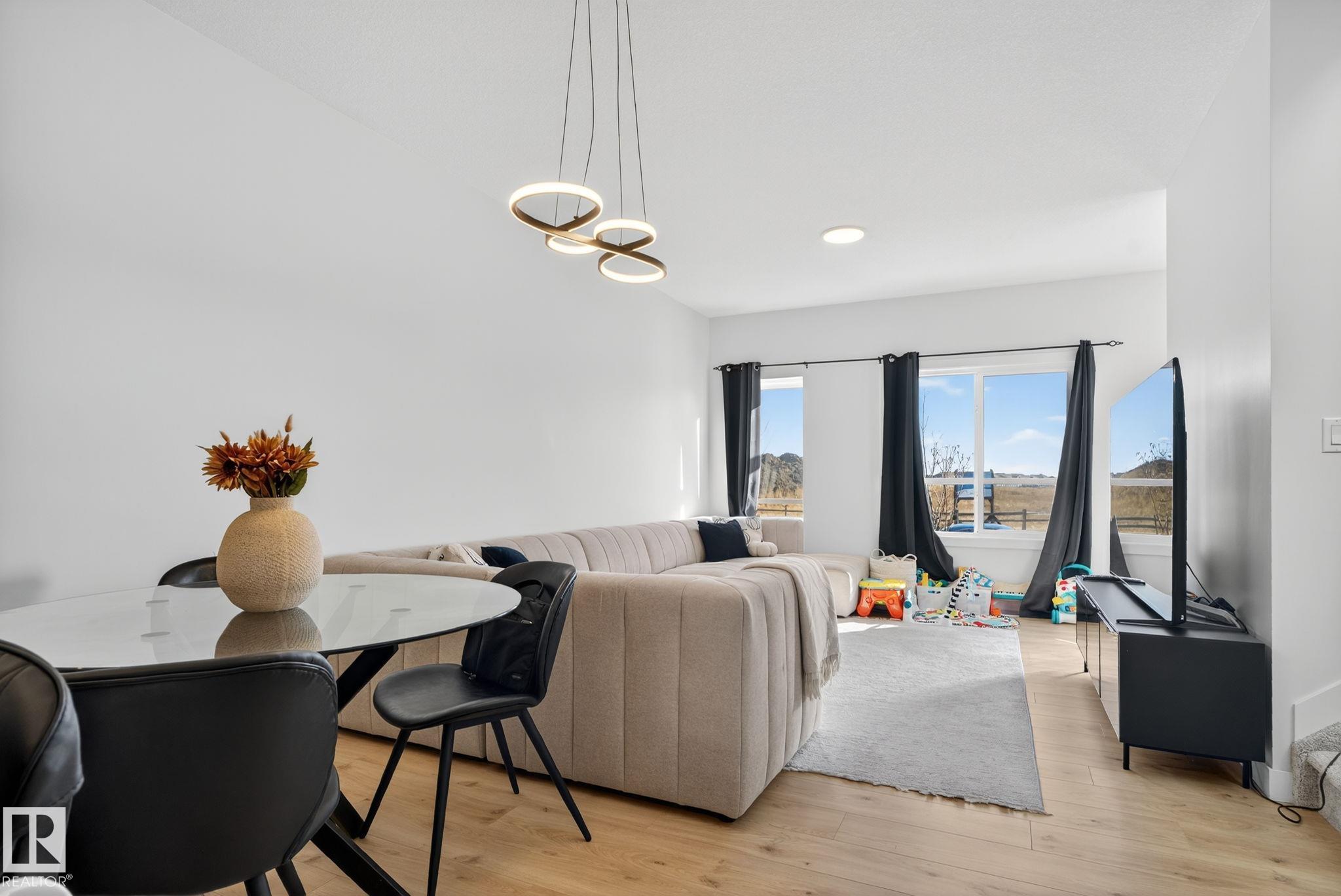 NO CONDO FEES! Welcome to Crystallina Nera, one of North Edmonton?s most family-friendly communities! This newer half duplex sits on a corner lot across from a green space, offering privacy, extra sunlight & plenty of parking. Inside, you?ll love the bright, open layout with 3 bedrooms up, 2.5 baths, and oversized windows filling every level with natural light?even the basement suite! The modern kitchen features stainless steel appliances, a large island & cozy living space for family nights or entertaining. Upstairs includes laundry & a spacious primary suite with walk-in closet and ensuite. The legal basement suite has its own entrance, kitchen, living area, bedroom, bath & laundry?perfect mortgage helper or turnkey investment. Complete with a double garage and a spacious yard.