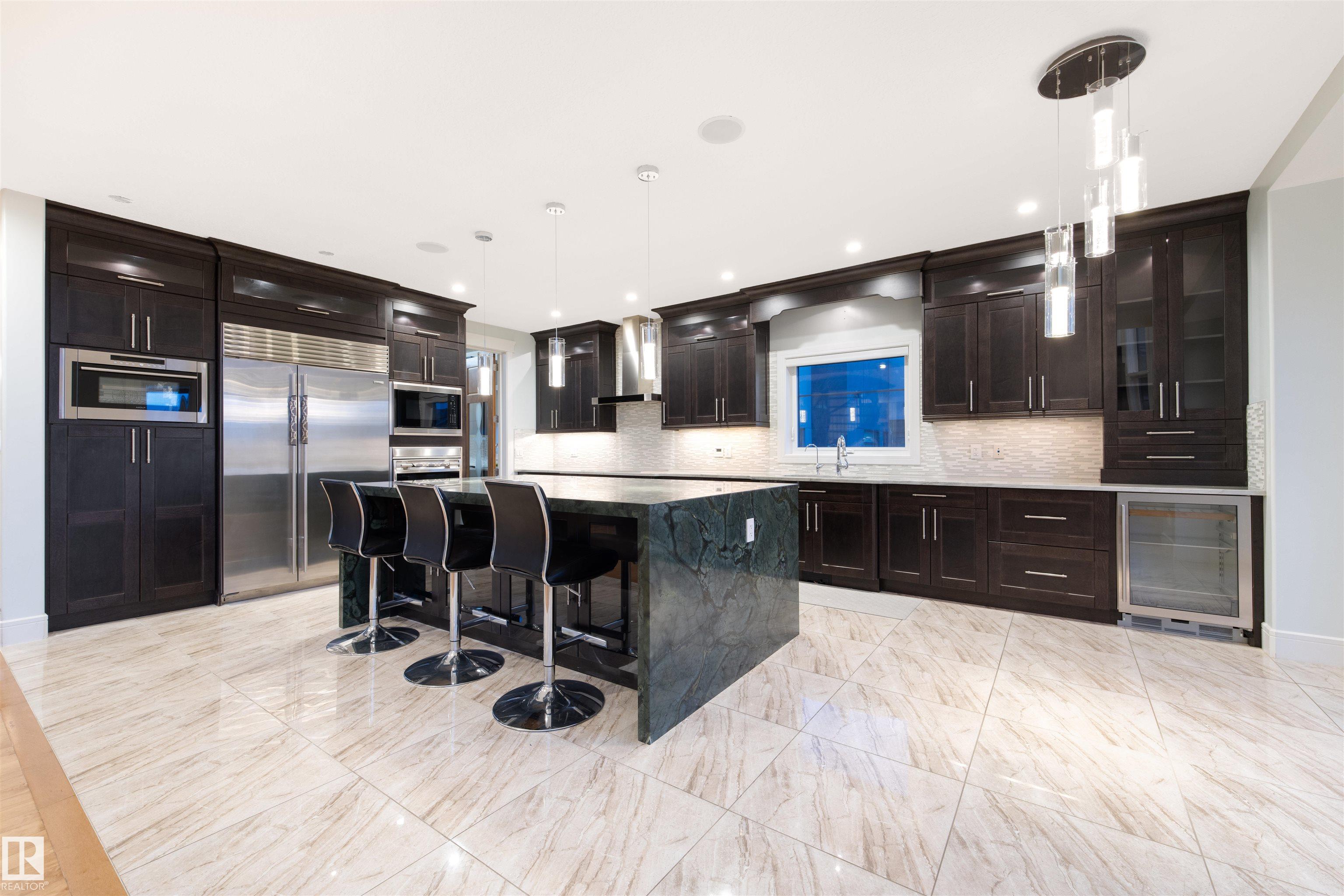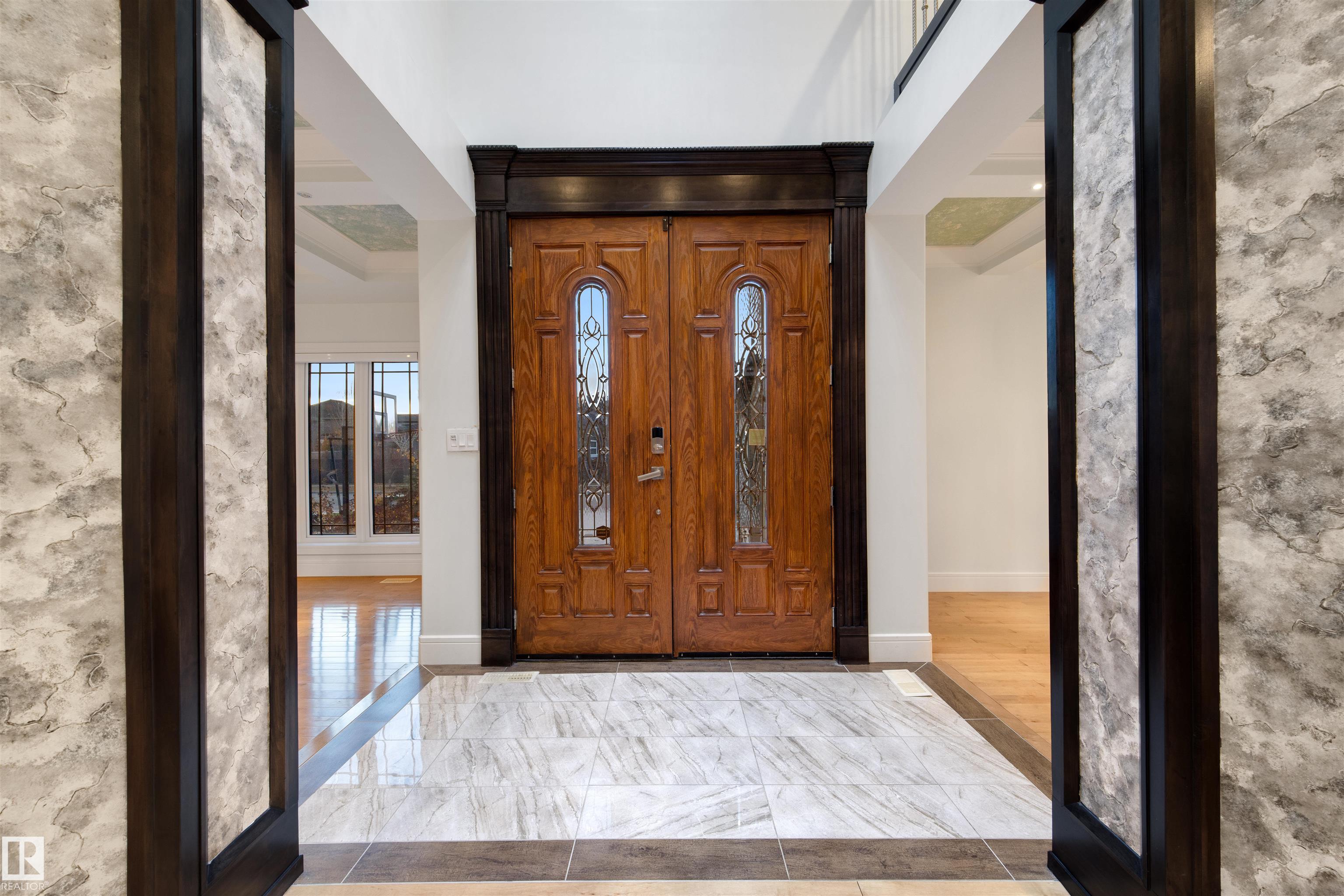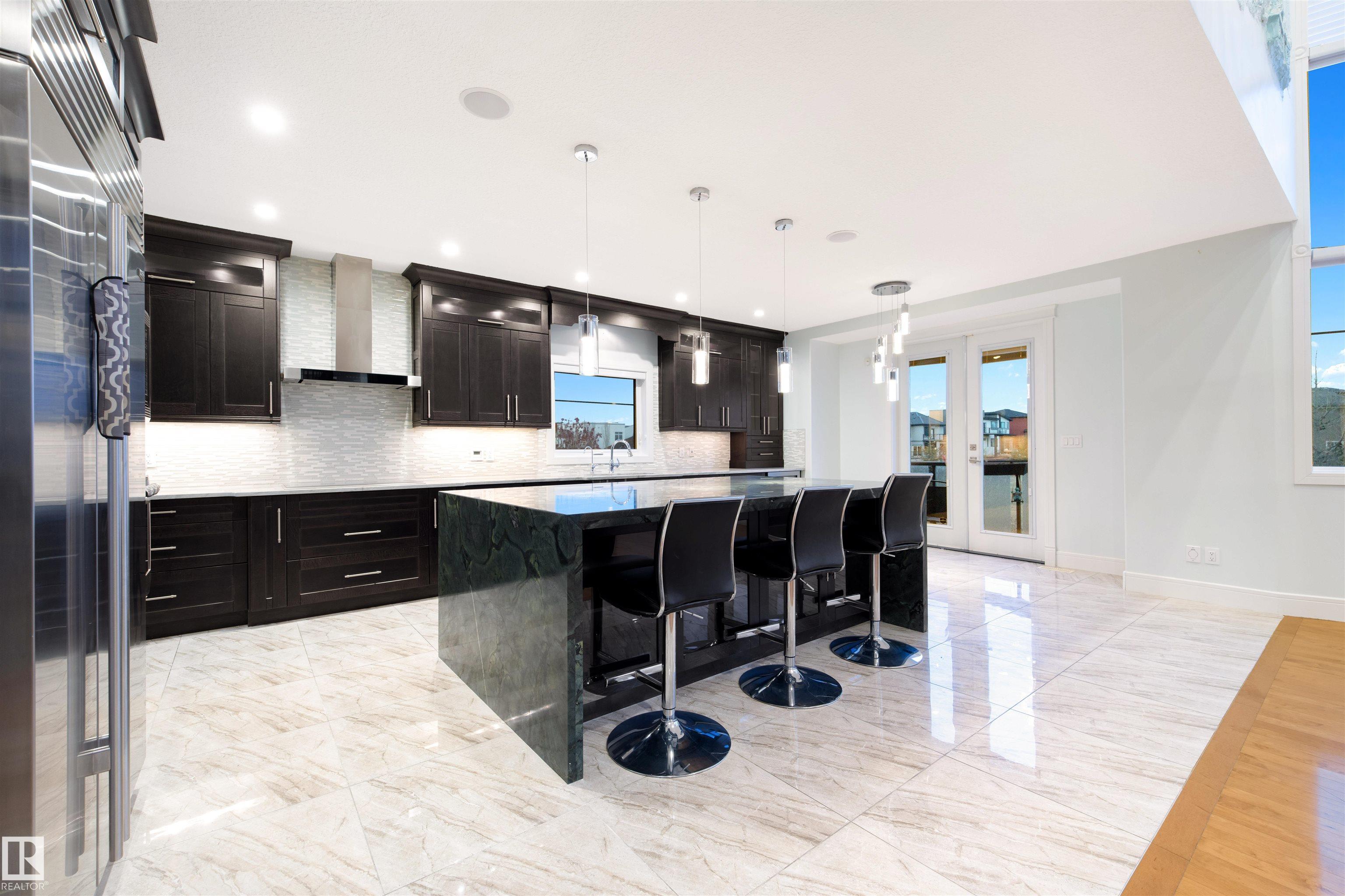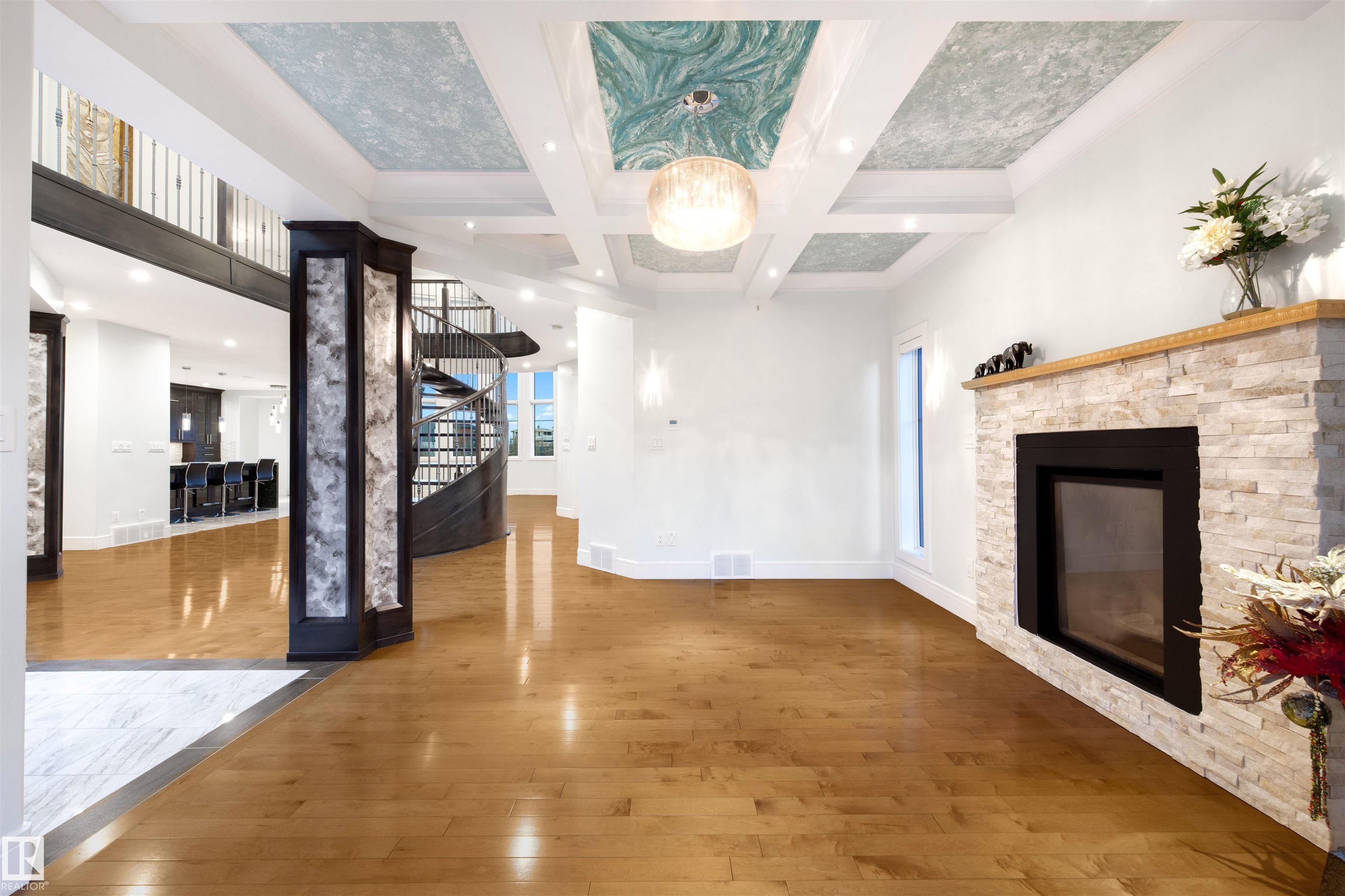 Exquisite WALKOUT ESTATE in prestigious Westpointe of Windermere, offering 6,152 sq.ft. of living space and BACKING ONTO SERENE GREEN SPACE. This thoughtfully designed custom home features: spacious 6 bedrooms, 6 baths (including 4 en-suites), a HEATED TRIPLE GARAGE, central A/C, high-end appliances, spice kitchen, elegant feature walls, open-to-above living area, formal dining & living rooms, BALCONY, HEATED BASEMENT FLOOR, plus a main-floor bedroom with full bath. The upper level includes: a bonus room overlooking the park and a luxurious primary suite with spa-style ensuite, jacuzzi, fireplace, and steam shower. The walkout lower level is designed for entertainment with a large recreation room, gym, bedroom, full bath, and access to a covered patio. Fully landscaped with statues and a fountain, this exceptional home combines elegance, comfort, and craftsmanship.