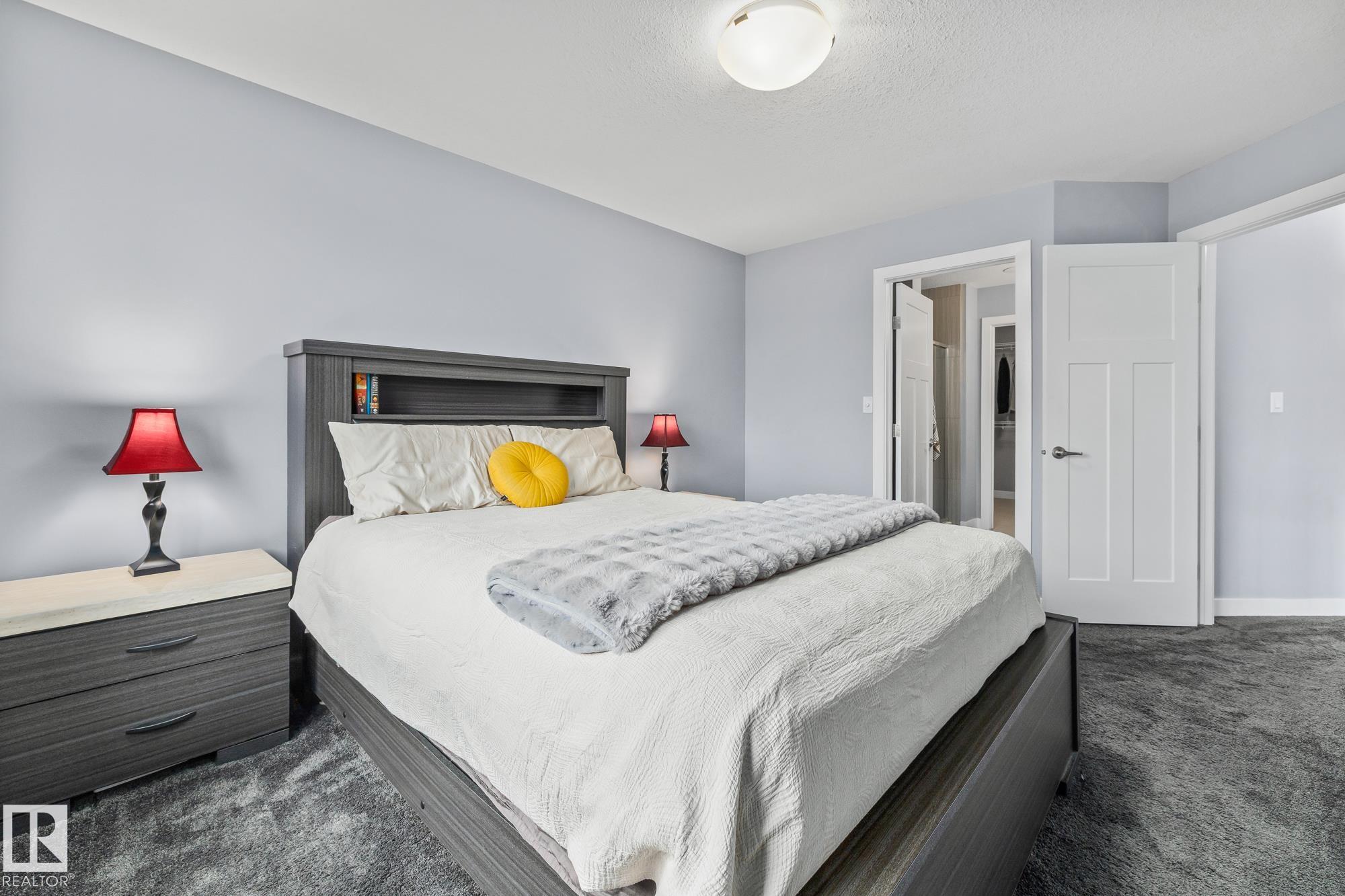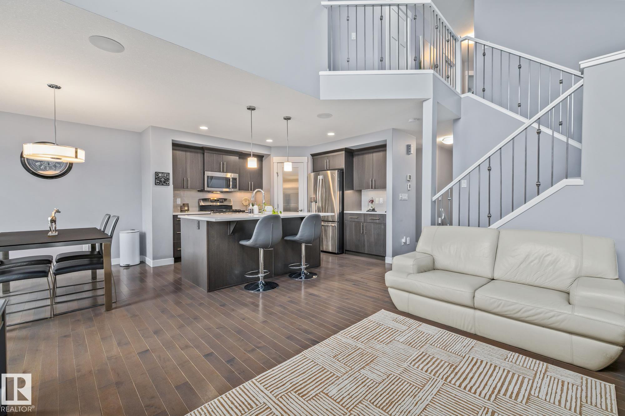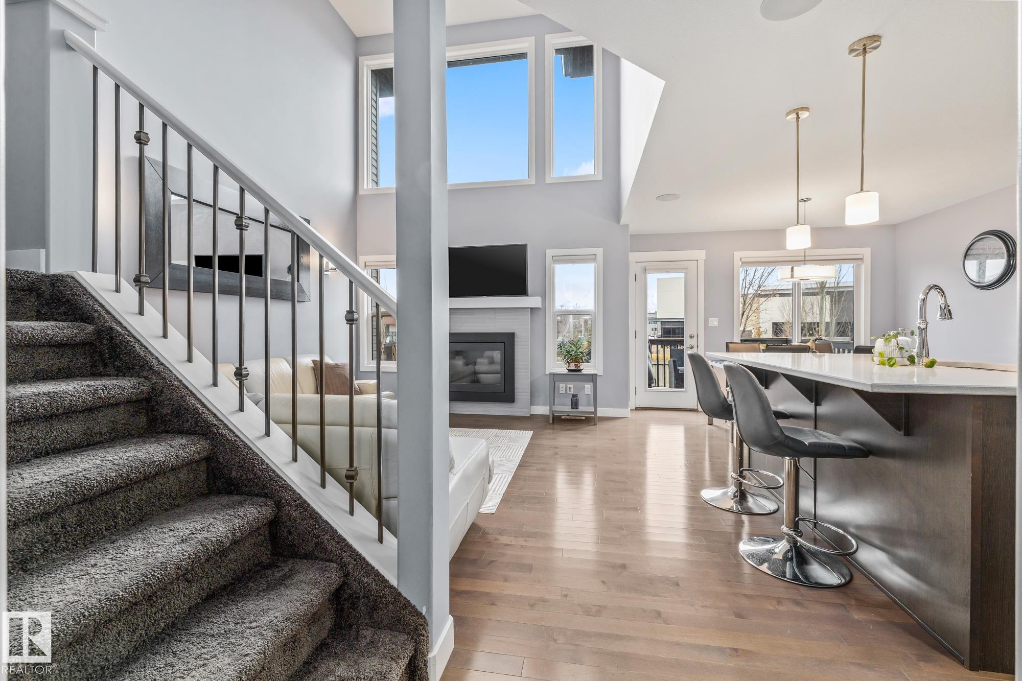 Rarely do you come across a half duplex that features an open-to-below concept, making it feel more open and spacious than any others. This fully upgraded Dolce Vita home is located in a quiet cul de sac in the heart of Windermere, which is surrounded by amenities, and even has an upgraded adjoining wall with extra insulation to minimize noise travel. The main floor welcomes you with a large entryway that leads into the cozy living room with soaring 18ft ceilings, a gas fireplace, and large windows that allow in plenty of sunshine. The kitchen boasts a large island w/ seating, quartz countertops, stainless steel appliances, a gas stove, a walk-in pantry, a comfy dining area, and a central vac kick plate. Upstairs hosts the large primary bedroom with a walkthrough ensuite, featuring dual sinks, and a spacious walk-in closet. Upstairs also has 2 more bedrooms, a 4pc bathroom w/ built-in shelving, and a laundry room for added convenience. The basement is roughed-in and awaits your final touch. Welcome home!