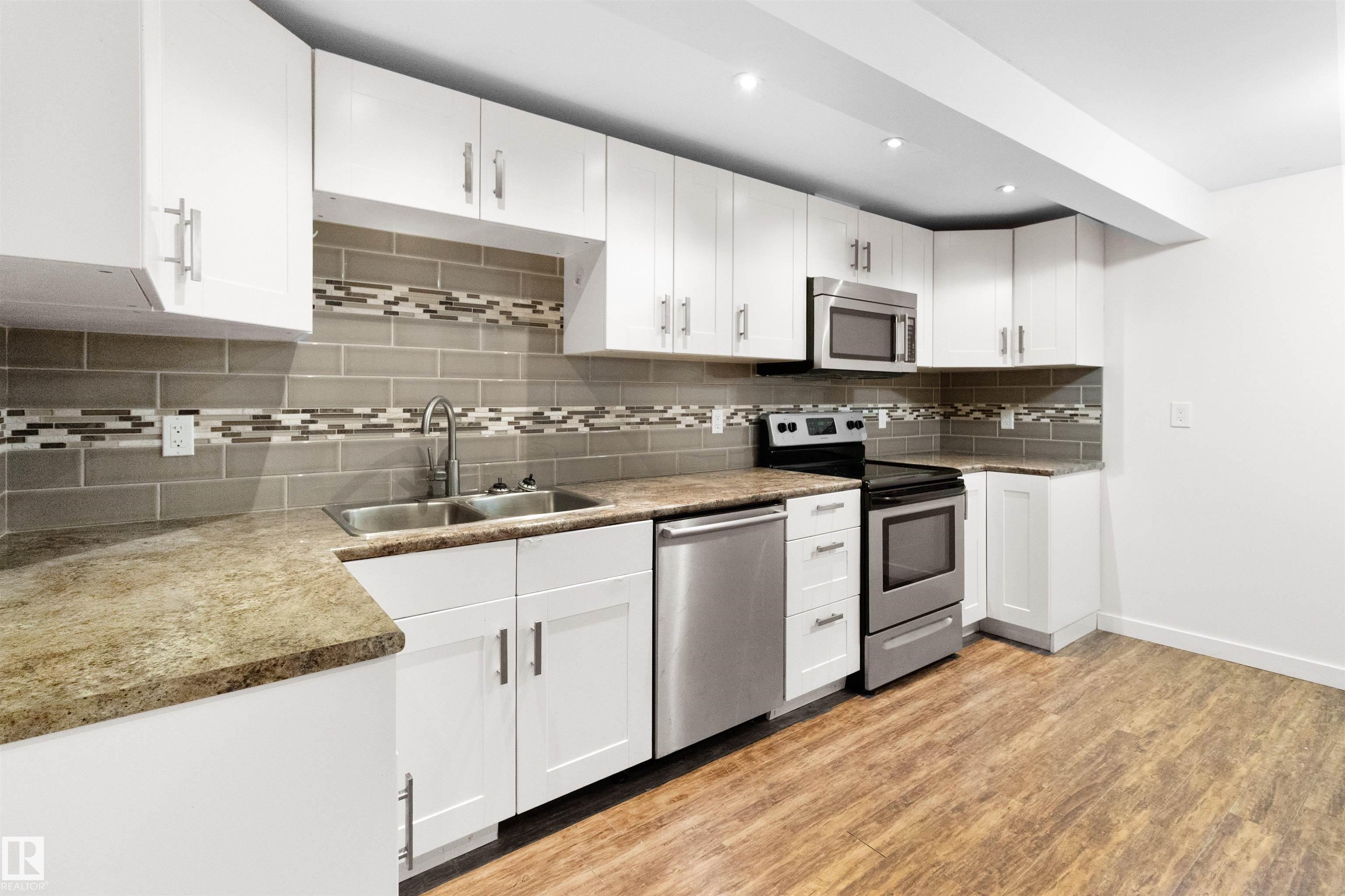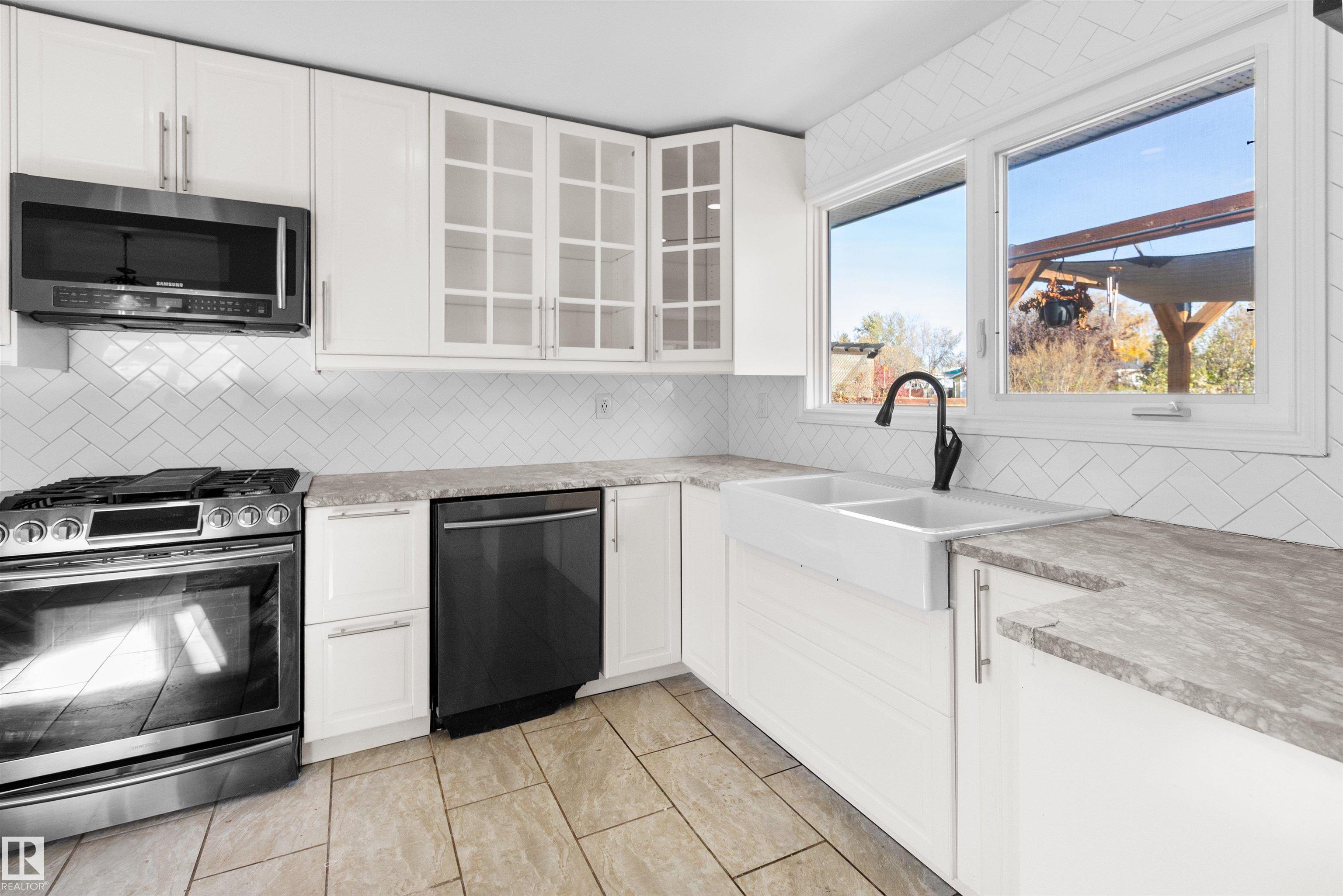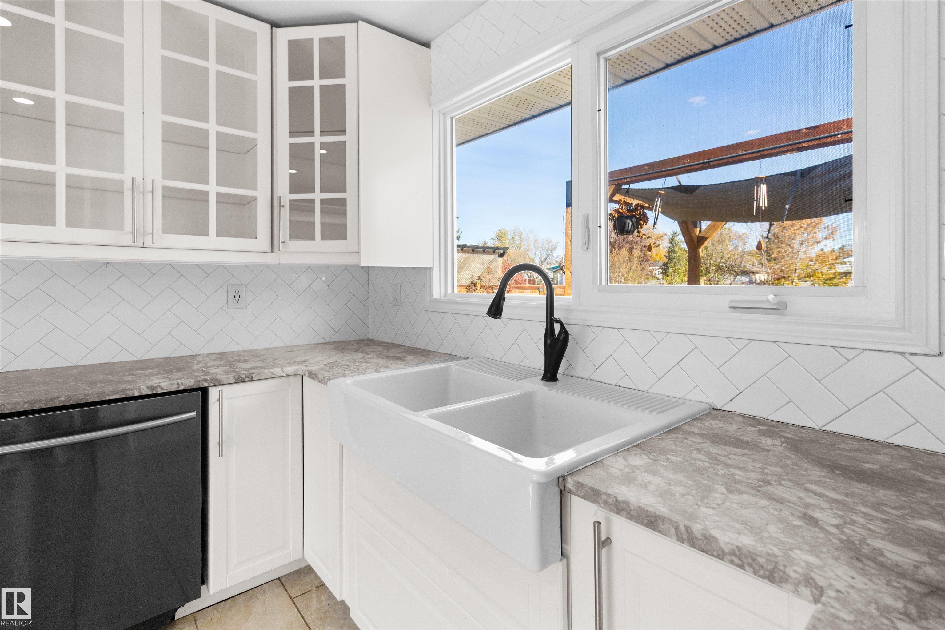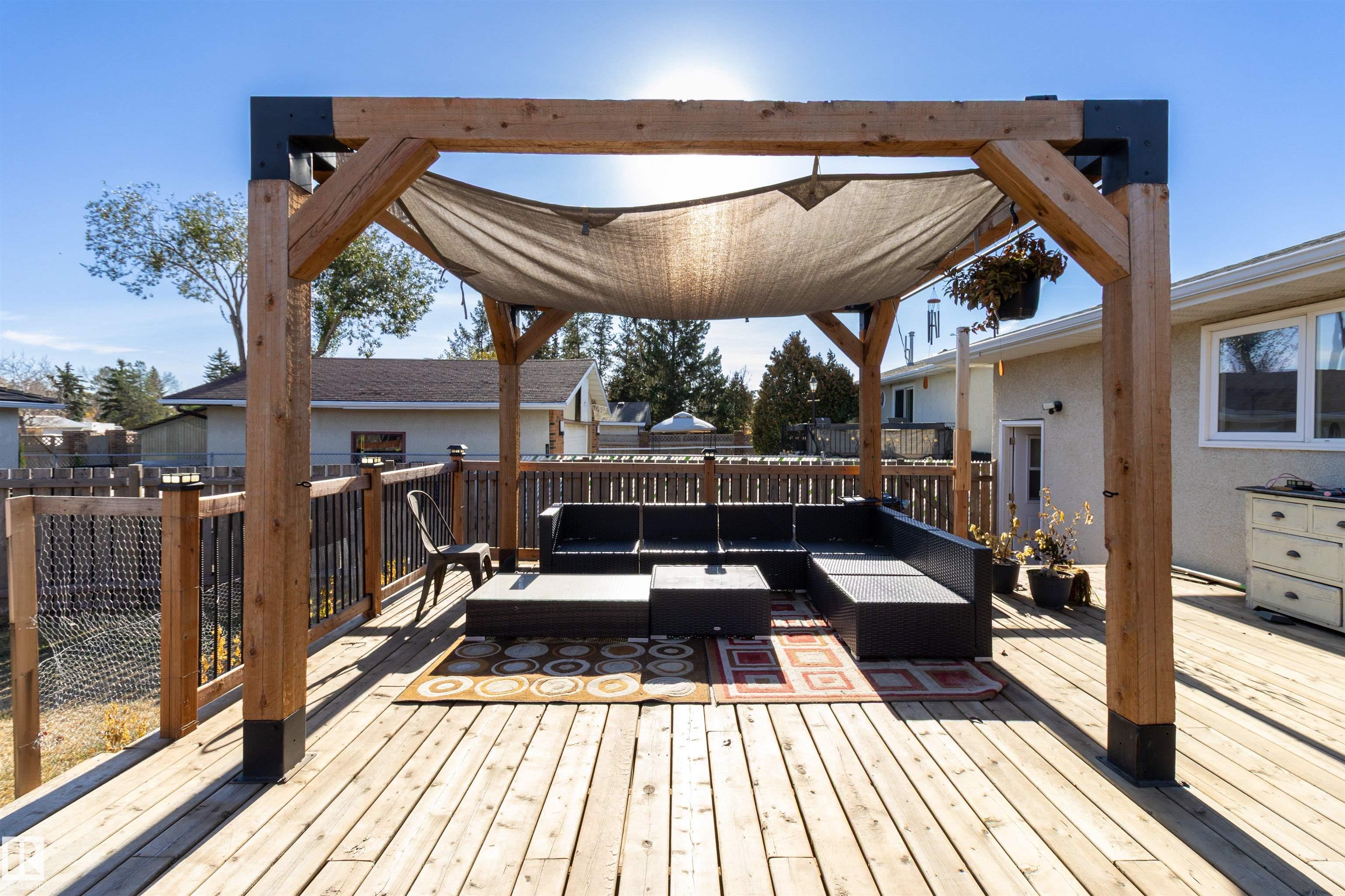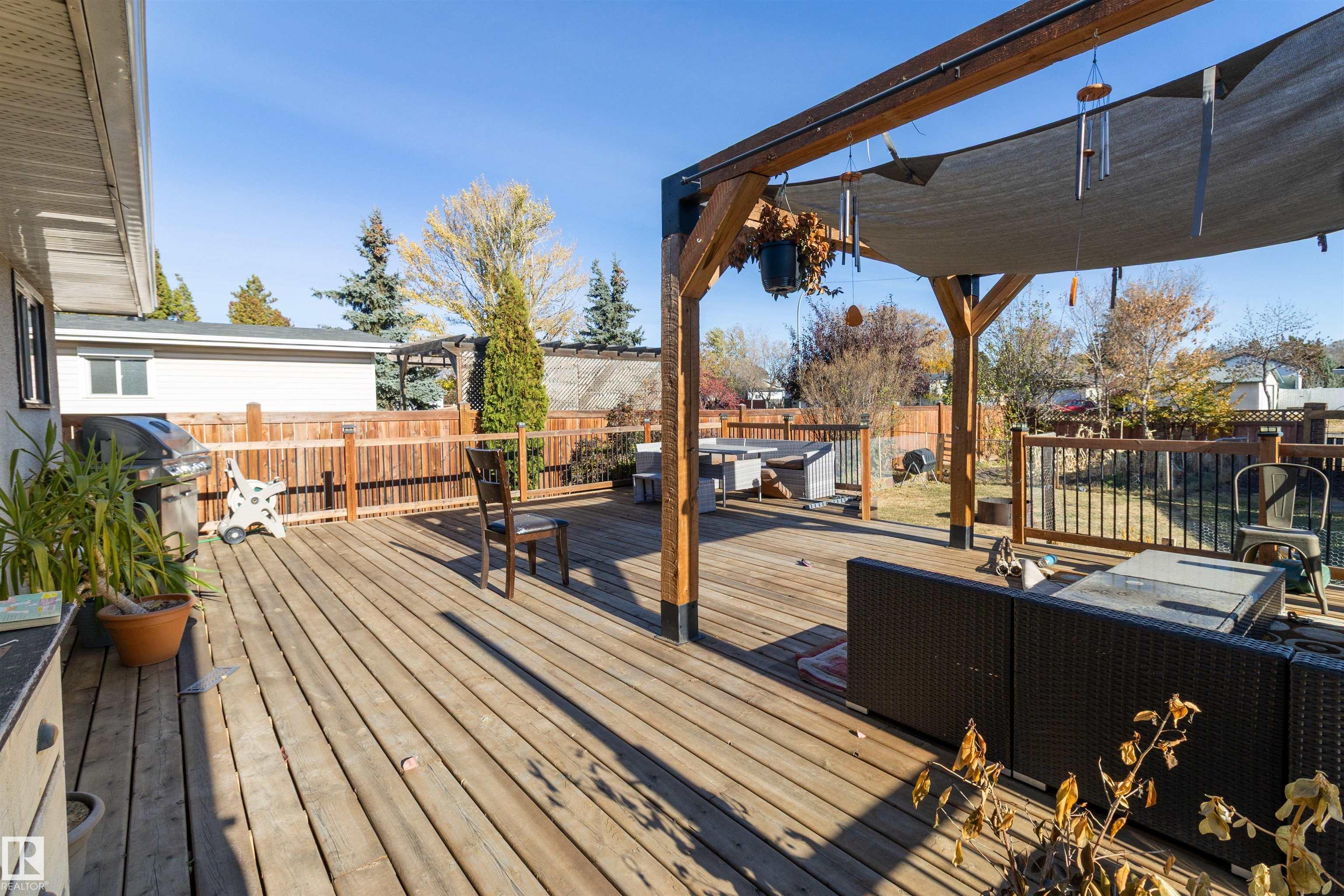 Welcome to this beautifully updated 1,200 sq. ft. open-concept bungalow, ideally situated in quiet cresent near transit, the Henday, and shopping. Step inside to discover a bright, modern main floor featuring new flooring, fresh paint, and three spacious bedrooms. The updated kitchen is perfect for entertaining, with generous counter space and storage for all your culinary needs. New patio doors lead to a massive backyard and large custom deck ? an inviting space for summer BBQs and outdoor fun. The double detached garage includes a durable Euroshield roof, adding long-term value and peace of mind. The fully finished basement, with its own entrance, offers exceptional flexibility ? complete with a second kitchen, laundry, two bedrooms, and a full bath, making it perfect for guests or extended family. Additional highlights include a 2020 furnace and a tankless water heater, combining comfort, efficiency, and style in one move-in-ready home.