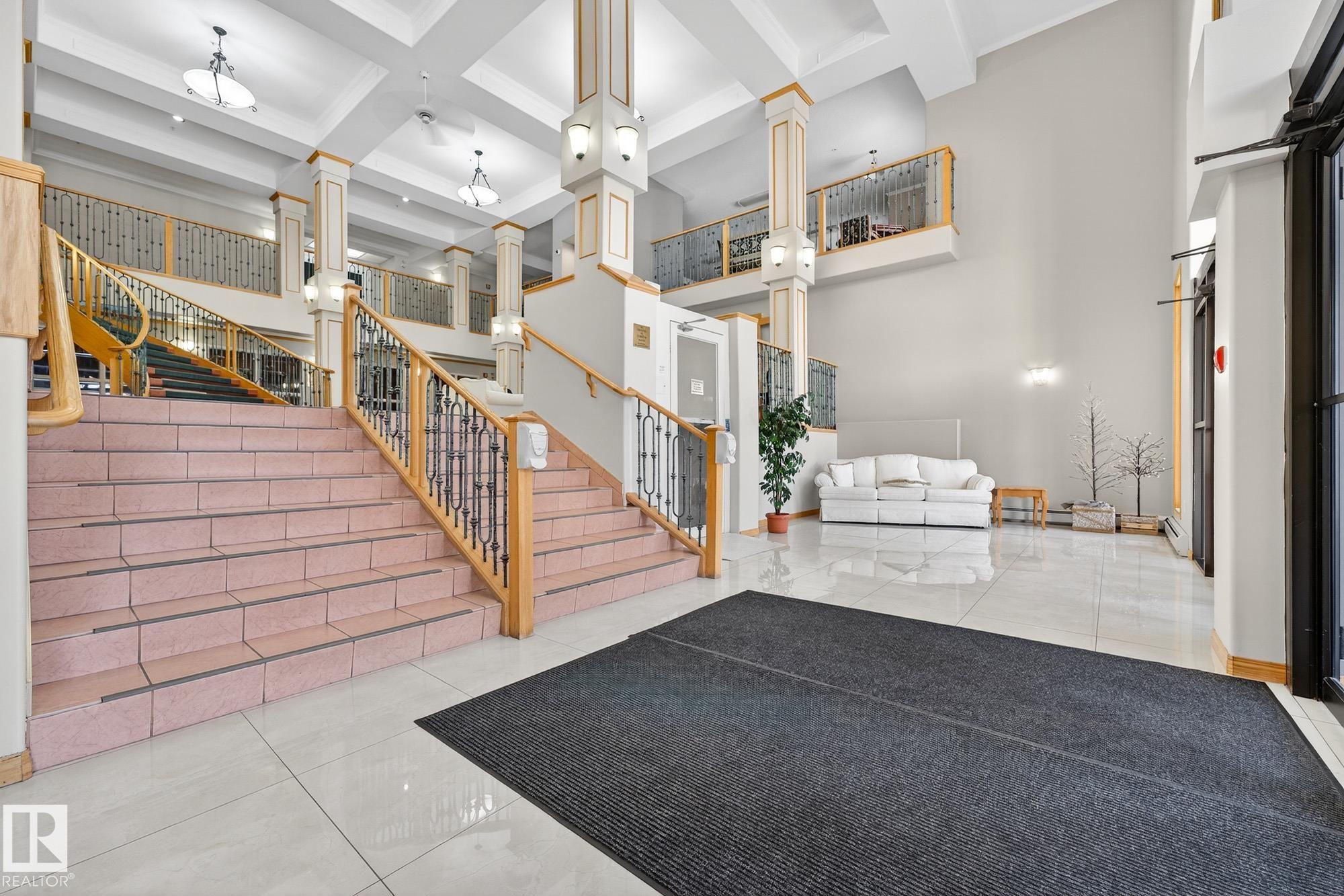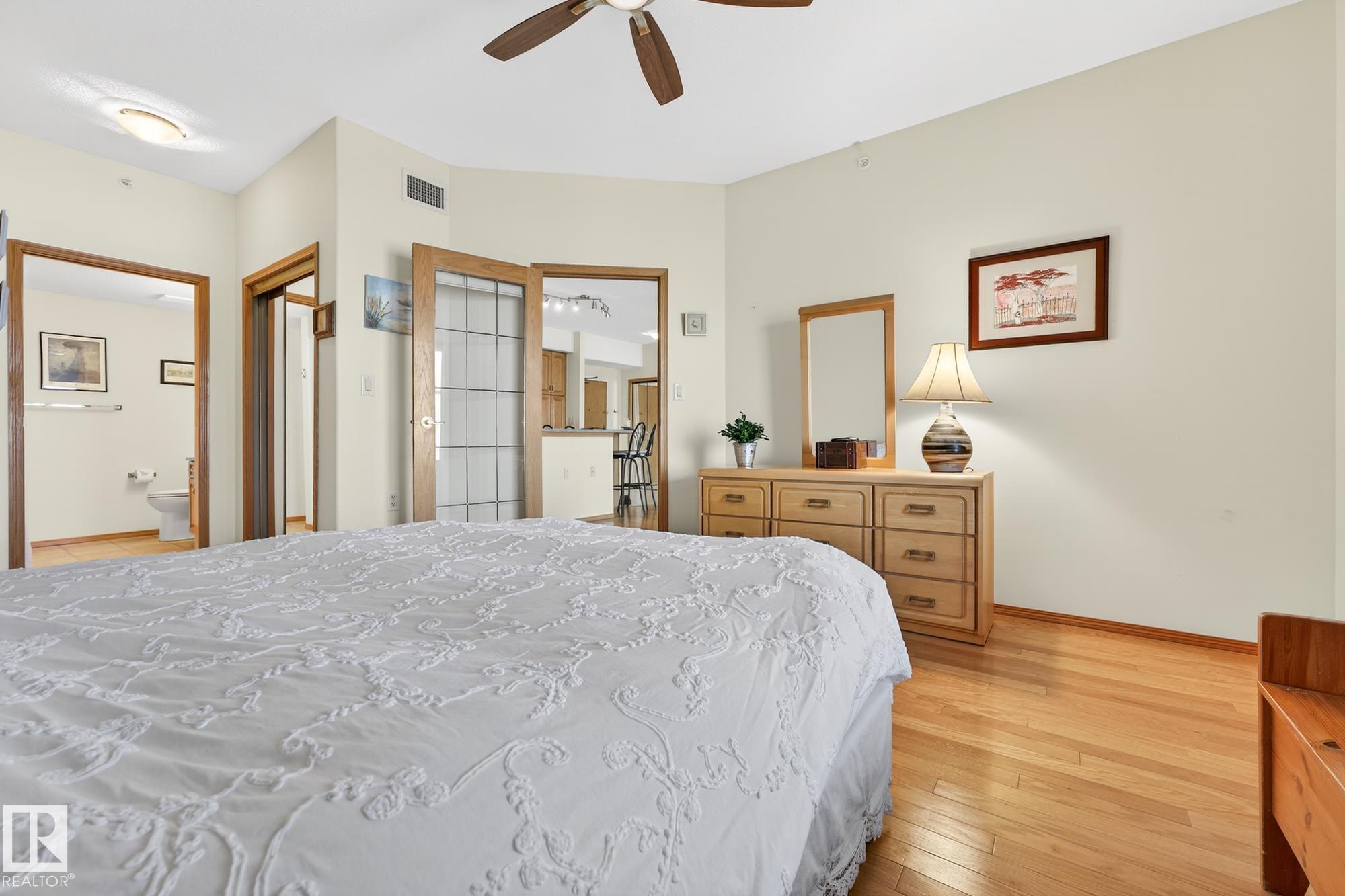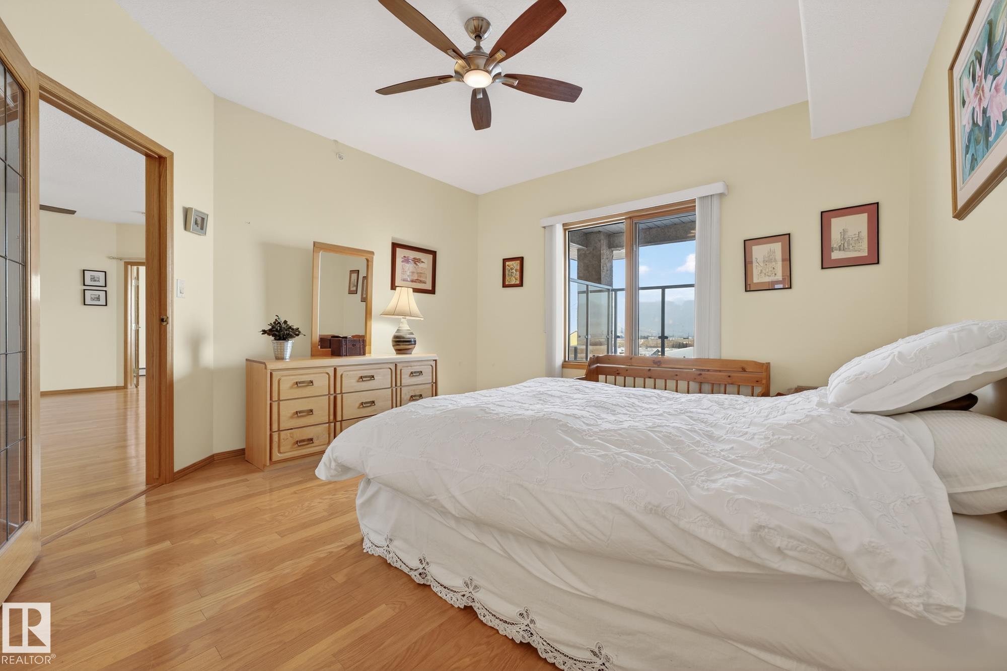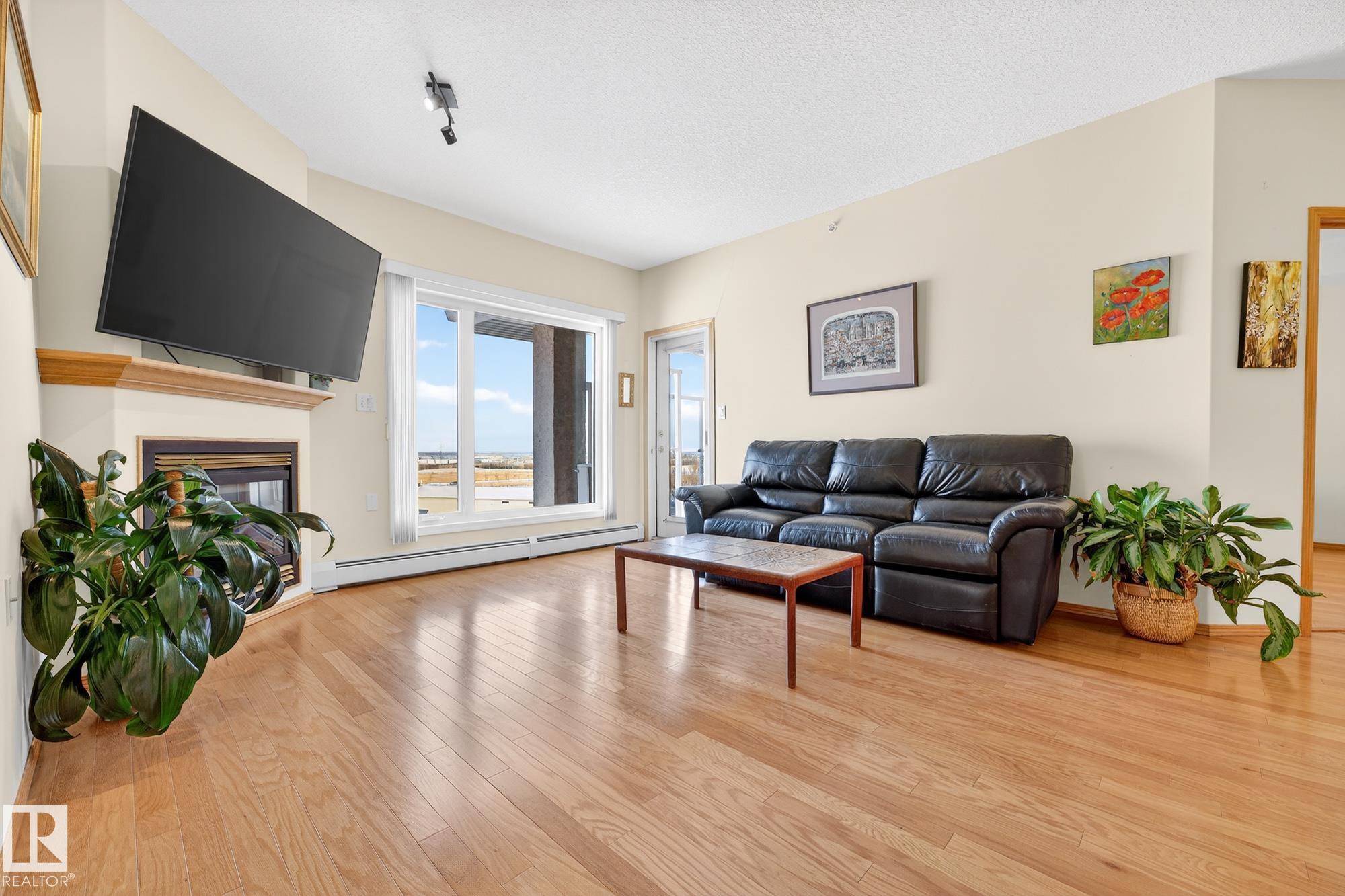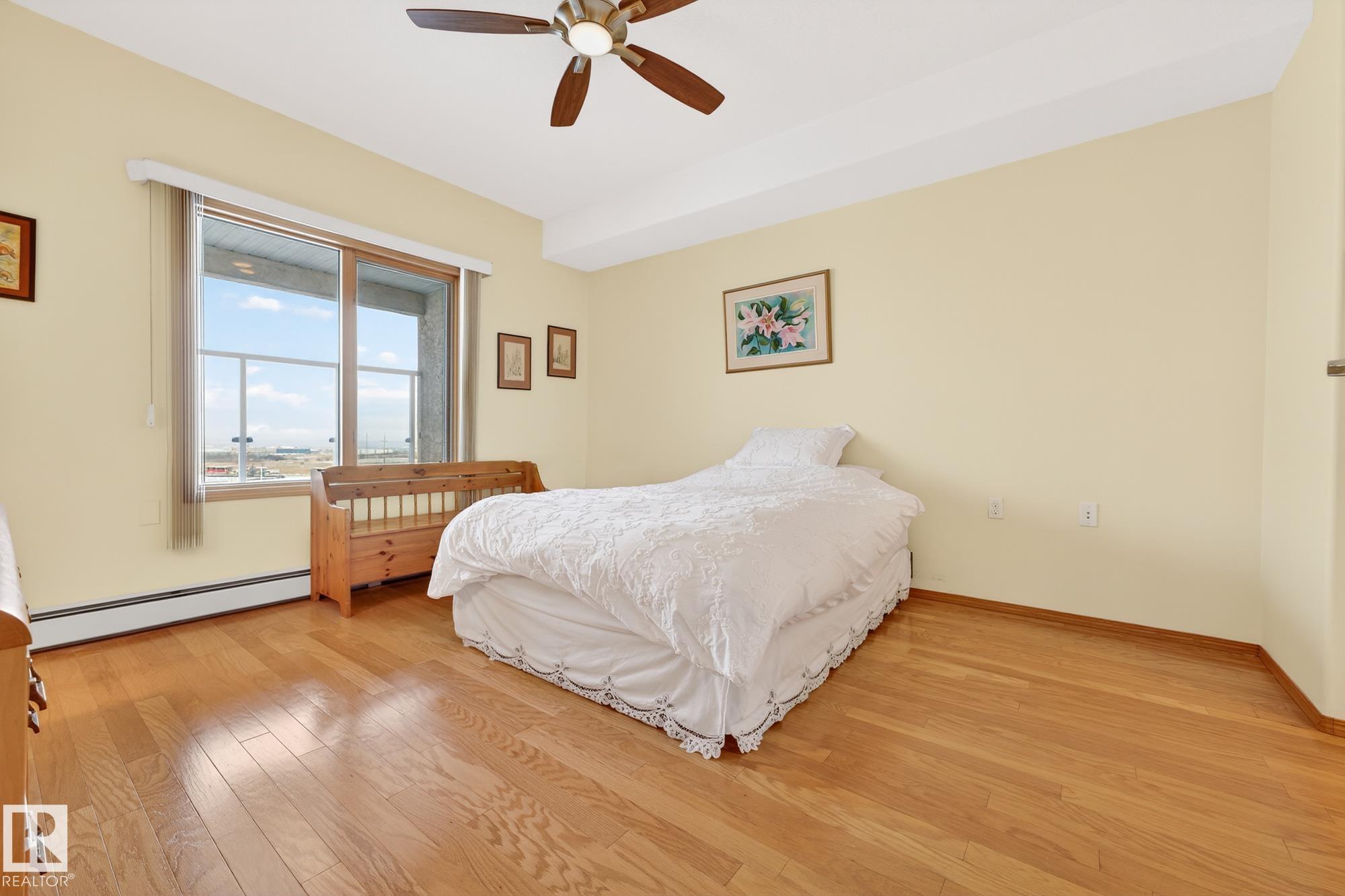 TOP FLOOR. END UNIT. 2 Bed + 2 Bath. This beautifully maintained home shows 10/10 and offers true maintenance-free living in one of the most desirable 55+ buildings around. With new 72" tall glass railings, 9? ceilings, hardwood and ceramic tile (no carpet), AC, and huge windows bringing in natural light, this is the quiet, elevated lifestyle you?ve been waiting for. The open kitchen features a newer microwave & dishwasher and the bright living area leads to a covered balcony with gas BBQ hookup. Bedrooms sit on opposite sides for privacy, including a generous primary with ensuite. Large well designed laundry room plus enjoy exceptional amenities: indoor pool//hot tub, gym, 2 games rooms, media room, craft & sewing rooms, woodworking shop, library, party room, and guest suites on every floor. A heated underground parkade offers a private enclosed storage room and car wash bay The perfect blend of comfort, community, and carefree living.