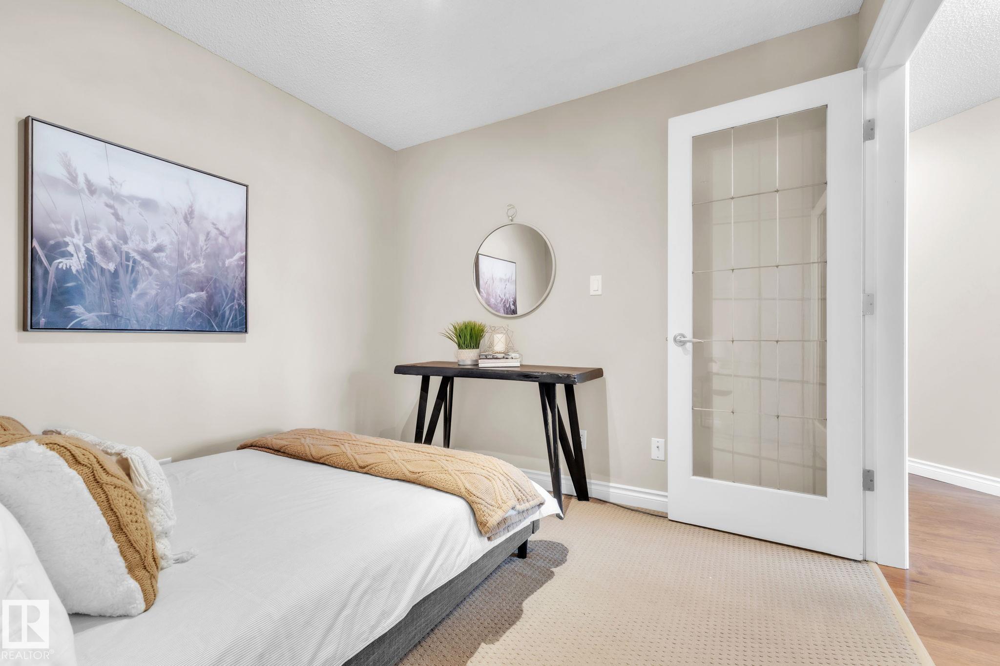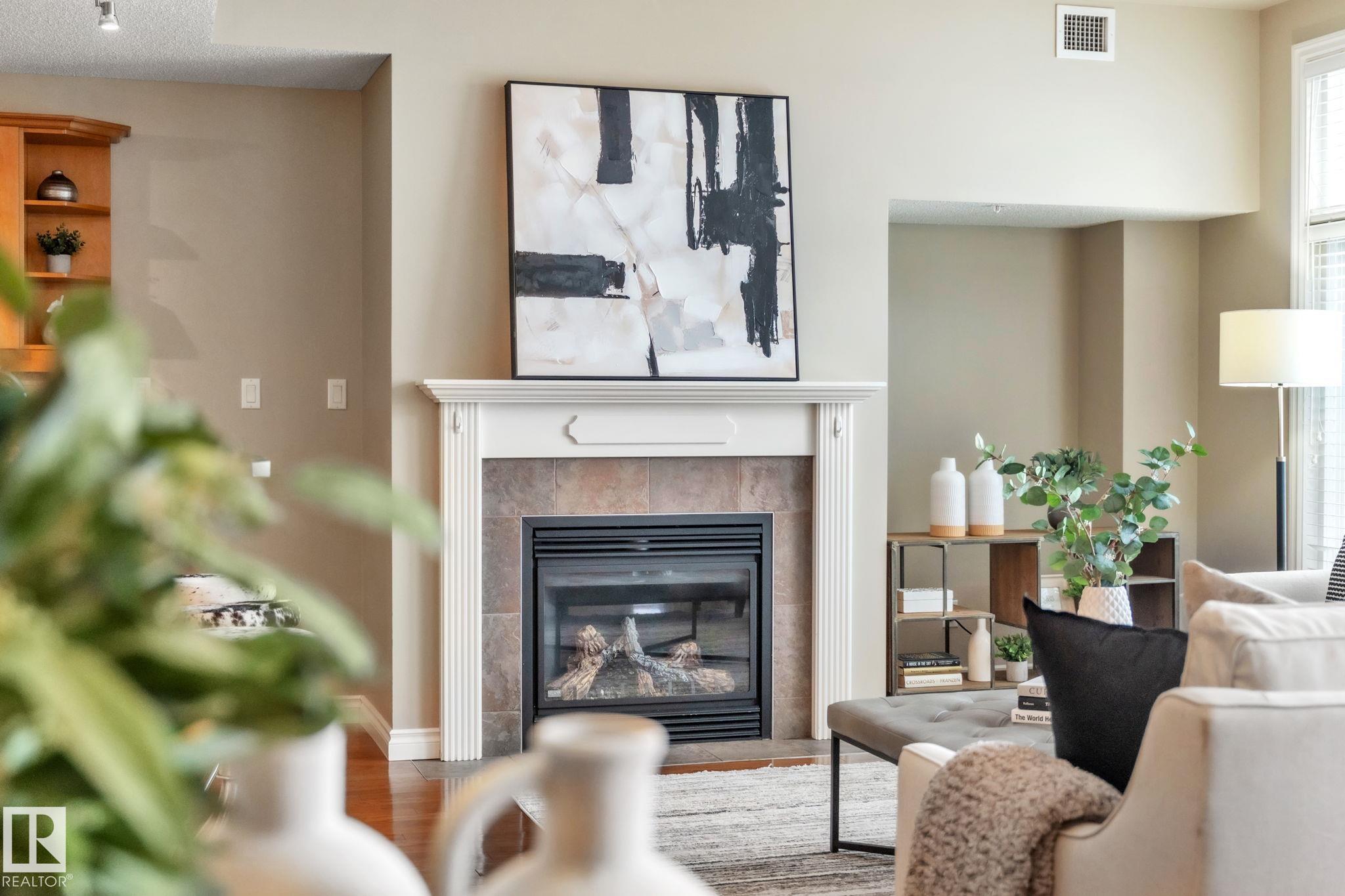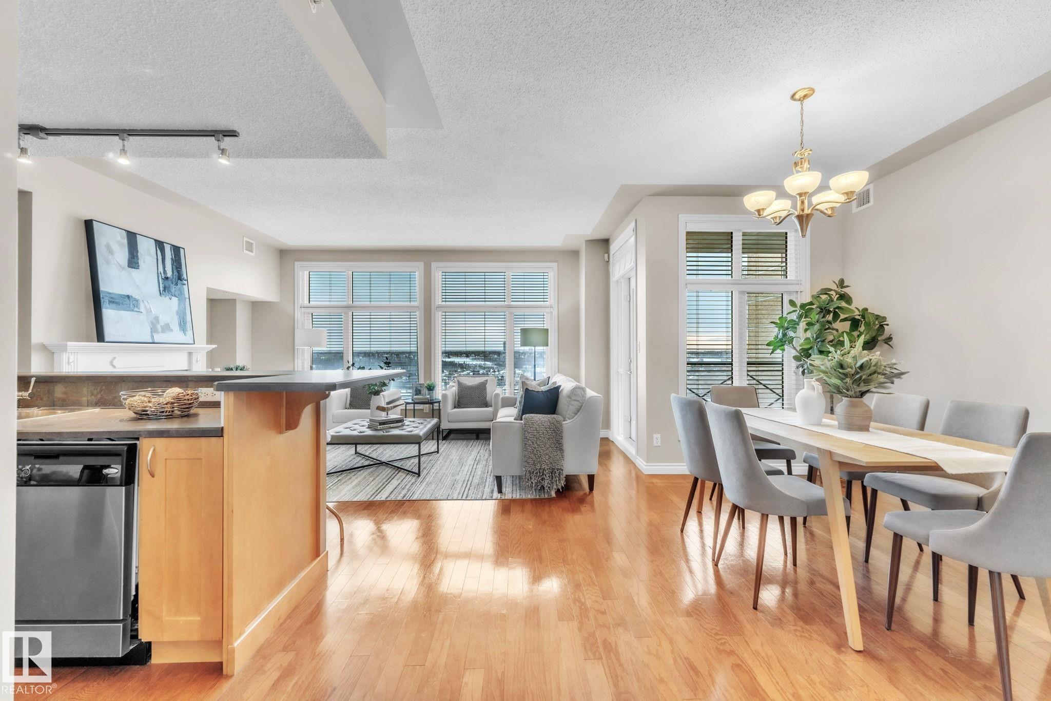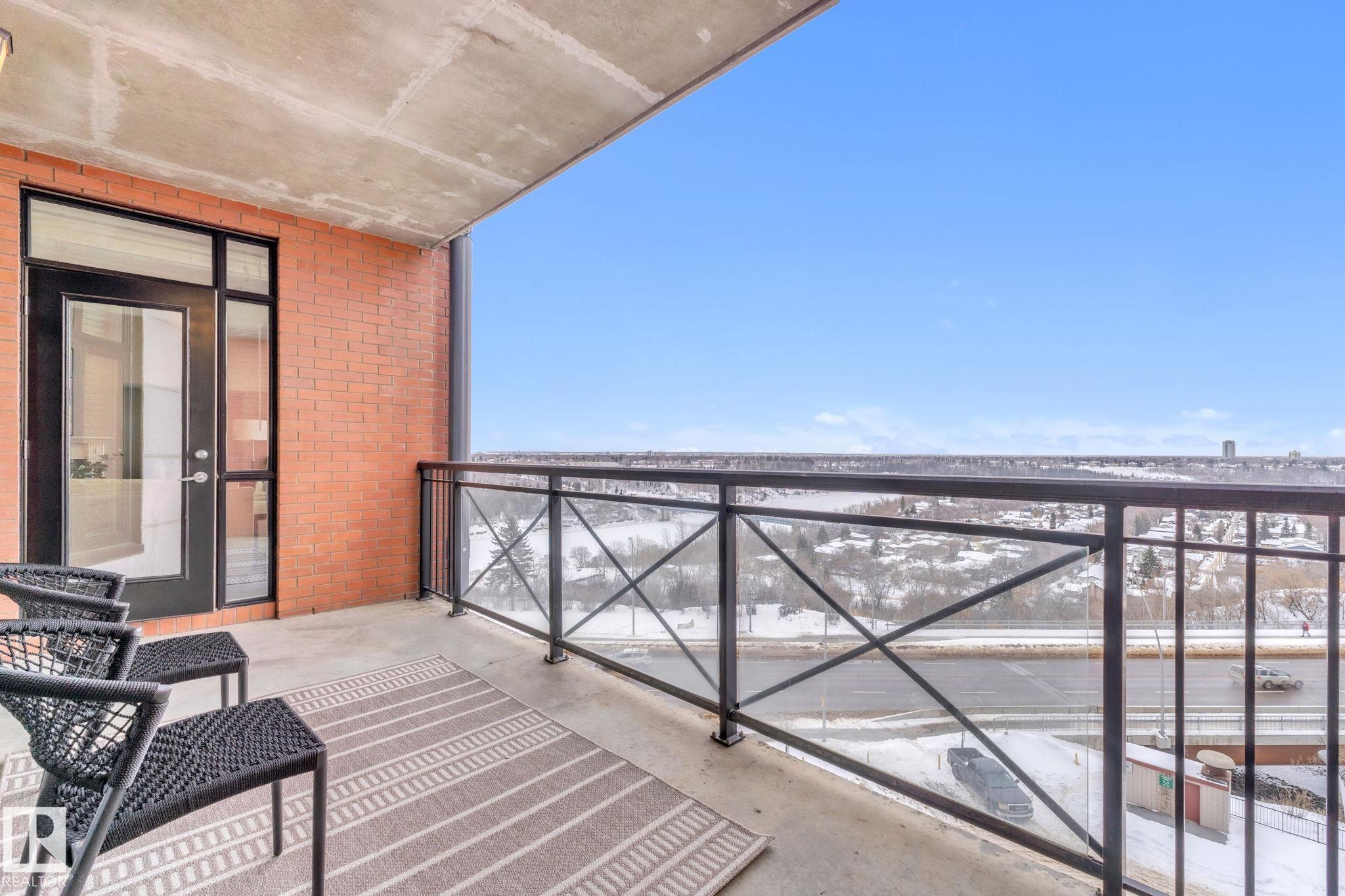 DOWNTOWN EDMONTON CONDO BOASTING SPECTACULAR RIVER VALLEY VIEWS & 2 PARKING STALLS! This 7th-floor, 1,164 sq. ft. condo features 1 bedroom + den, 2 full baths, and 2 side-by-side parking stalls (located on P2, 142 & 176), each with 2 large, lockable storage cages (252 & 253). Features include 9' ceilings, hardwood floors, NEW floor-to-ceiling energy-efficient TRIPLE PAIN WINDOWS, A/C, a gas fireplace, Hunter Douglas blinds, and a LARGE SOUTHEAST covered deck w/gas BBQ hookup that offers unrestricted views of the River Valley! Open kitchen with Maple cabinets and deluxe stainless-steel appliances. The master bedroom has patio doors, a 4-piece ensuite with a separate shower and a soaker tub, and a large walk-in closet. Double French doors lead to the den, which is ideal for an office or bedroom. Building amenities: an exercise room & a gated community. Condo Fees: heat+water+electricity. Perfect location for professionals who work Downtown, or retirees who enjoy dining, Rogers Place, and the Stadium.