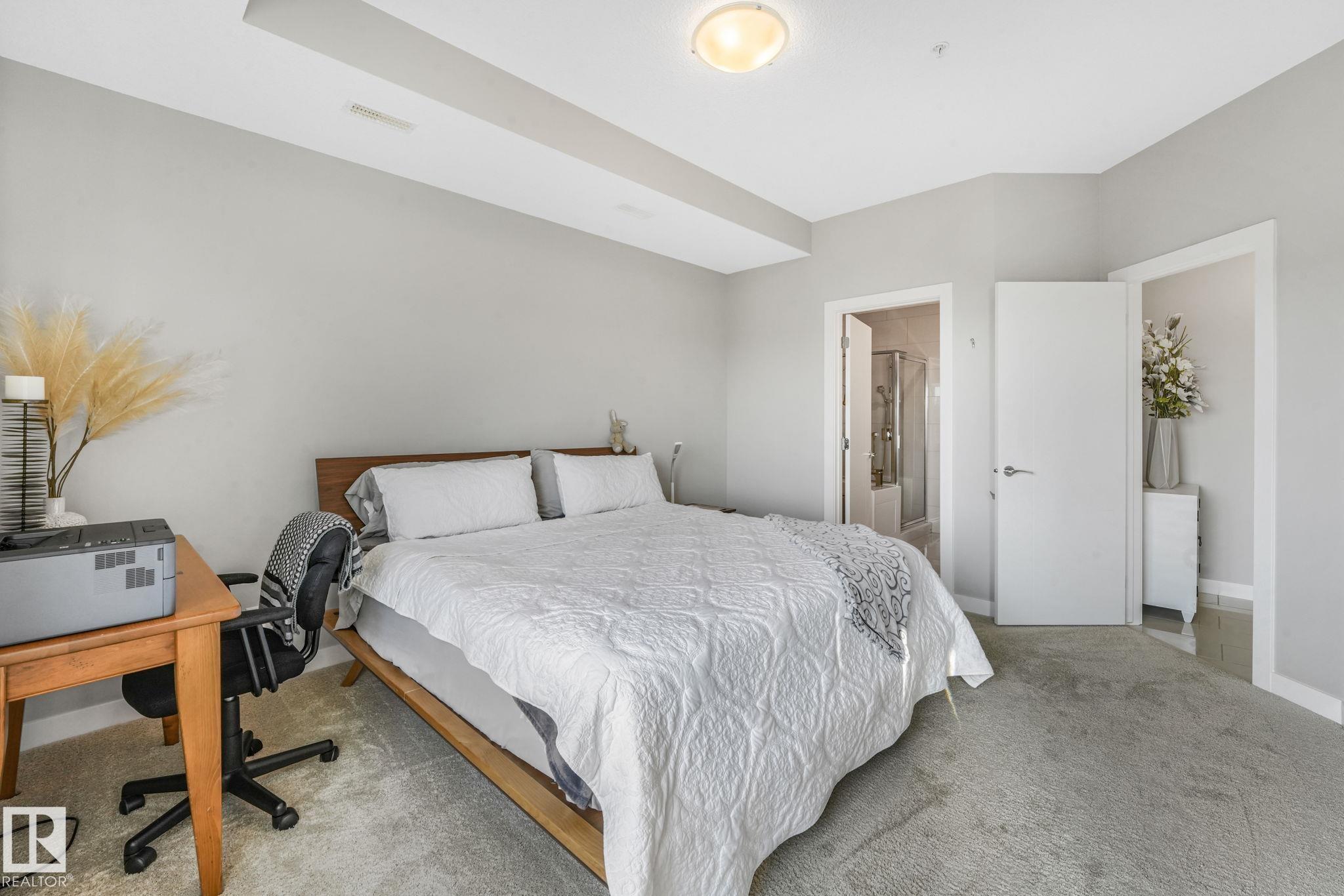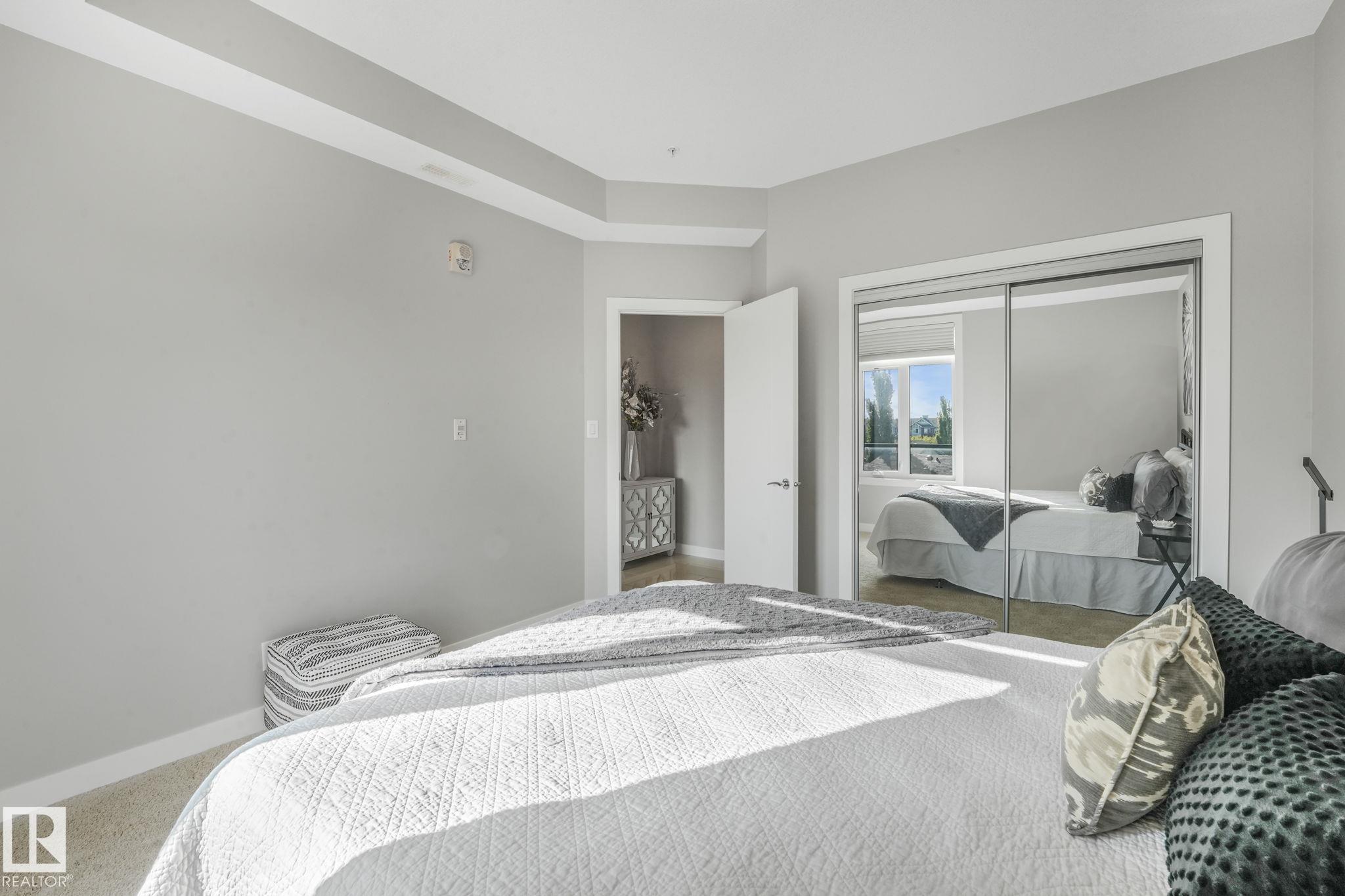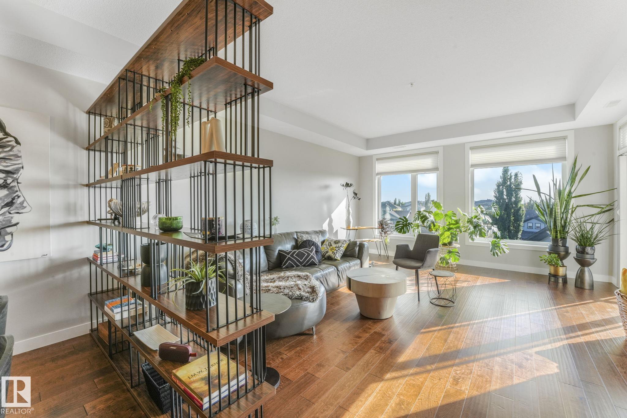 Just move in! Easy peaceful living at its best - it's the "little things" that make it a home. Drive up to the property and be impressed with lots of spacious visitor & handicapped parking. Marvel at the bountiful landscaping (this spring!), the quality sidewalks, foyer & elevators. This top floor beauty welcomes lots of sun all year long! Wow! Space & spaciousness and a fairly recent full paint! A classy great room is complemented by a feature divider to define without separating. Your plants will thrive. Sunny SW balcony is like 2 rooms - space for dining & sitting. Primary suite boasts space, privacy & an enviable ensuite with walk-in closet. 2nd bedroom is well placed and sized & a separate laundry room. U/G parking has a storage cage integrated w/parking spot-easy access. Short walk to Transit Centre,& Rec Centre. Great access to both Henday & Whitemud. Shopping is minutes away. Excellent Condo management, small pets w/approval. Your new best friends live there! Don't keep them waiting!