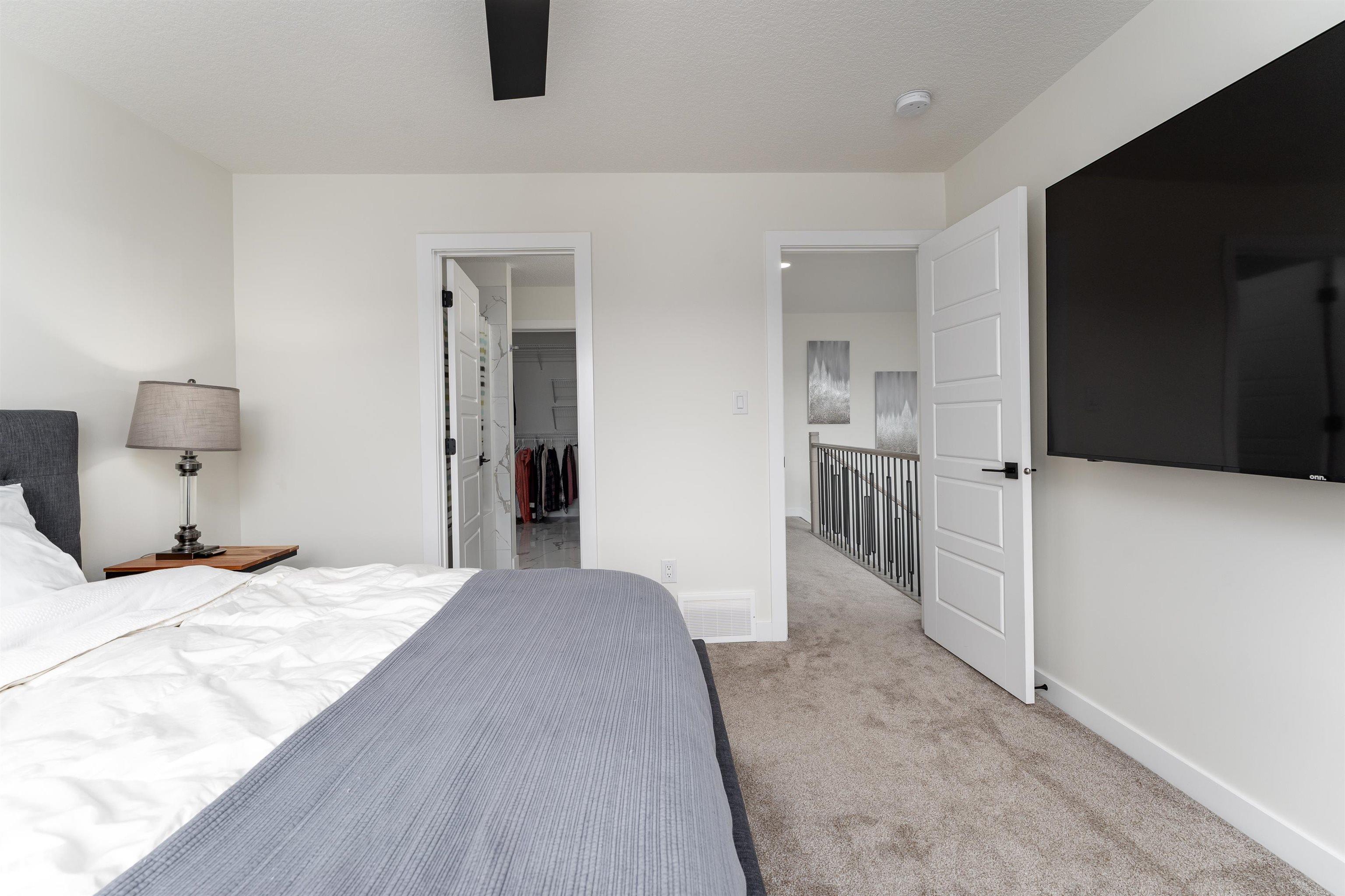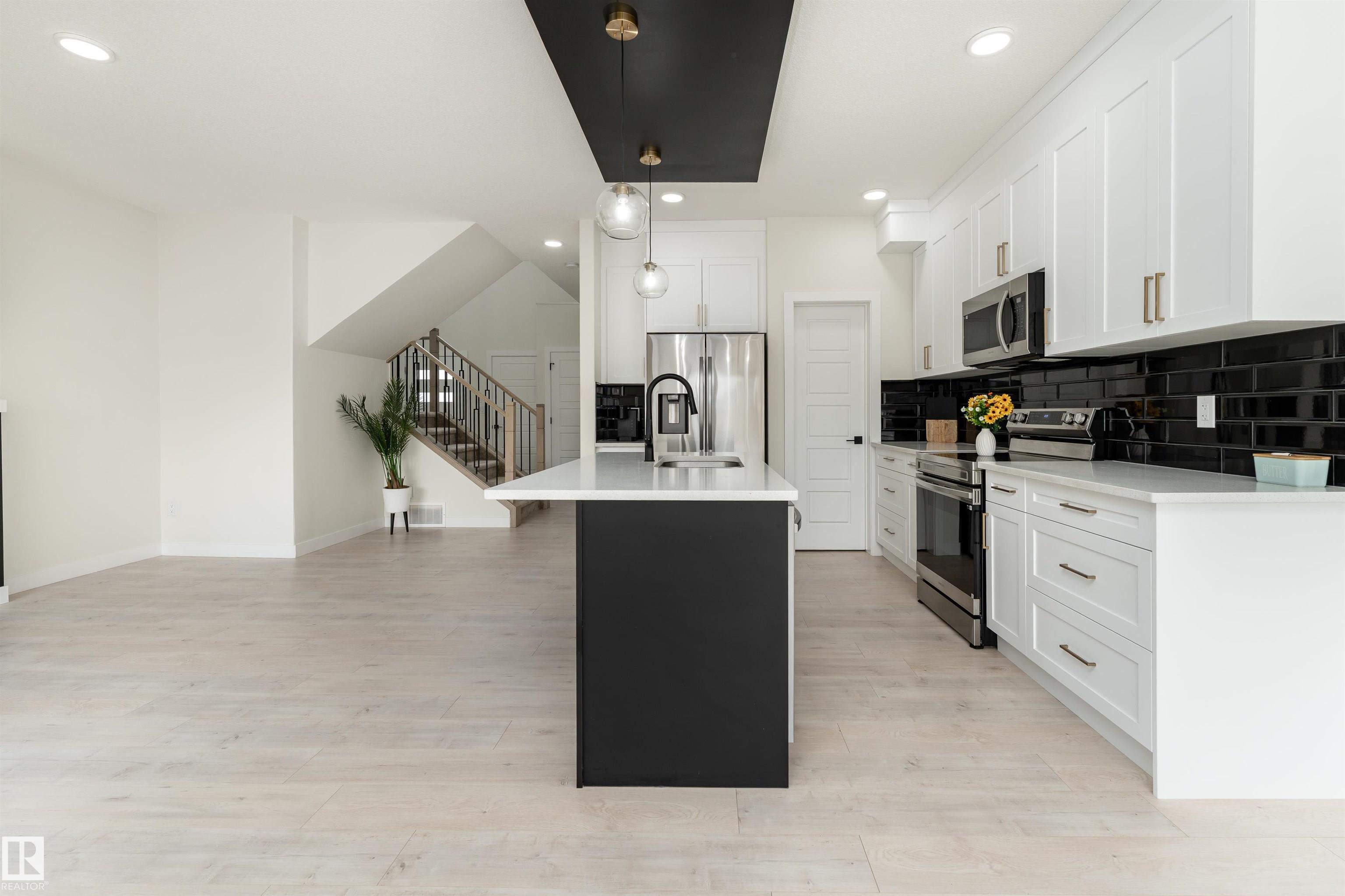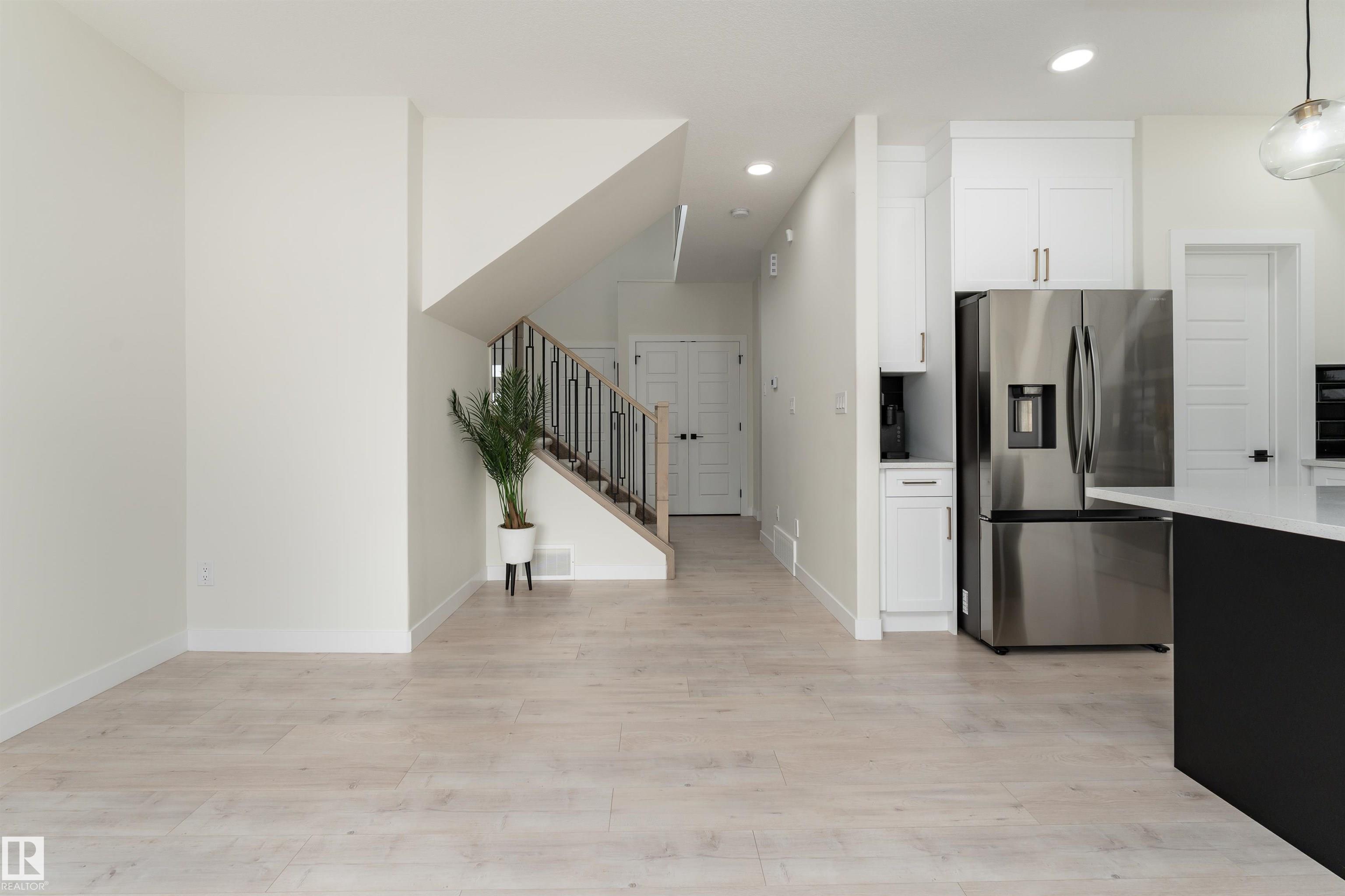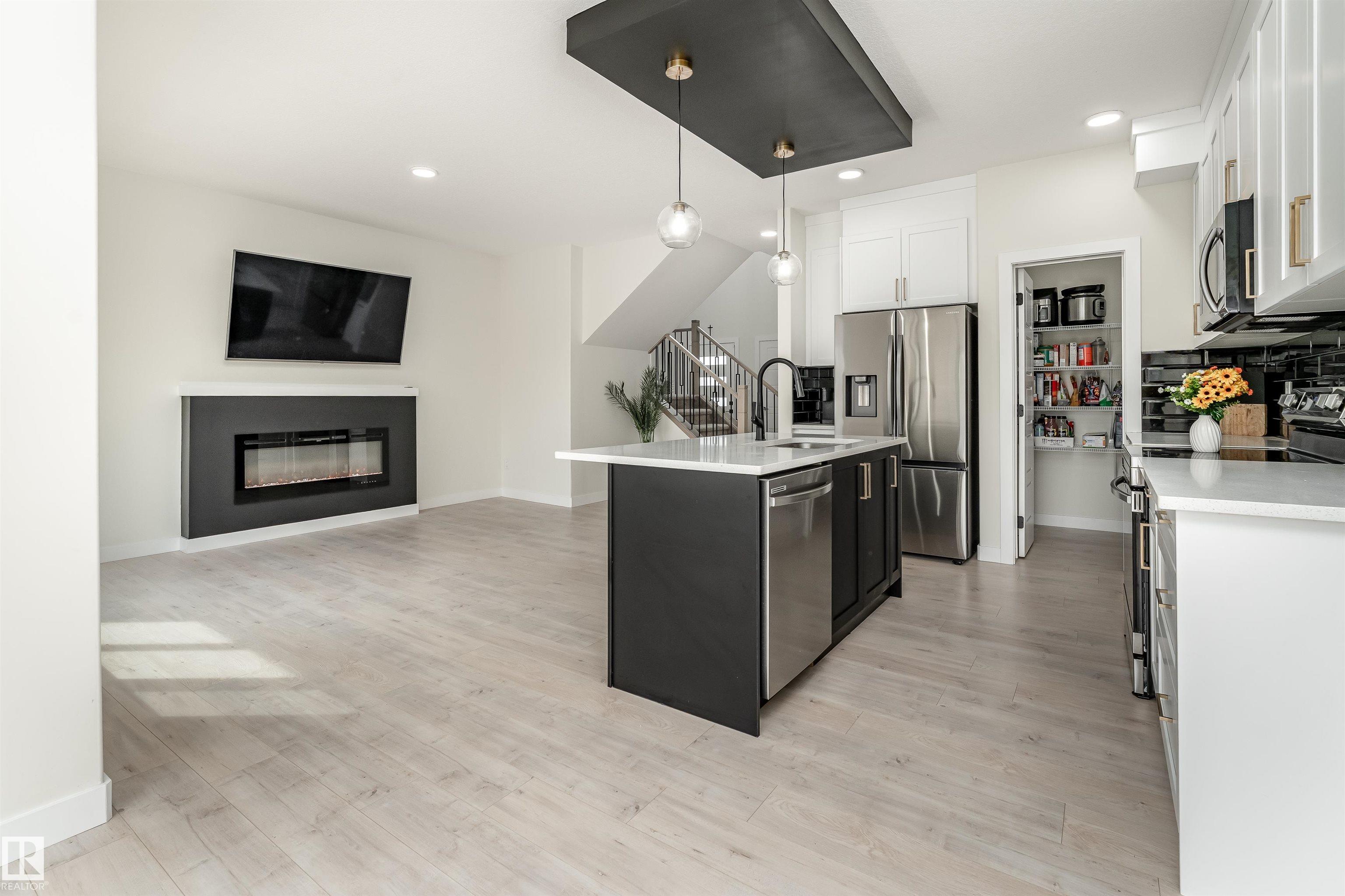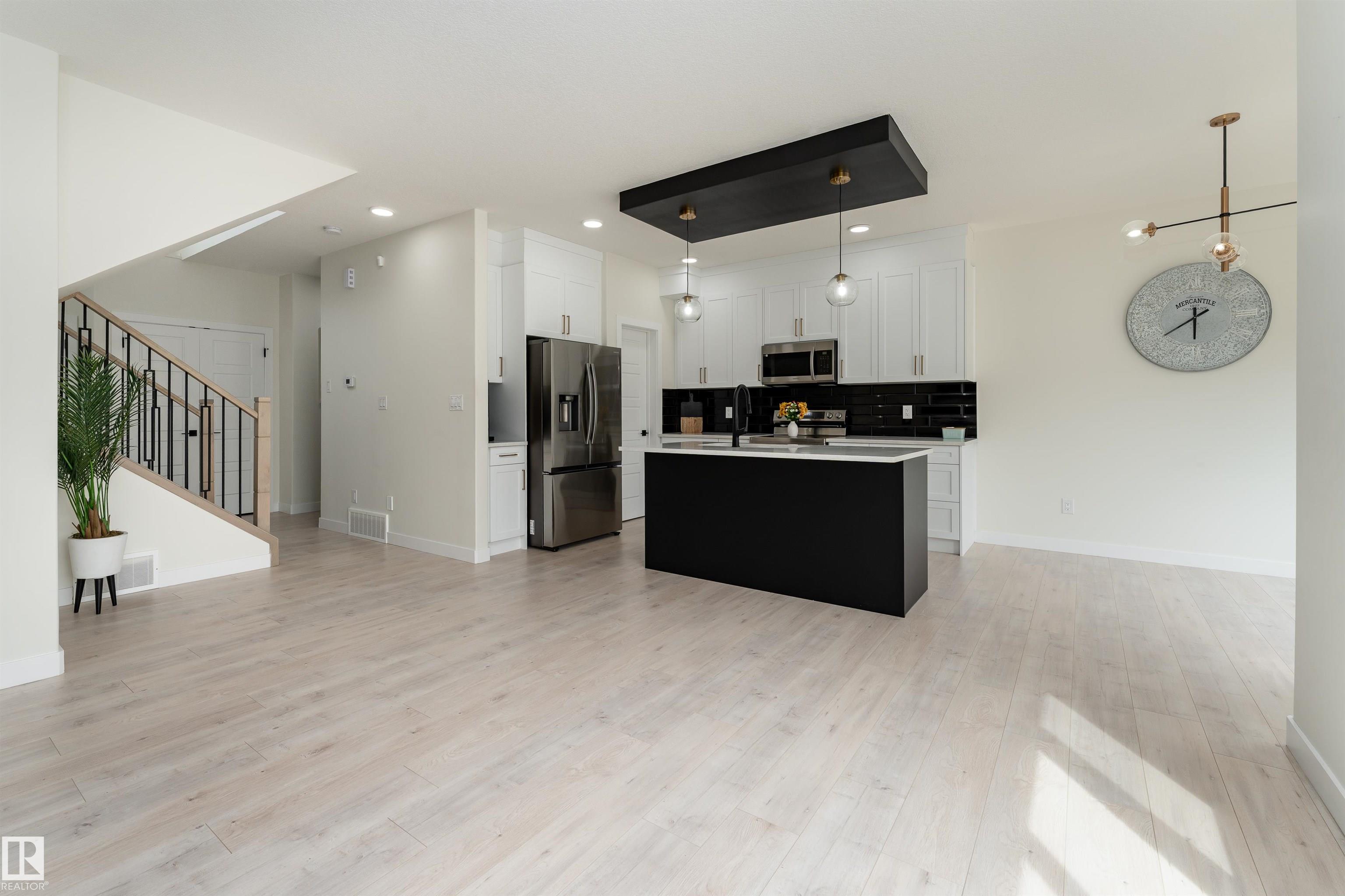 From the moment you walk in, this modern two storey home offers the space, layout, and features that truly stand out in Leduc. Offering 3 bedrooms and 3.5 bathrooms across 1,460 sq ft, the open main floor features 9 ft ceilings, large windows, and a modern kitchen with central island that flows into a cozy living area with an electric fireplace, ideal for everyday living and entertaining. Upstairs, the primary bedroom includes a walk in closet and 4 piece ensuite, along with 2 additional bedrooms, a full bath, and convenient upper level laundry. The well maintained yard is perfect for outdoor gatherings, complete with a gas line and space for a BBQ or fire table. An unfinished basement with a separate side entrance and full bathroom offers excellent potential for a future suite. Central A C, custom blinds, and a double attached garage complete the home. Conveniently located near major routes, schools, Century Mile Racetrack, Leduc Common shopping, and Pigeon Lake Park.