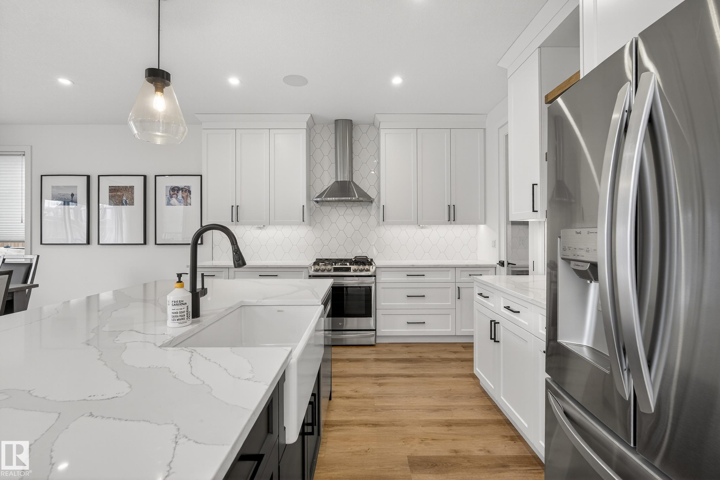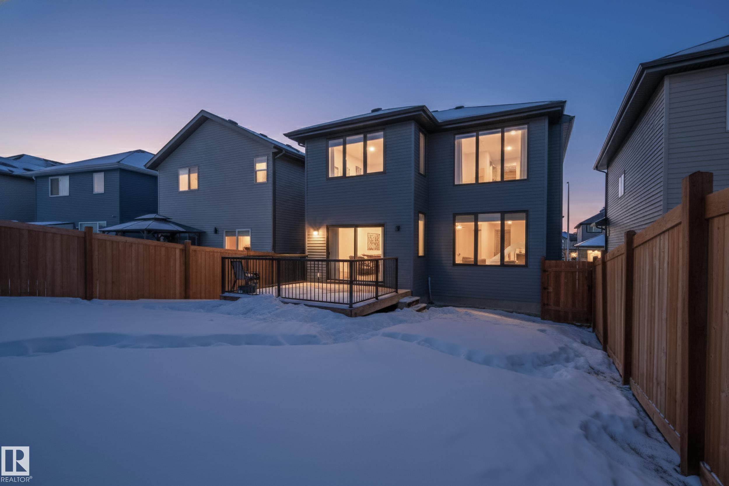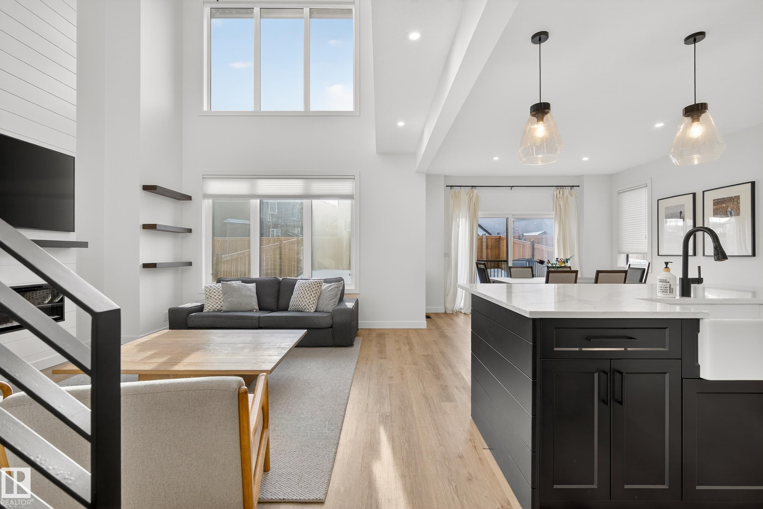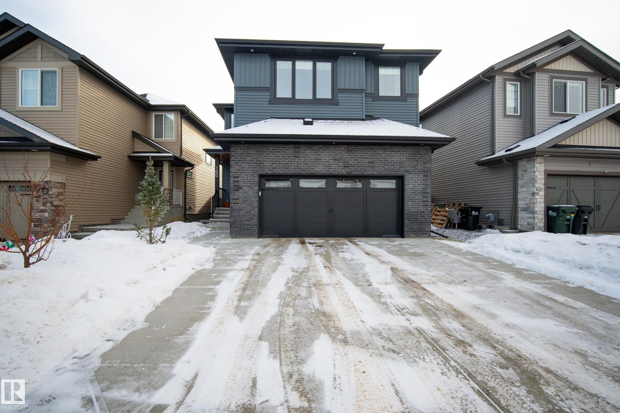 Located in the quiet community of Aspen Trails, this 2,100+ sq ft home offers 3 bedrooms and 2.5 bathrooms with a perfect mix of style and comfort. The main floor features an impressive open-concept layout with huge windows and a floor-to-ceiling shiplap fireplace. In the kitchen, crisp white cabinetry is paired with a bold navy-blue island, quartz countertops, and a designer tile backsplash. A modern staircase with black metal railings leads to the upper level, which includes a versatile bonus space and a spacious primary retreat. The ensuite is a standout, featuring patterned artisan tile, a freestanding soaking tub, and a dual vanity. Outside, the oversized rear deck and fully fenced backyard are perfect for summer entertaining. This home provides a unique, custom feel in a prime family-oriented neighborhood within walking distance to Archbishop Jordan High School and just minutes from Emerald Hills shopping, Millennium Place, and the area's extensive park and trail system.