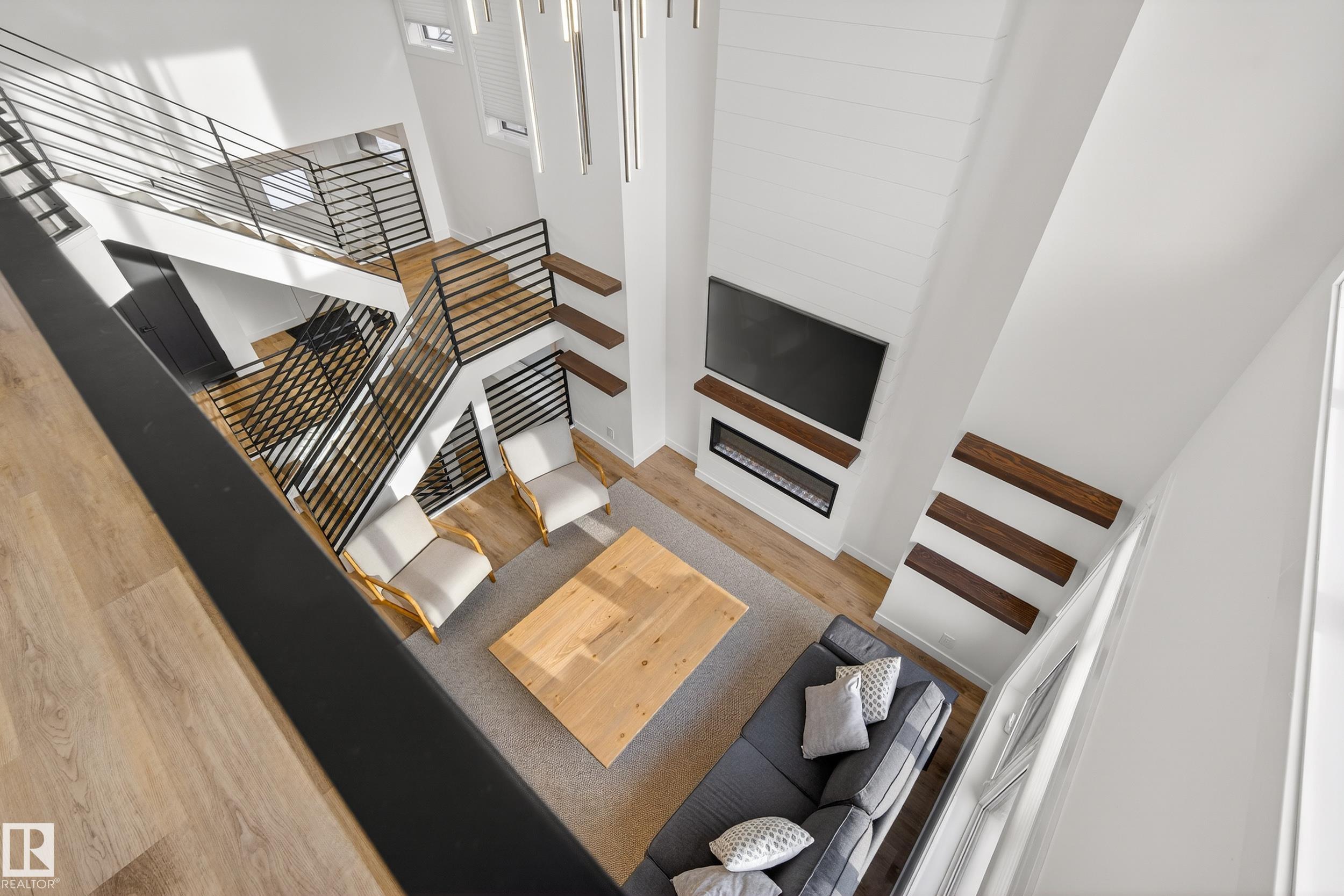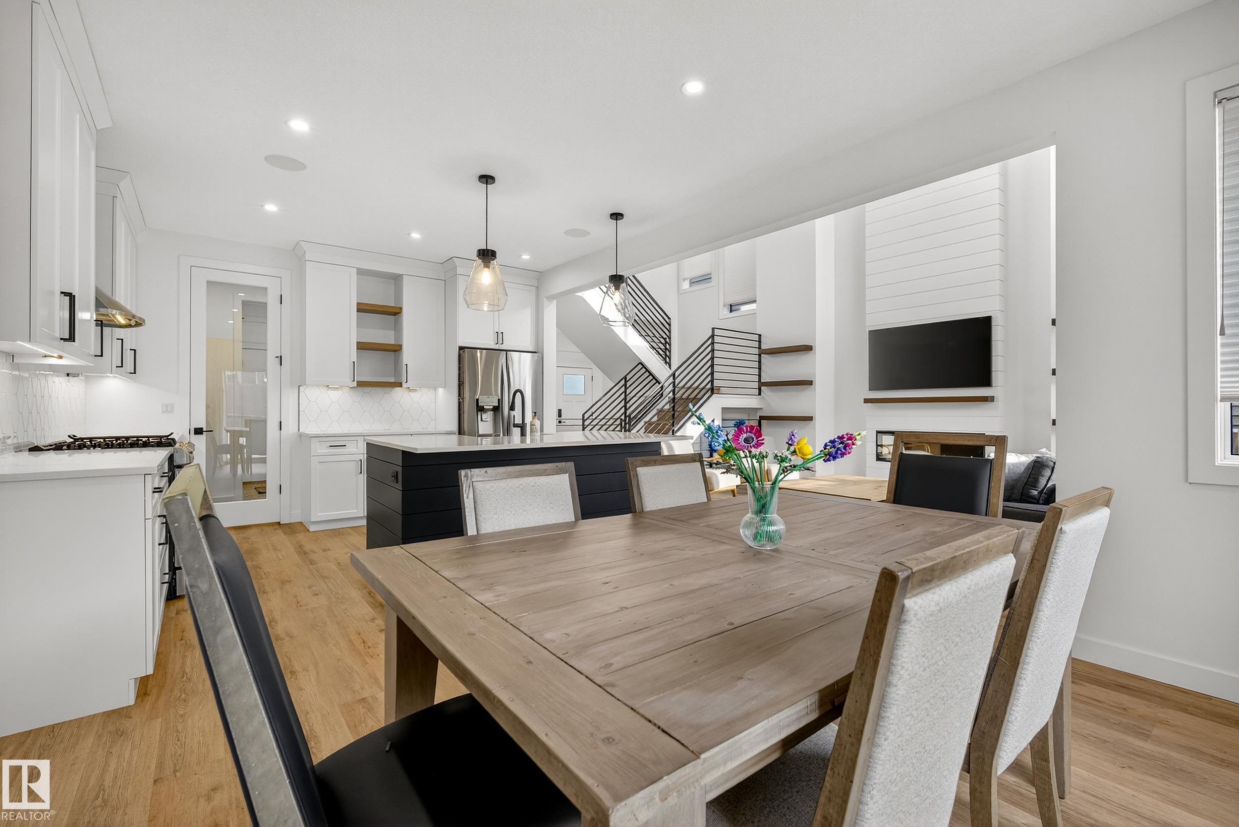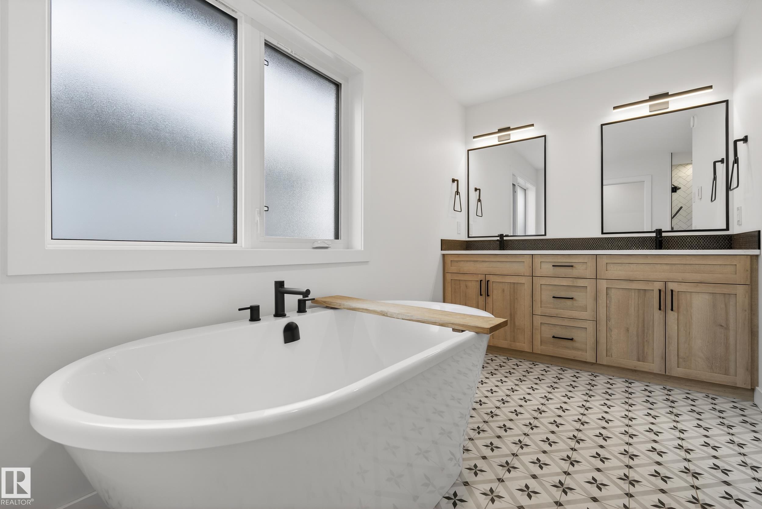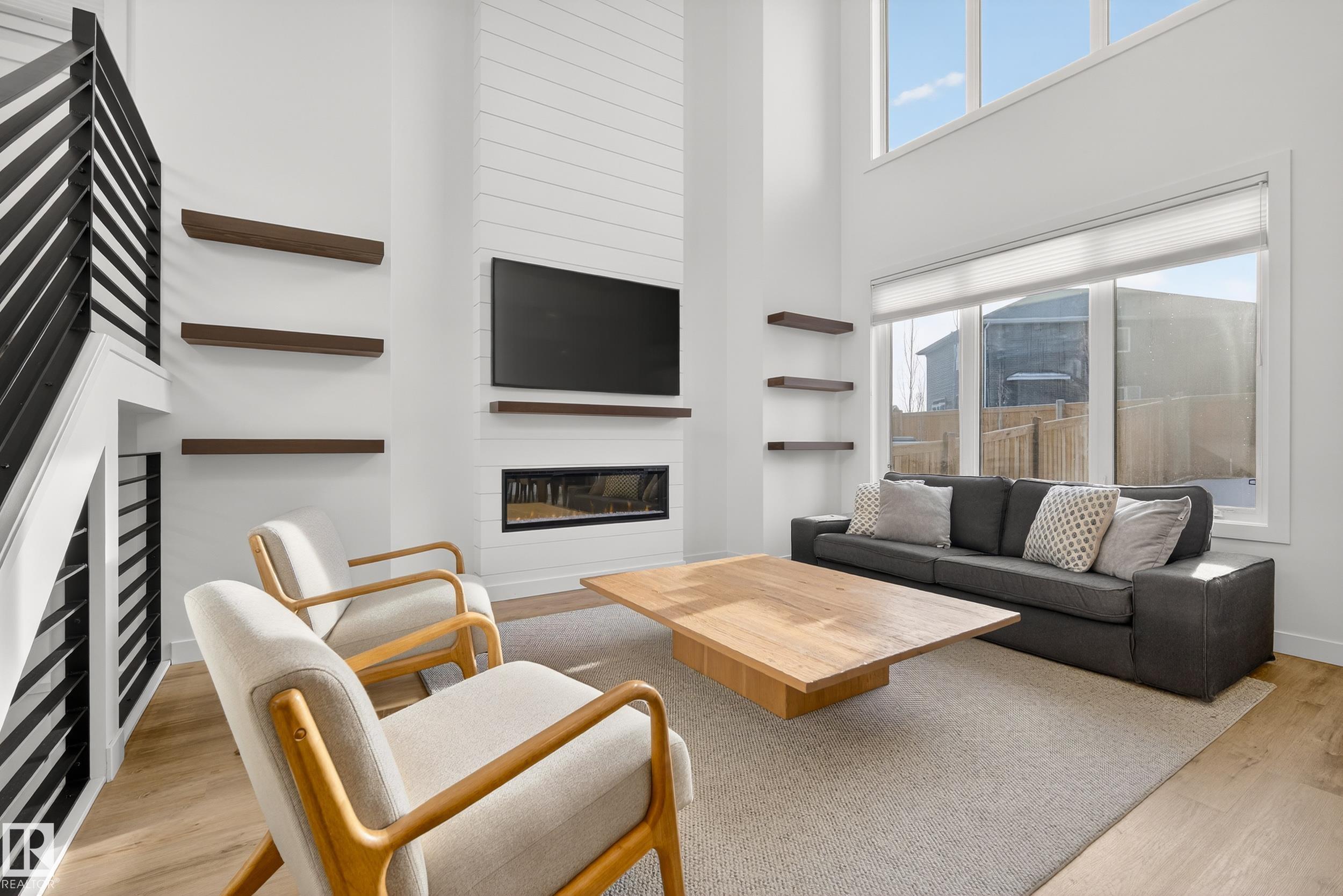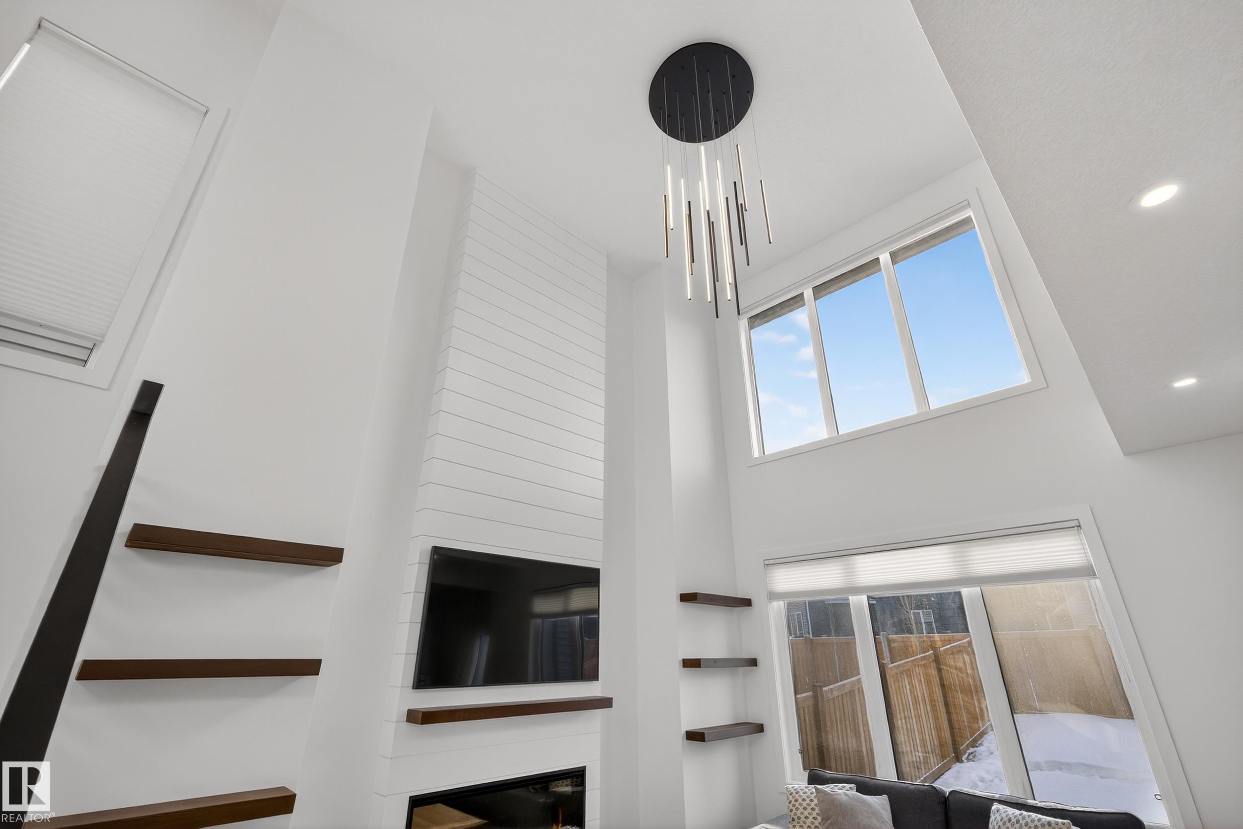 Located in the quiet community of Aspen Trails, this 2,100+ sq ft home offers 3 bedrooms and 2.5 bathrooms with a perfect mix of style and comfort. The main floor features an impressive open-concept layout with huge windows and a floor-to-ceiling shiplap fireplace. In the kitchen, crisp white cabinetry is paired with a bold navy-blue island, quartz countertops, and a designer tile backsplash. A modern staircase with black metal railings leads to the upper level, which includes a versatile bonus space and a spacious primary retreat. The ensuite is a standout, featuring patterned artisan tile, a freestanding soaking tub, and a dual vanity. Outside, the oversized rear deck and fully fenced backyard are perfect for summer entertaining. This home provides a unique, custom feel in a prime family-oriented neighborhood within walking distance to Archbishop Jordan High School and just minutes from Emerald Hills shopping, Millennium Place, and the area's extensive park and trail system.