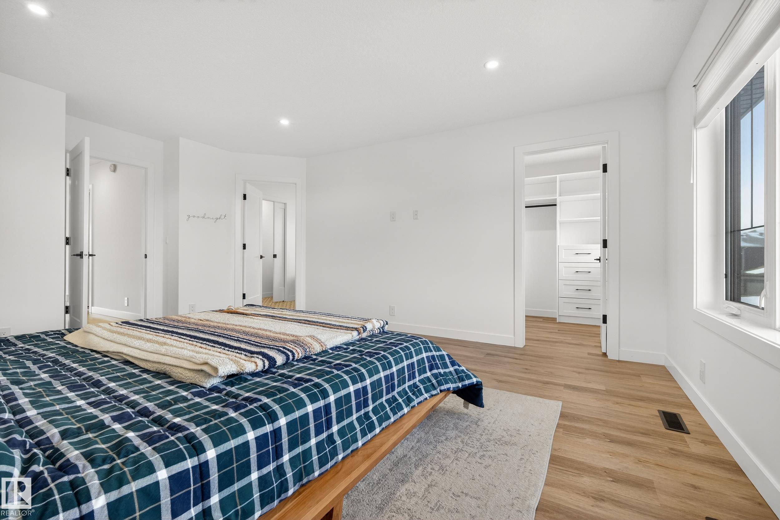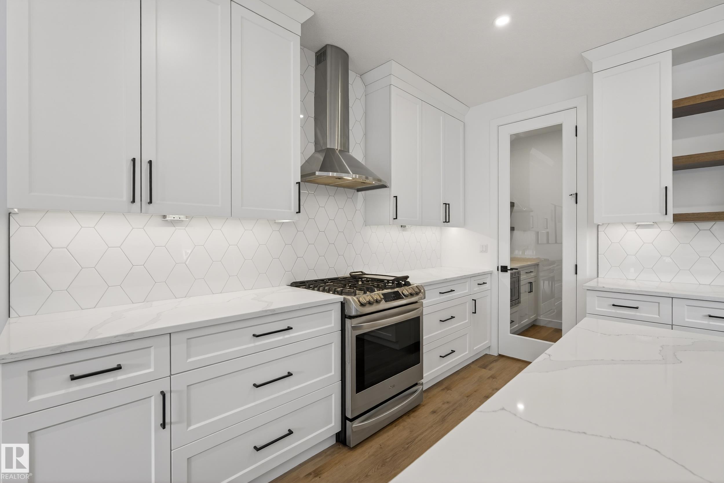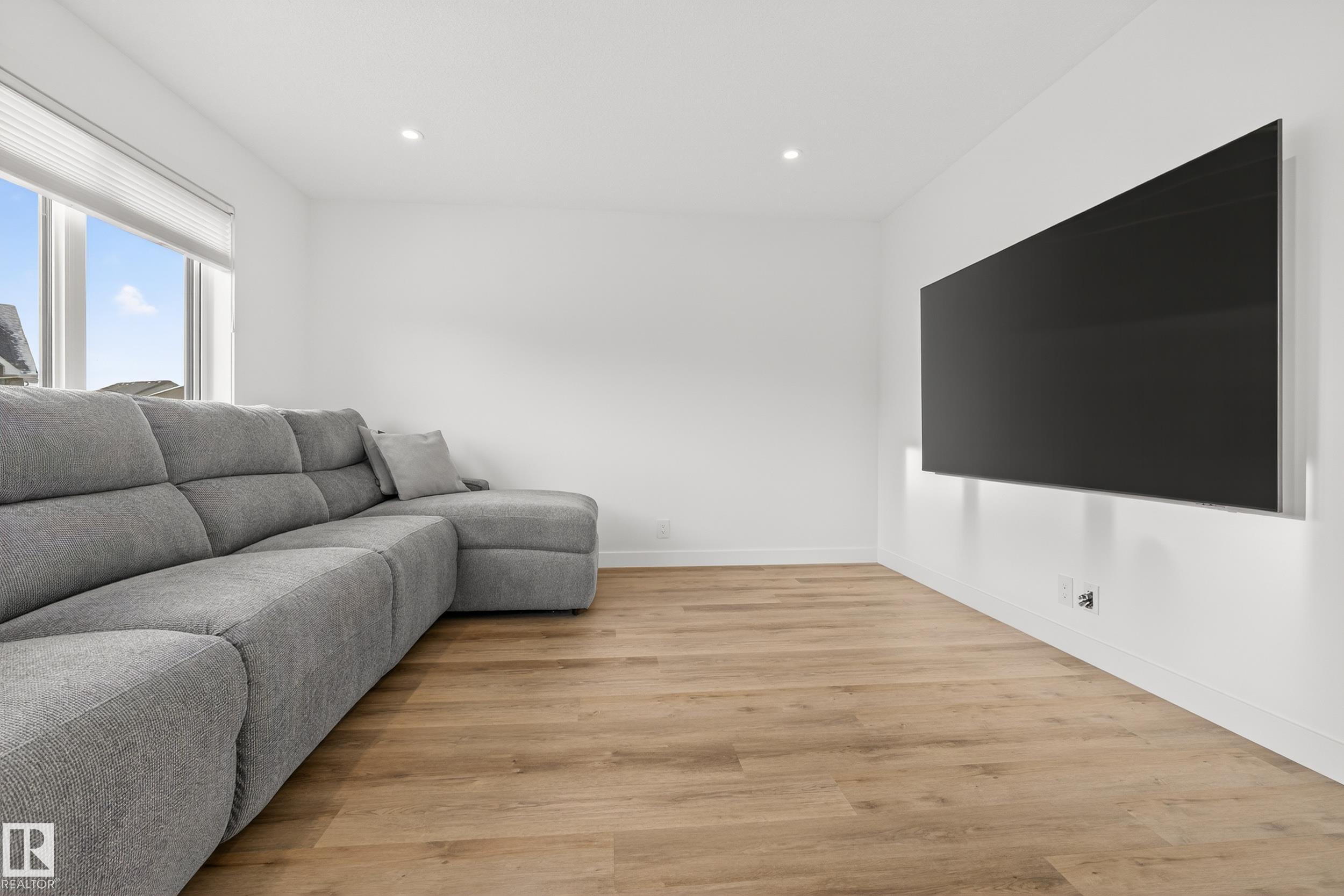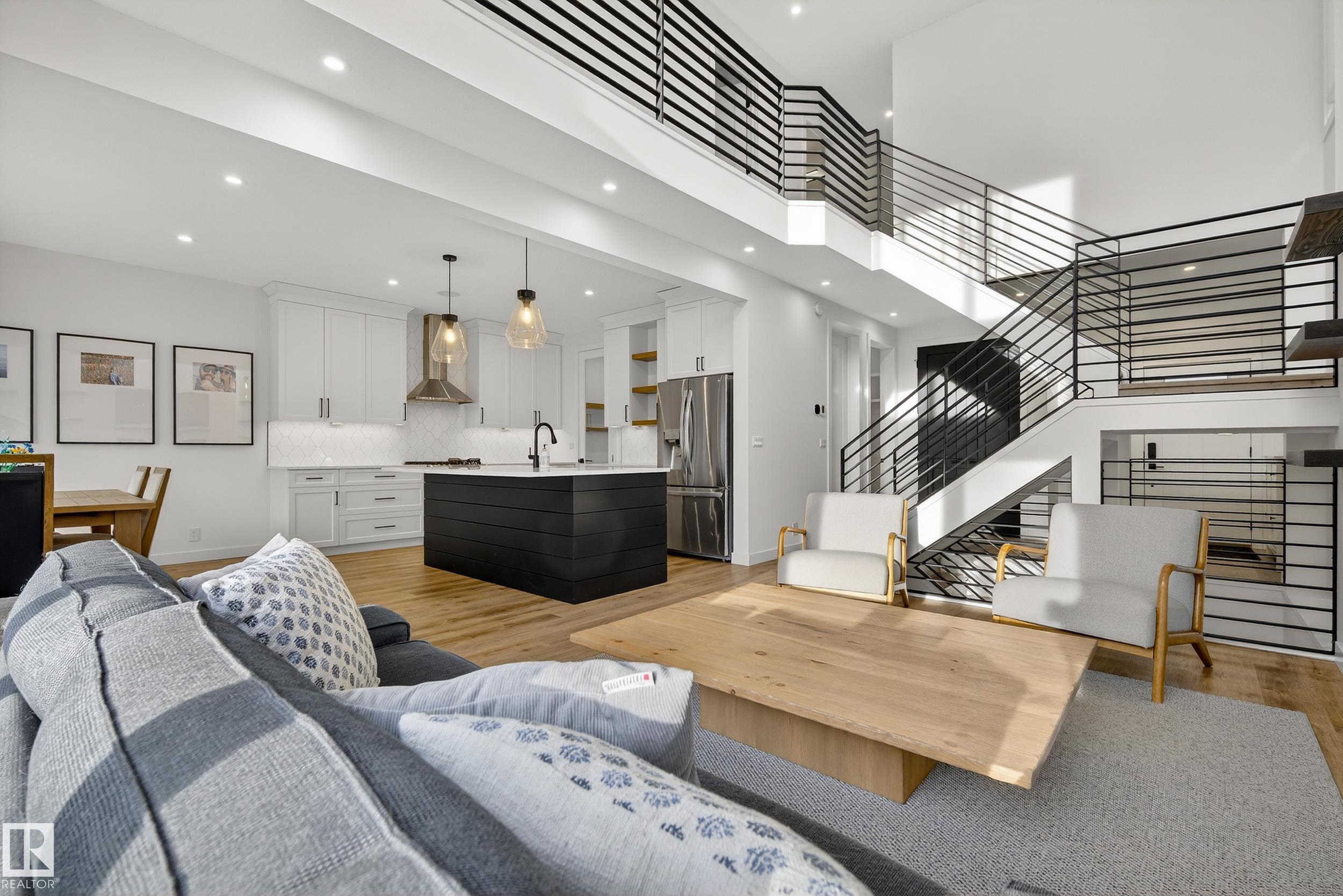 Located in the quiet community of Aspen Trails, this 2,100+ sq ft home offers 3 bedrooms and 2.5 bathrooms with a perfect mix of style and comfort. The main floor features an impressive open-concept layout with huge windows and a floor-to-ceiling shiplap fireplace. In the kitchen, crisp white cabinetry is paired with a bold navy-blue island, quartz countertops, and a designer tile backsplash. A modern staircase with black metal railings leads to the upper level, which includes a versatile bonus space and a spacious primary retreat. The ensuite is a standout, featuring patterned artisan tile, a freestanding soaking tub, and a dual vanity. Outside, the oversized rear deck and fully fenced backyard are perfect for summer entertaining. This home provides a unique, custom feel in a prime family-oriented neighborhood within walking distance to Archbishop Jordan High School and just minutes from Emerald Hills shopping, Millennium Place, and the area's extensive park and trail system.
