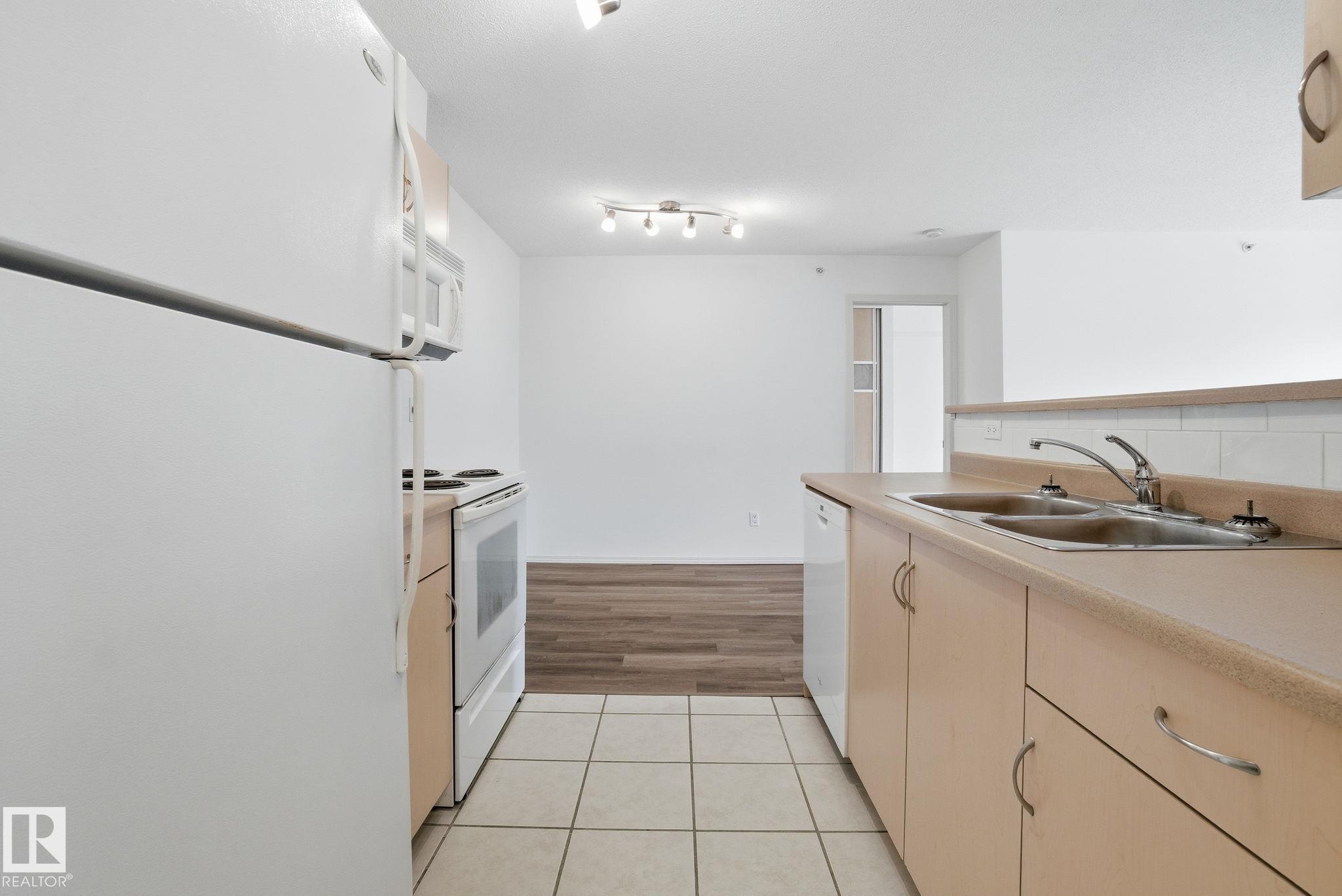 RARE FIND: TWO heated, underground titled parking stalls included! Top-floor 2 bedroom, 2 bathroom condo in the desirable Callingwood community. Open-concept layout with tiled entry, breakfast bar, and a spacious living area featuring an electric fireplace. Primary bedroom includes a 4-piece ensuite, with a second bedroom and 3-piece bathroom on the opposite side for added privacy. Large laundry room with extra storage. Enjoy a quiet west-facing balcony overlooking the back of the complex, not a parking lot. Walking distance to shopping, library, and recreation facilities.