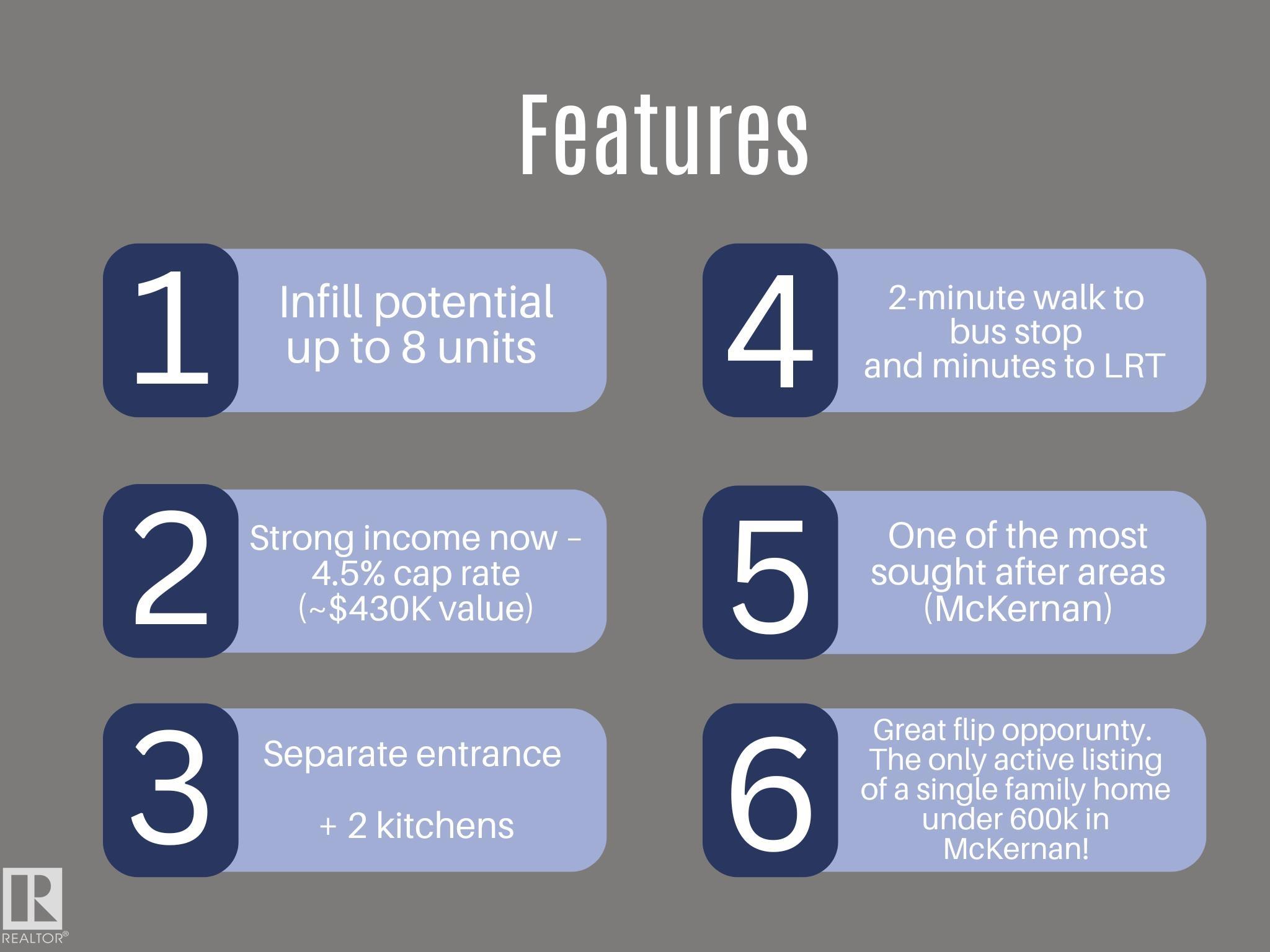 ONLY ACTIVE LISTING OF A SINGLE FAMILY HOME IN MCKERNAN UNDER 600K. Great opportunity to acquire a renovation project with future infill potential (up to 8 units). The home features kitchens both upstairs and downstairs. It is situated on a 42.5 x 130.5 ft lot (513 mē), just a 2-minute walk to a bus stop and only minutes from the LRT, the University of Alberta, and Whyte Avenue. The main floor offers 1 large bedroom and 1 den/dining room that can be converted into a second bedroom. Dining room was previously a bedroom. There is also an L-shaped kitchen and a 3-piece bathroom. The basement has a separate entrance and includes a large family room, kitchen area, 1 bedroom, and 2 bathrooms (one requires updating). Excellent investment opportunity and future redevelopment upside. Rough plans for a 6-unit development can be provided.