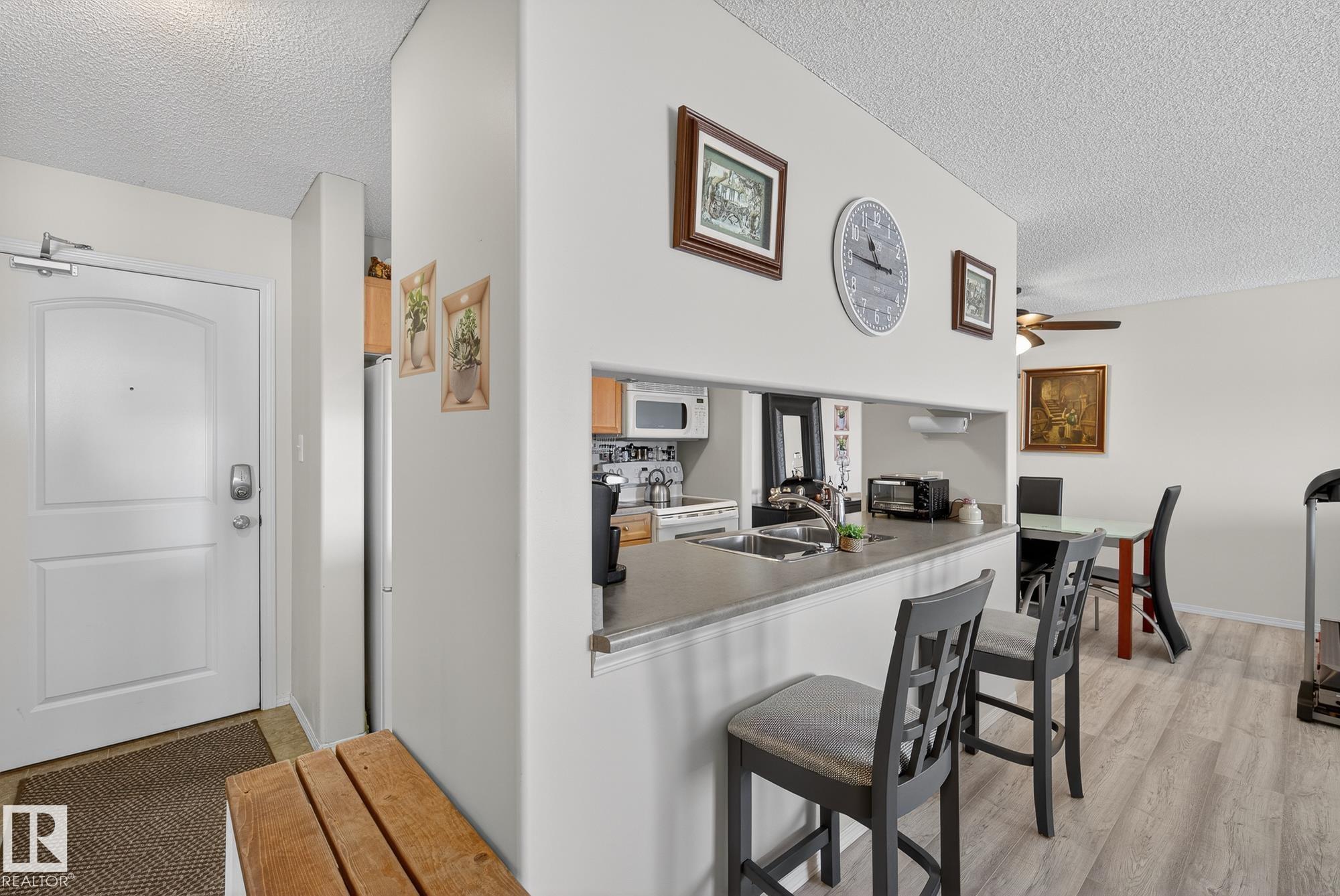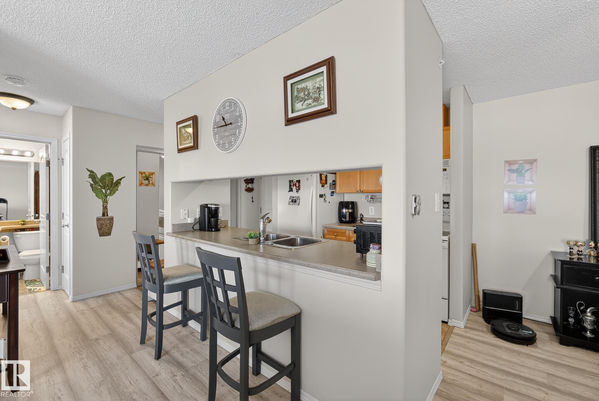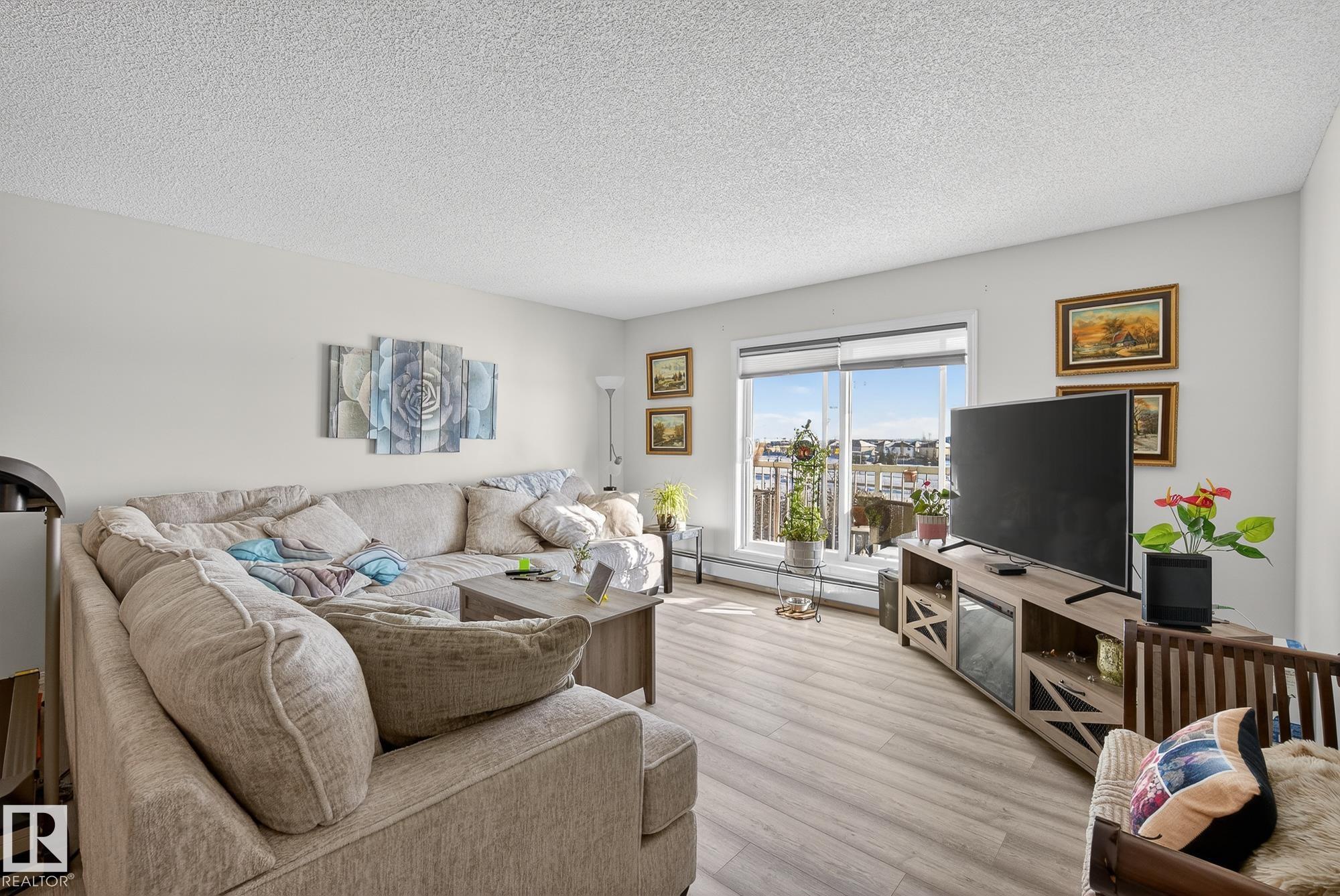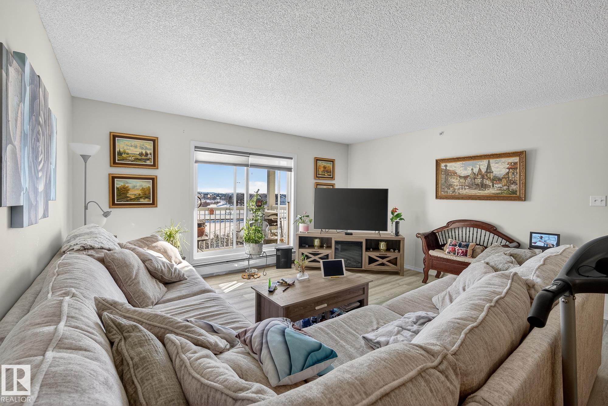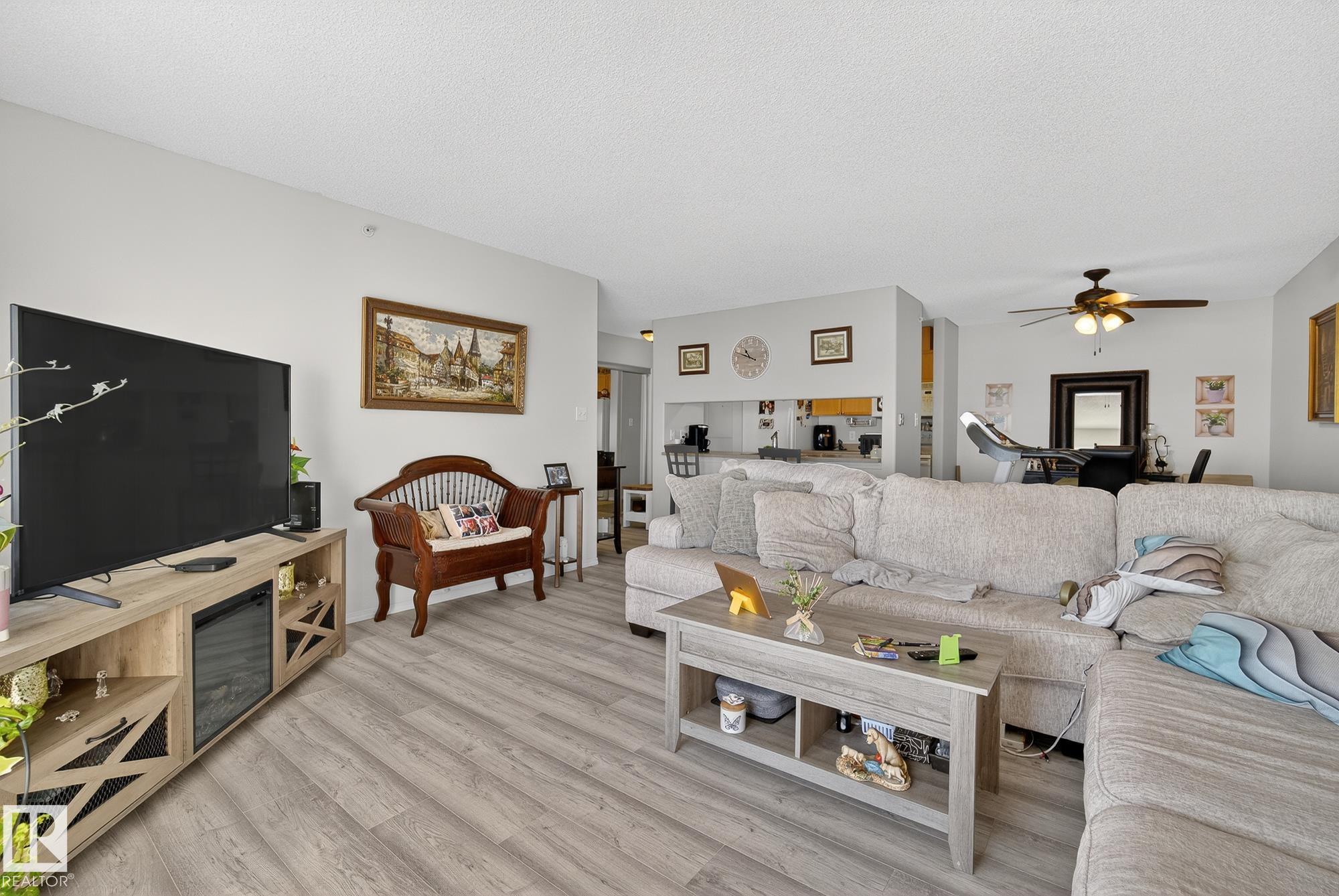 Welcome to top floor living at its best! Featuring 1 bedroom and 1 bathroom this unit is well sized at 751 sq ft. It holds a galley style kitchen with lots of cupboard space, and fills up with morning sunlight from the east facing balcony windows and patio door. With a LARGE living room and ample dedicated dining space this apartment truly feels like a home. New vinyl plank has been professionally laid down throughout. This unit features in suite laundry with a new washer and dryer that have been installed and are held in a large storage room. Included in the condo fees, is access to the fitness center across the parking lot in building 50! This property is in great proximity to Sherwood Park via highway access and has great walkability to public transportation within the city.