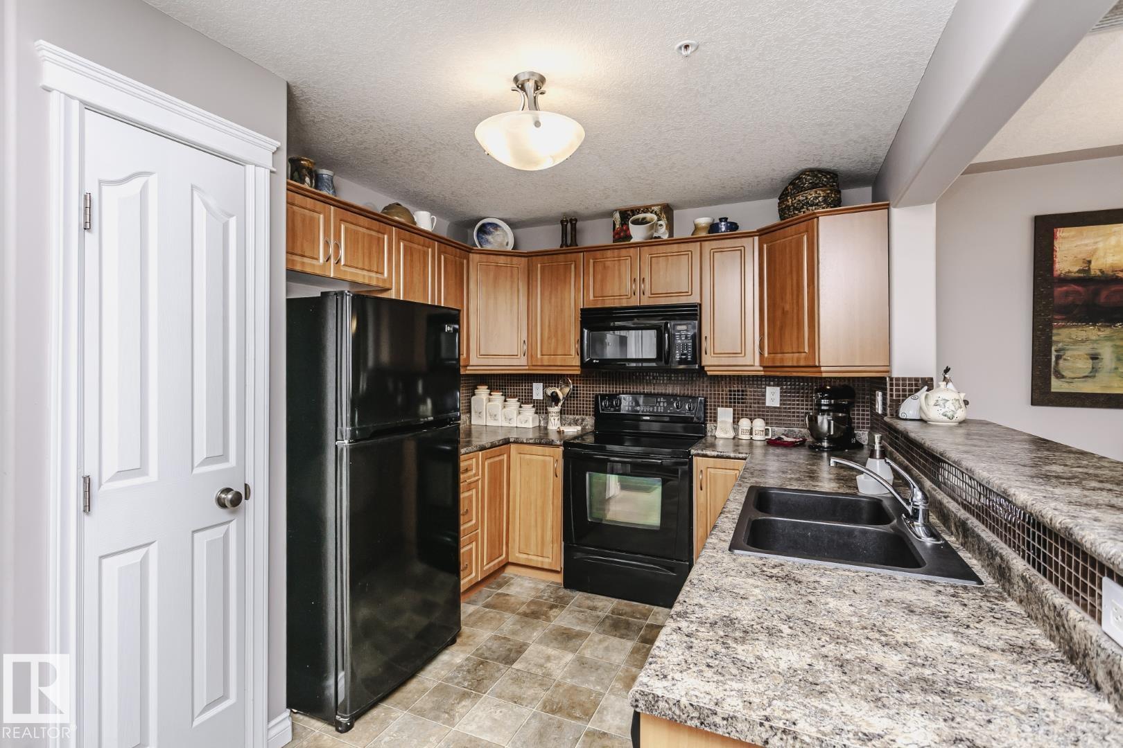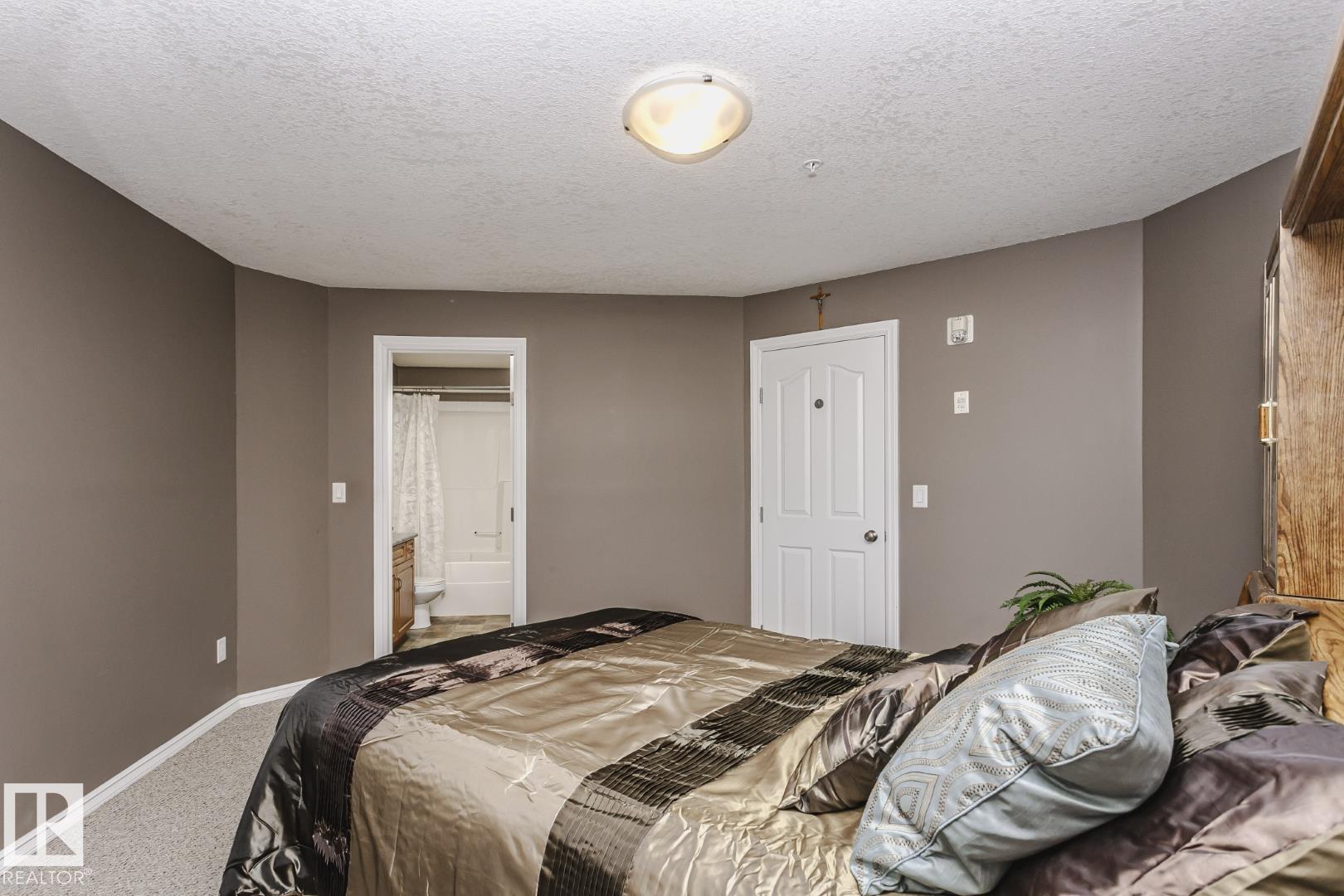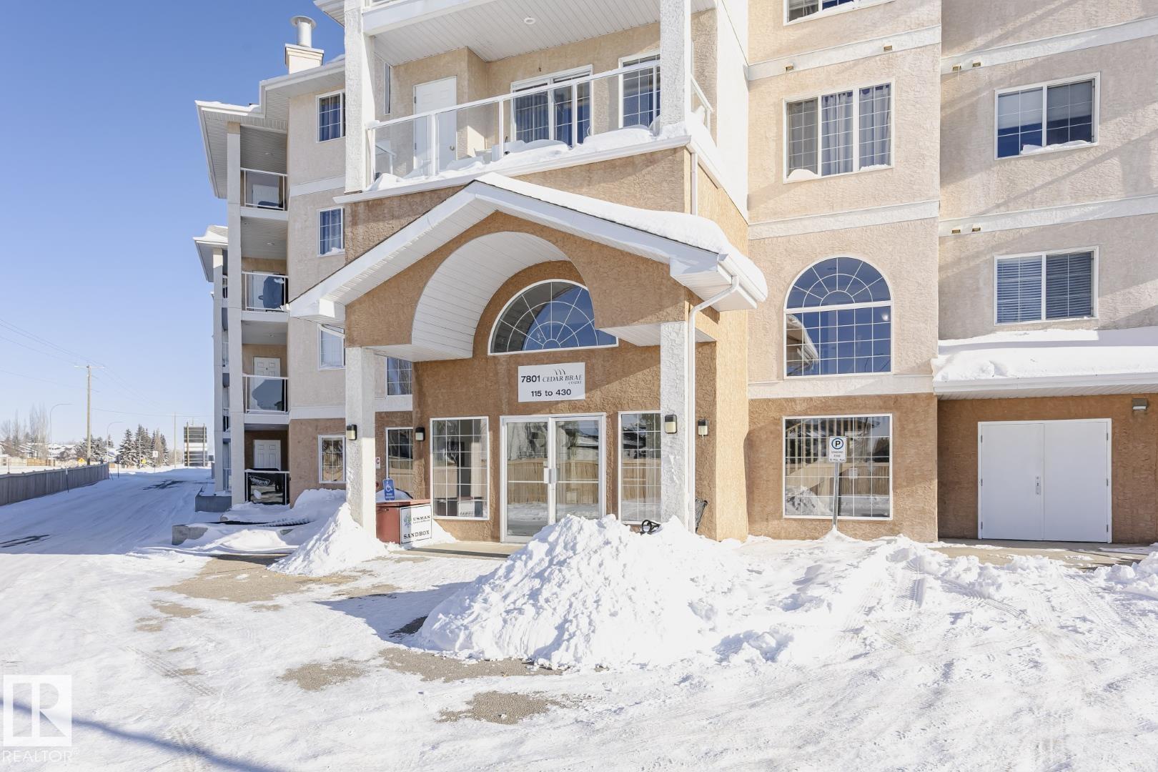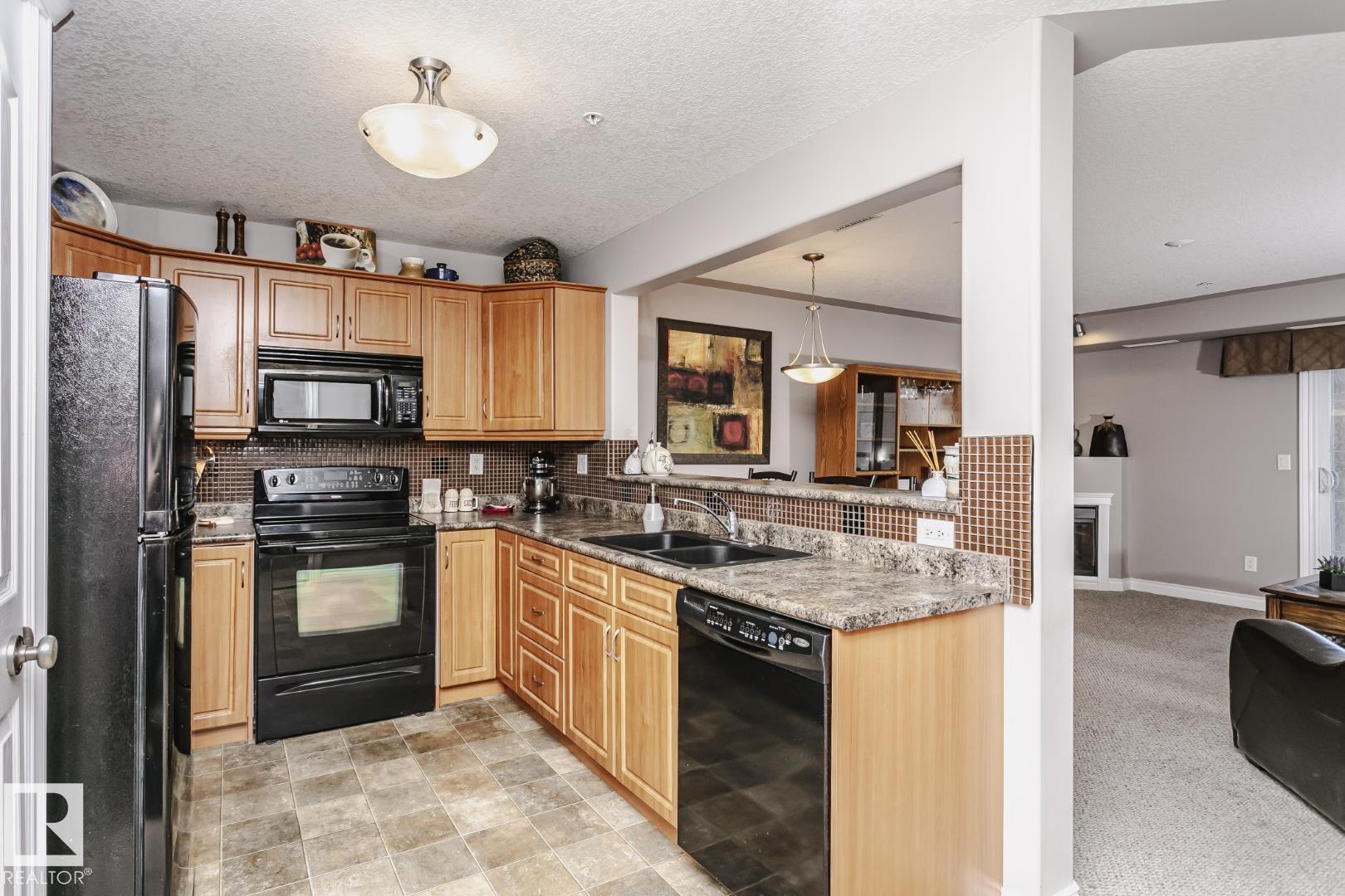 Great 1 bedroom PLUS den condo in Stony Plain's Cedar Brae Court. Boasting 911 sq ft, this suite offers a great layout! Spacious, functional kitchen with lots of counter and cupboard space, under cupboard lighting and black appliances. Opens to large living room with corner fireplace and patio doors leading to your east balcony overlooking green space. Master bedroom will comfortably fit a king bed, access door into 4-piece bathroom with jetted tub and HUGE walk-in closet. Various options for your den / flex room. Laundry room offers stackable washer & dryer, built-in shelving & room for your freezer. Underground parking stall with storage cage just steps from the elevator. Amenities include games room with exercise area & library, as well as separate building that can be rented / used for special events. Welcome Home!