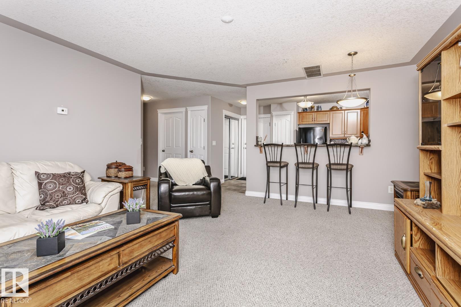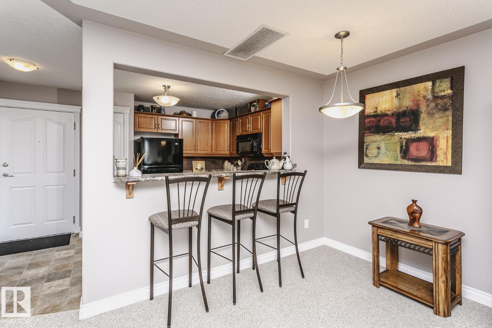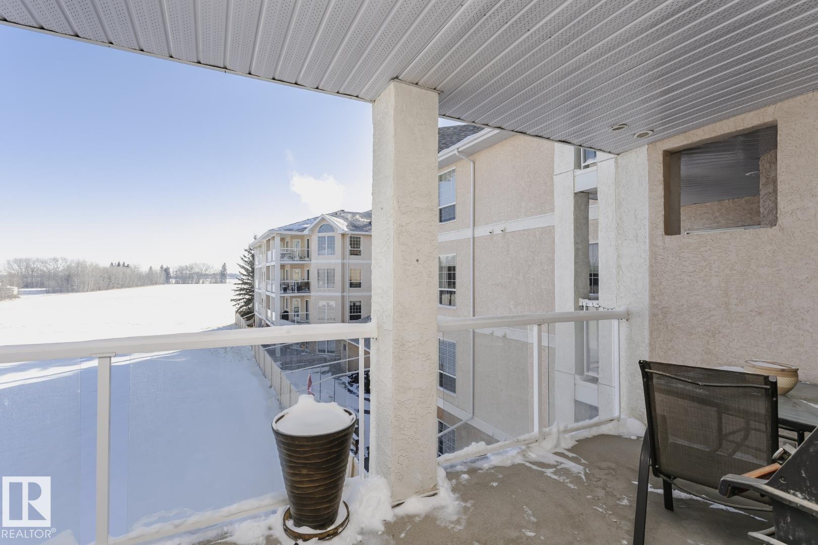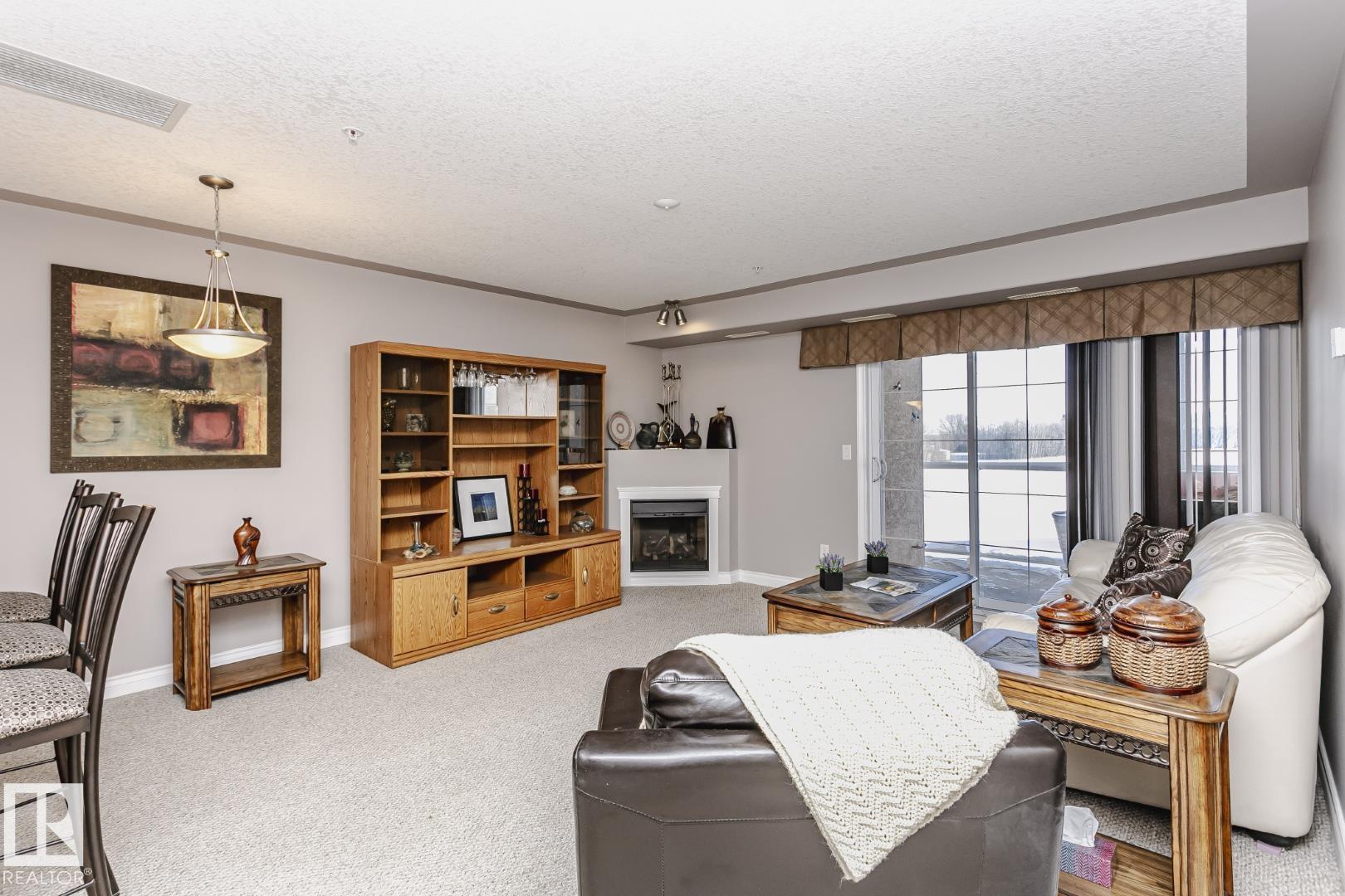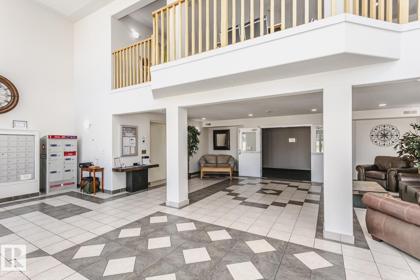 Great 1 bedroom PLUS den condo in Stony Plain's Cedar Brae Court. Boasting 911 sq ft, this suite offers a great layout! Spacious, functional kitchen with lots of counter and cupboard space, under cupboard lighting and black appliances. Opens to large living room with corner fireplace and patio doors leading to your east balcony overlooking green space. Master bedroom will comfortably fit a king bed, access door into 4-piece bathroom with jetted tub and HUGE walk-in closet. Various options for your den / flex room. Laundry room offers stackable washer & dryer, built-in shelving & room for your freezer. Underground parking stall with storage cage just steps from the elevator. Amenities include games room with exercise area & library, as well as separate building that can be rented / used for special events. Welcome Home!
