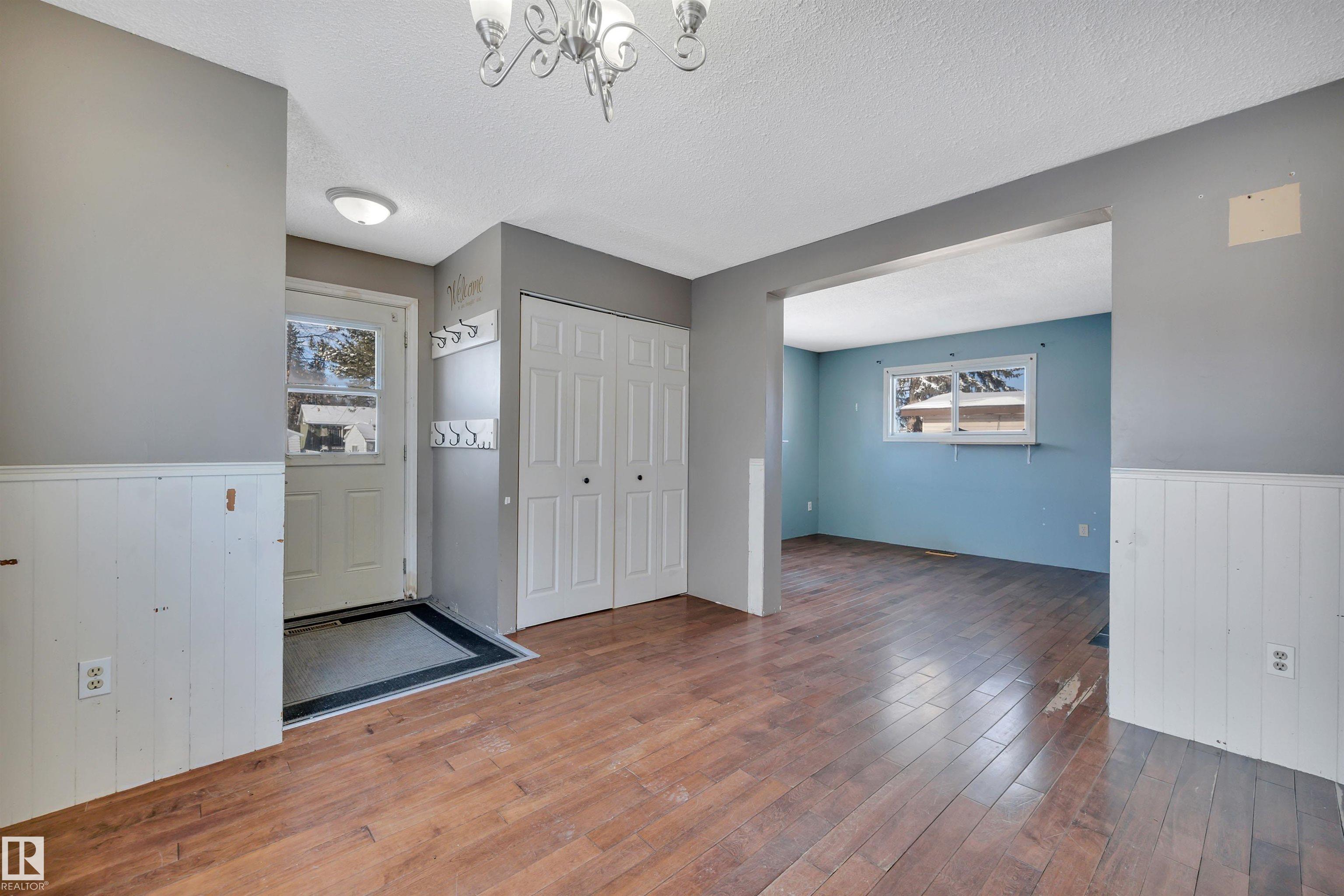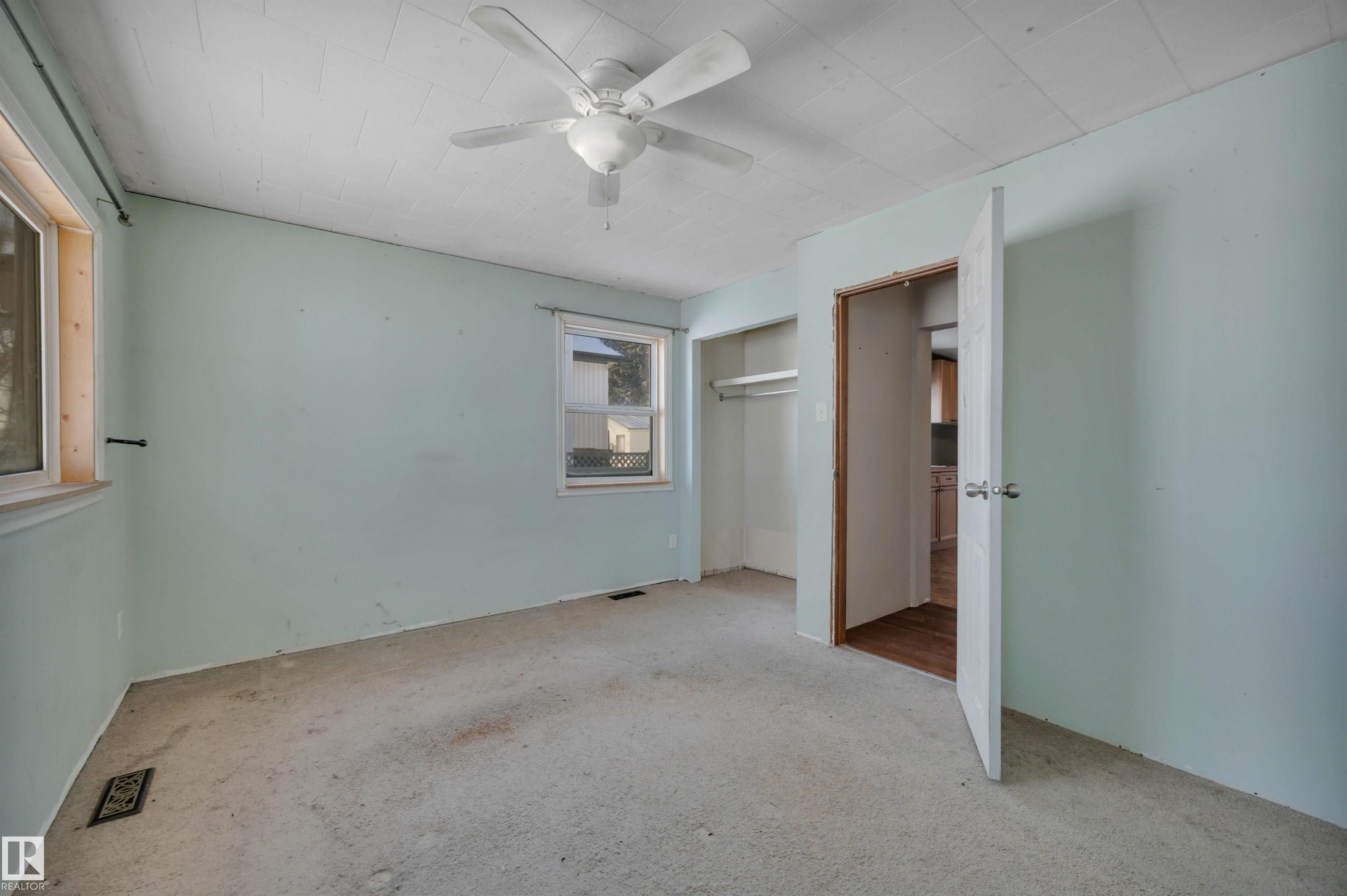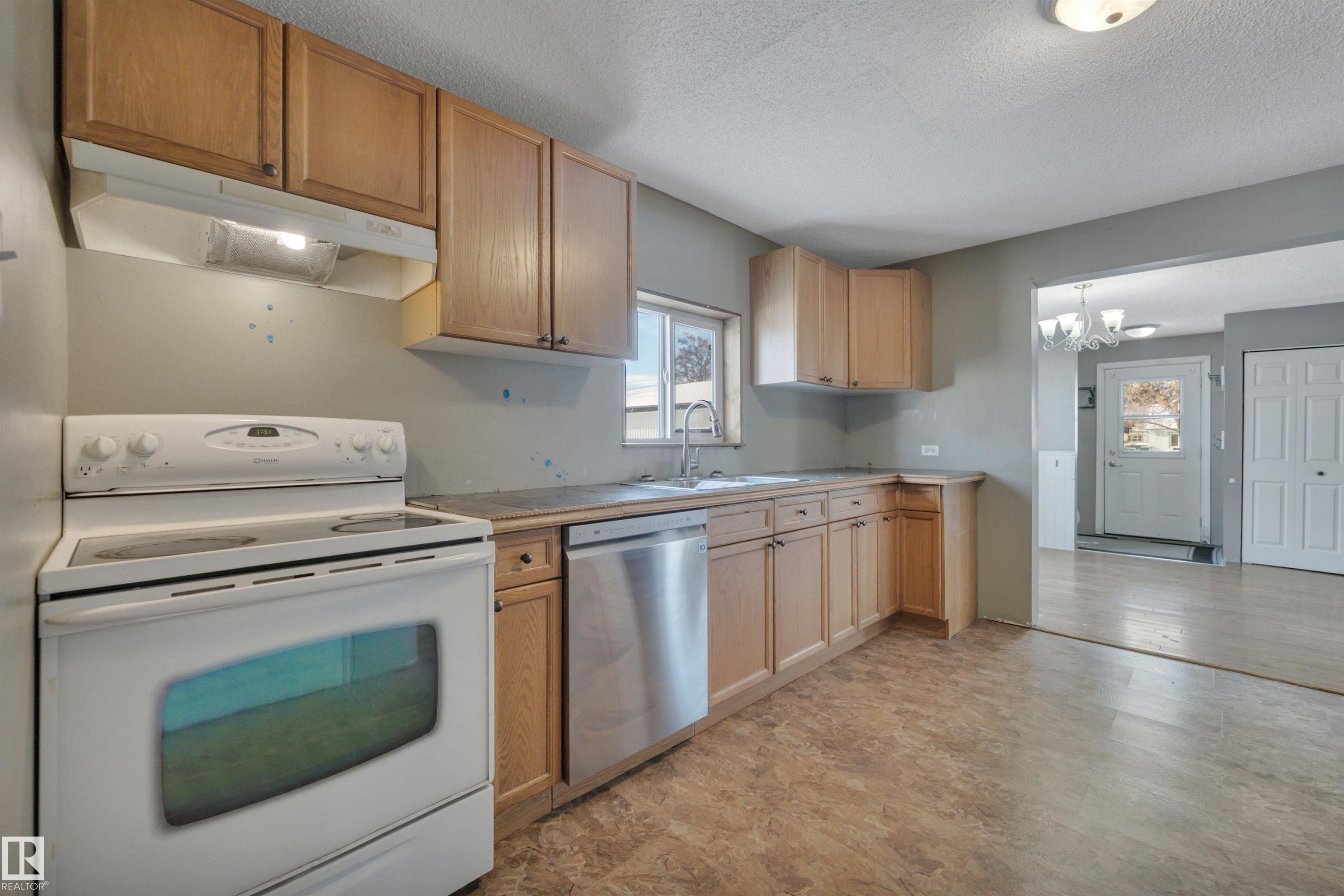 Searching for an affordable home with a detached garage & large lot? This 1029 sq ft 3 bed, 1 bath home located on a quiet street has loads of potential! Long driveway for additional parking & massive fenced yard with rear alley access allows for RV parking if desired. Inside brings an open concept design, uniting the living / dining / kitchen space; ideal for family gatherings or ample natural light. Hardwood flooring in the dining & living room, lino in your galley kitchen, carpet in bedrooms. Detached single garage for parking or tinkering on projects. Property sold as is, where is.