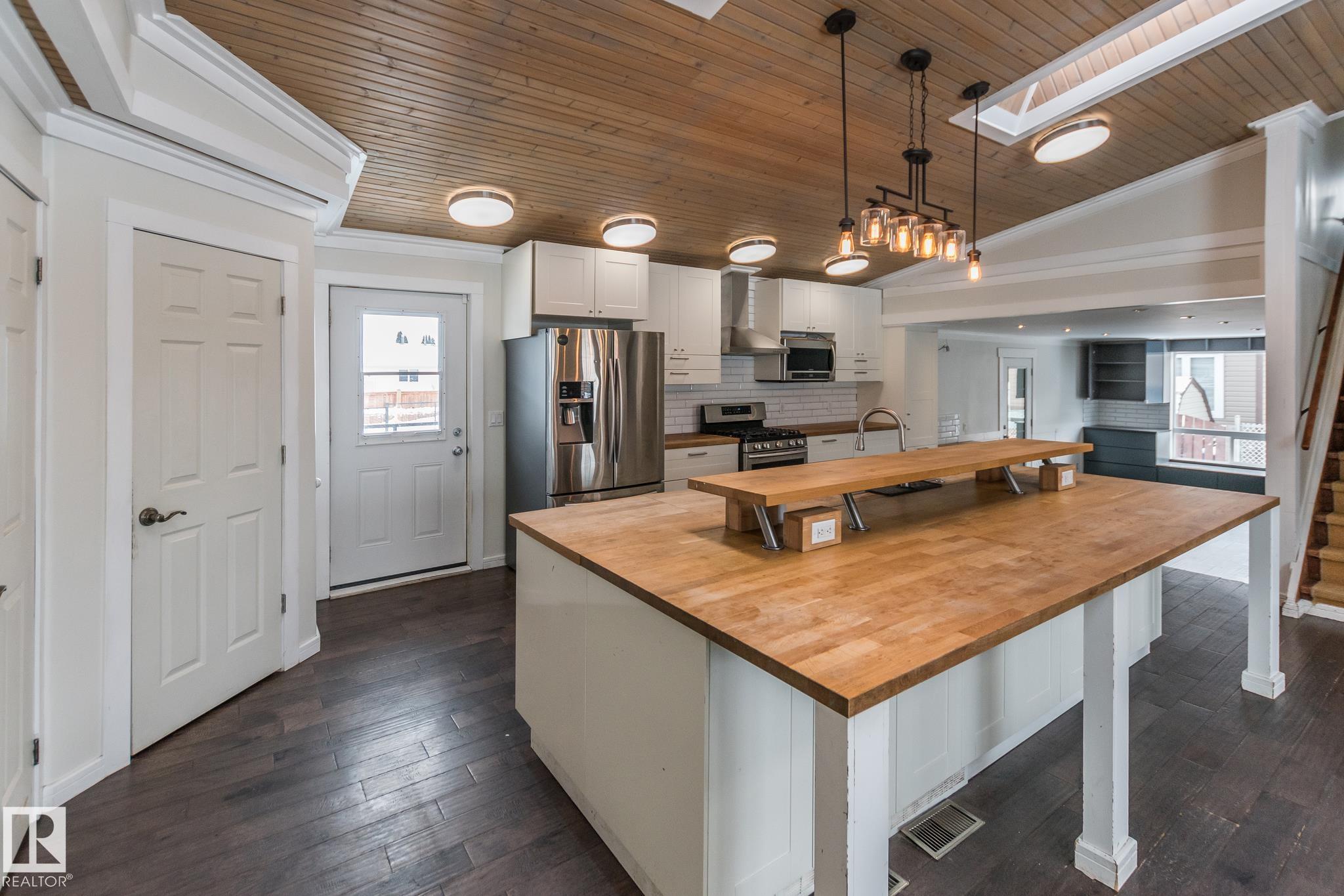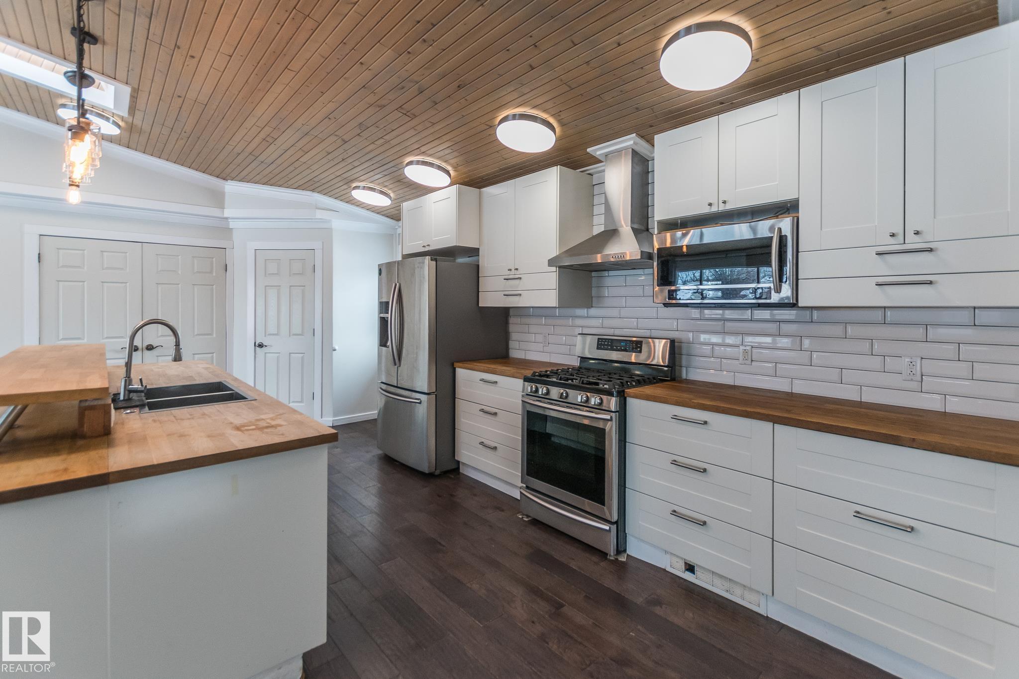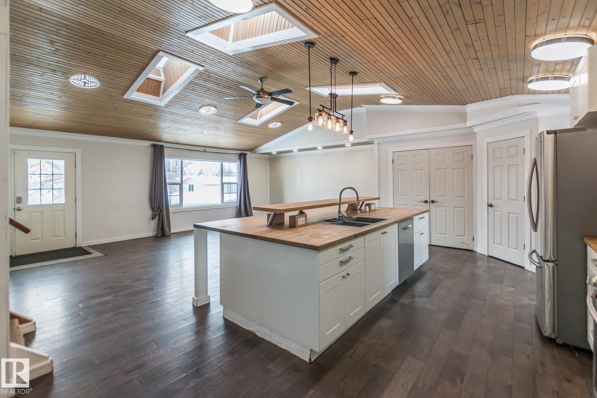 Welcome to this beautifully updated 3-level split offering 2,026 sq ft of living space, thoughtfully designed for comfort and function. This home features 4 bedrooms and 4 bathrooms, including a stylish 4-piece ensuite. The bright and open kitchen is a true showstopper?complete with white cabinetry, butcher block counters, stainless steel appliances, a large island with seating, and stunning wood ceilings with skylights that fill the space with natural light. Enjoy relaxing in the hot tub room, perfect for year-round use, or unwind in the fully fenced backyard, ideal for family gatherings and outdoor living. The oversized double detached heated garage provides plenty of space for vehicles, storage, or a workshop. Nestled in a quiet cul-de-sac and close to schools, this home is perfect for families seeking space, privacy, and convenience.