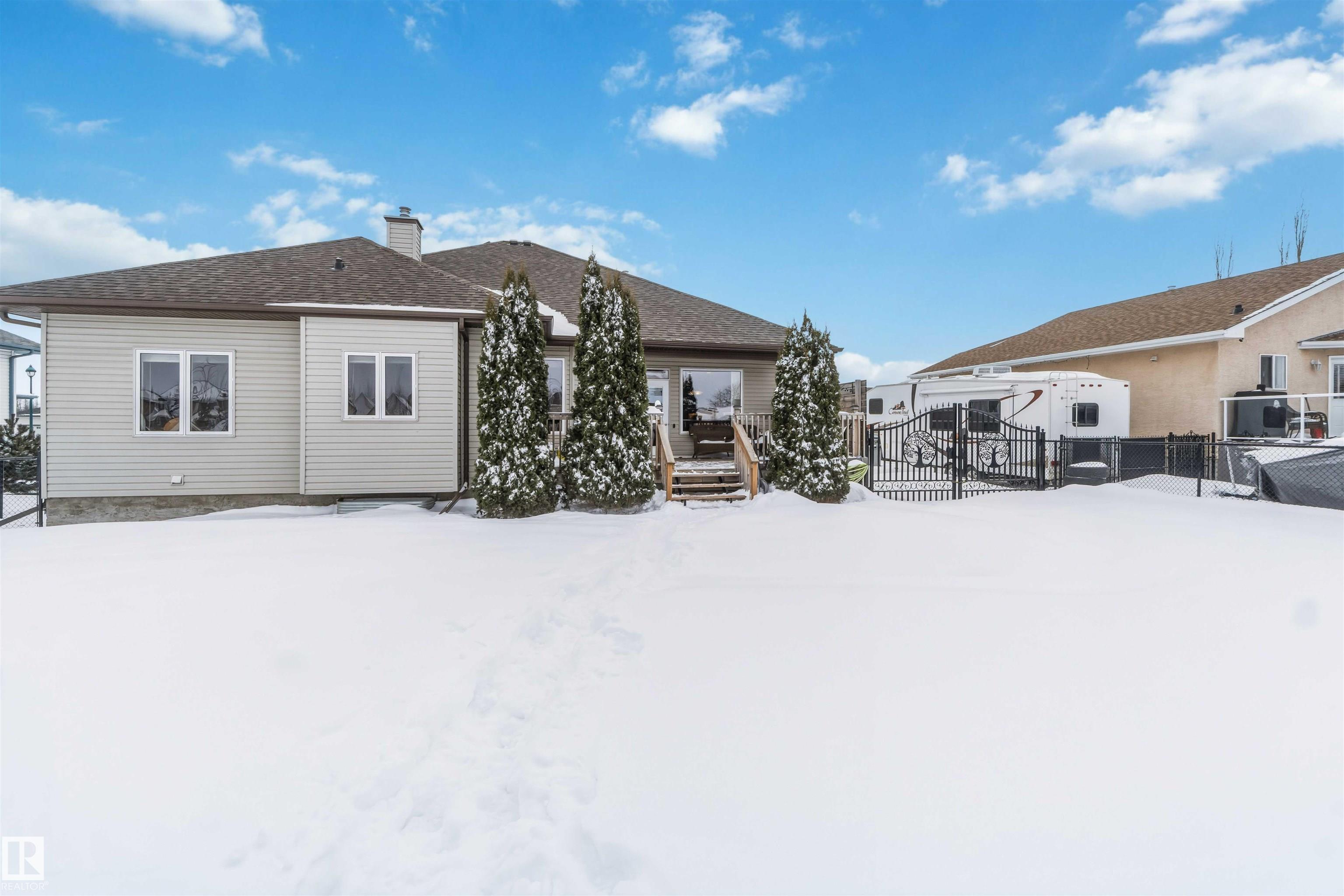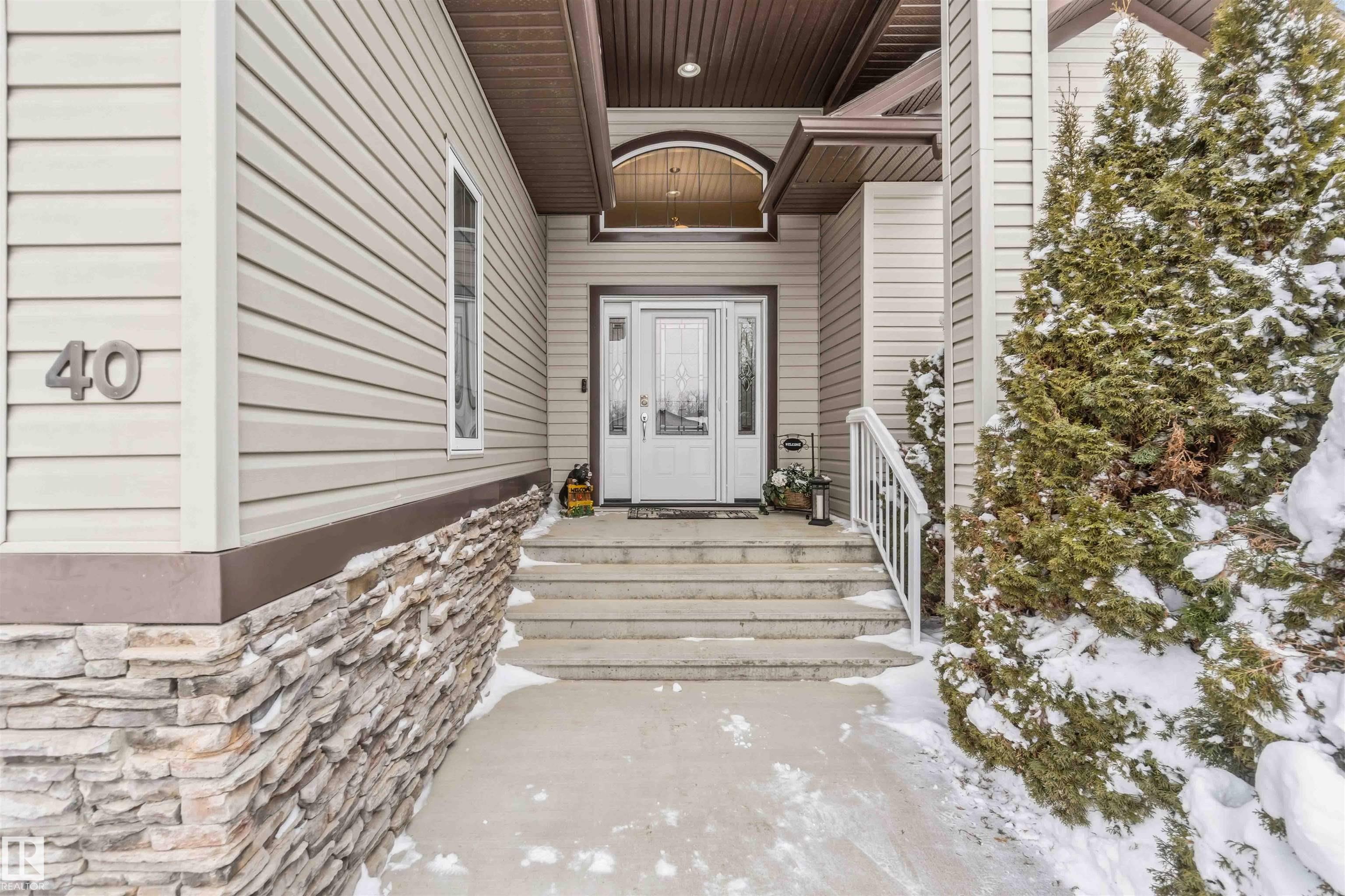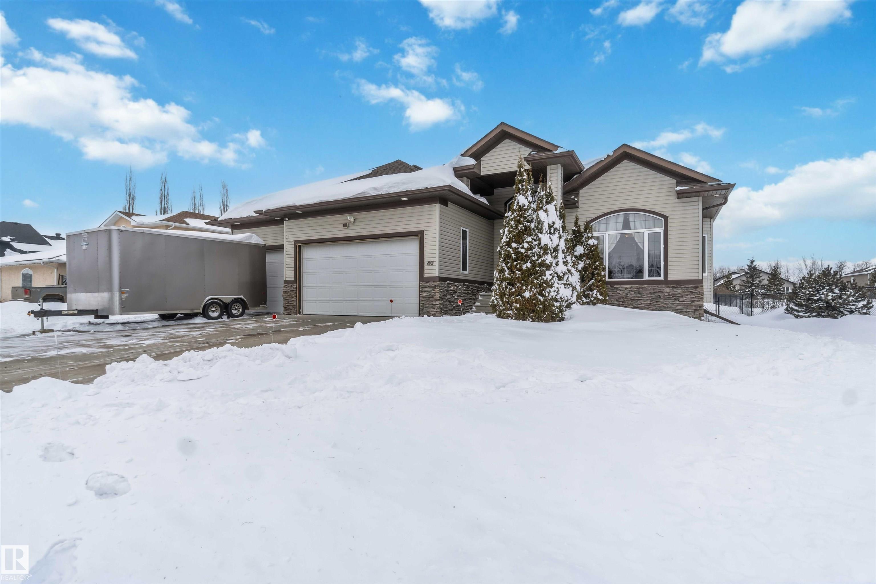 Look No Further! Welcome to 40 Landing Trails Dr in the Town of Gibbons. Stunning Bungalow on a 1/3+ acre lot with a Triple Heated Garage, large front driveway & over 2000sq ft of living space to enjoy! The main floor features 10ft ceilings, grand foyer, front den, living room with a gas FP & lots of natural light. Dining room, kitchen with cherry cabinets, granite countertops, island with an eat-up area, walk-in pantry, dining nook looking out to the private covered deck with natural gas for a bbq. The laundry room has access to the garage. 2 bedrooms, 4pc bathroom, primary bedroom with a huge walk-in closet, 4pc ensuite & soaker tub. The finished basement boats a rec room, 2 more bedrooms, 3pc bathroom & storage room. 2019 50yr Shingles, 2021 HE Furnace & HE HWT, 2022 Central AC & Radiant Furnace in garage. Garage has 8ft doors, floor drain, hot/cold taps. New iron gate allows access to the huge fenced yard, storage shed, raised garden beds & fire pit area. Impressive pride of ownership throughout!!