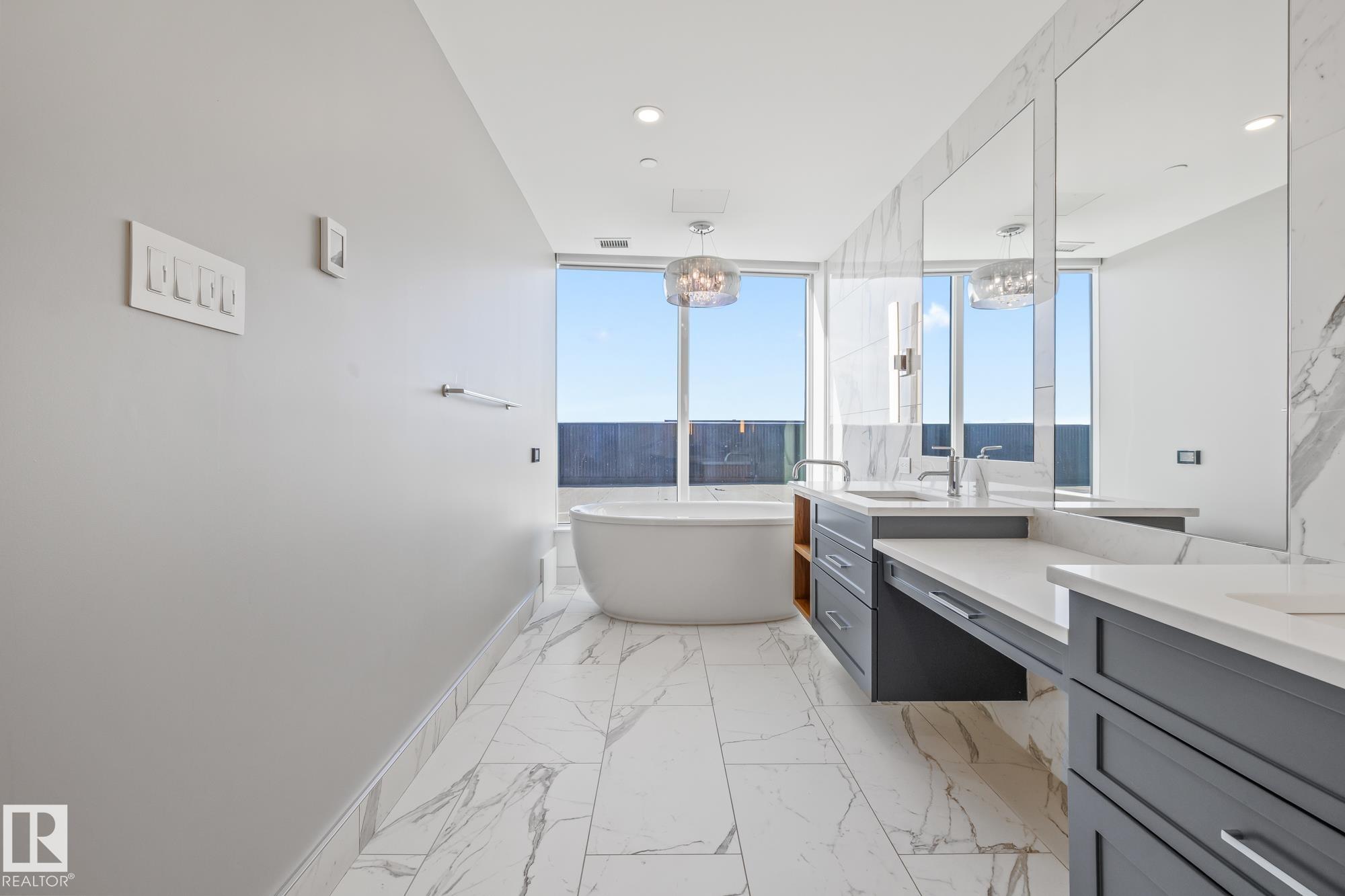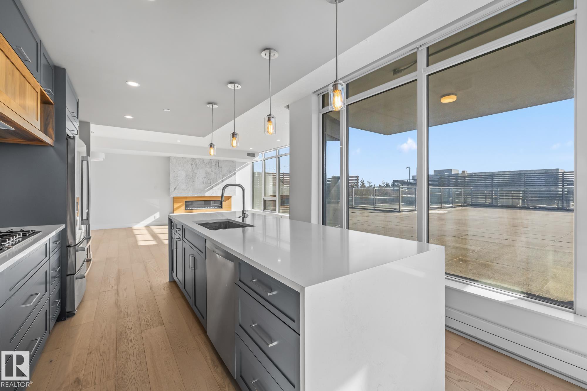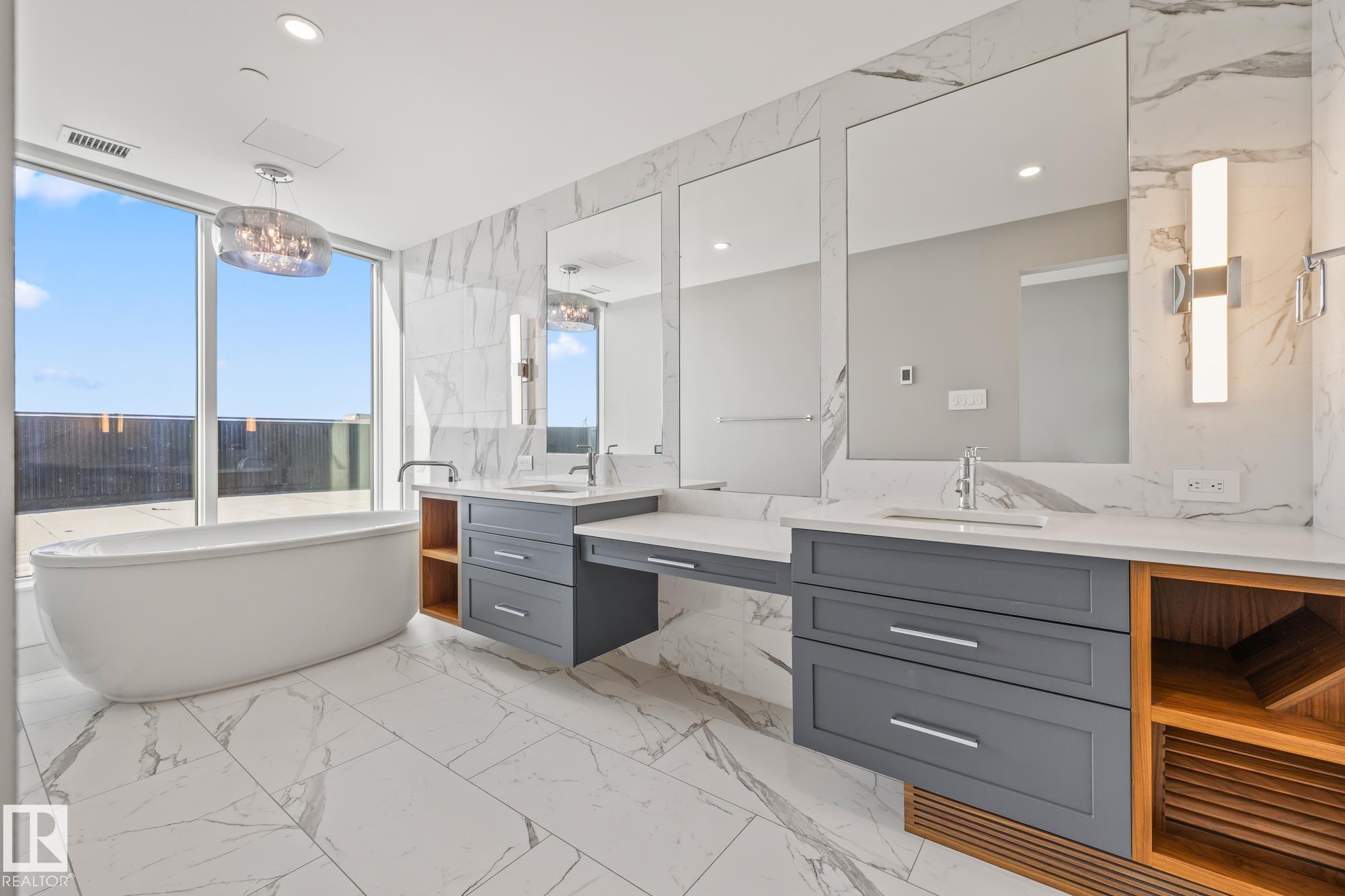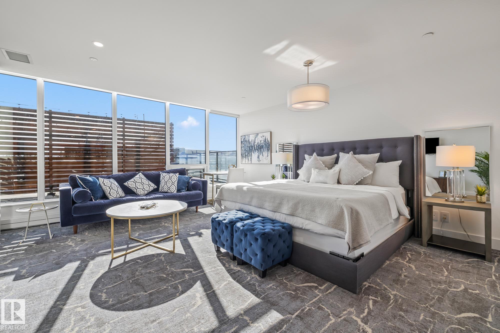 This exceptional residence offers unparalleled privacy and refined living. Floor to ceiling windows fill the home with natural light and frame uninterrupted blue skies with southwest exposure. Ten foot ceilings, motorized blinds, and a stone faced gas fireplace create a calm, elevated atmosphere. Each bedroom features its own private ensuite, complemented by a dedicated office and elegant powder room. The spa inspired primary bath offers heated floors, a freestanding tub that plays soothing music and gently vibrates, and a steam shower. Above it all, an over 2000 sq. ft. private rooftop terrace, the only one in the building, creates an extraordinary outdoor retreat ready for your own hot tub. Two underground parking stalls and titled storage add convenience, while residents enjoy concierge service, a state of the art gym, indoor and outdoor lounges, guest suite, conference and catering room, dog run, dog wash, and a laundry service drop box. A rare offering for those who expect the very best.