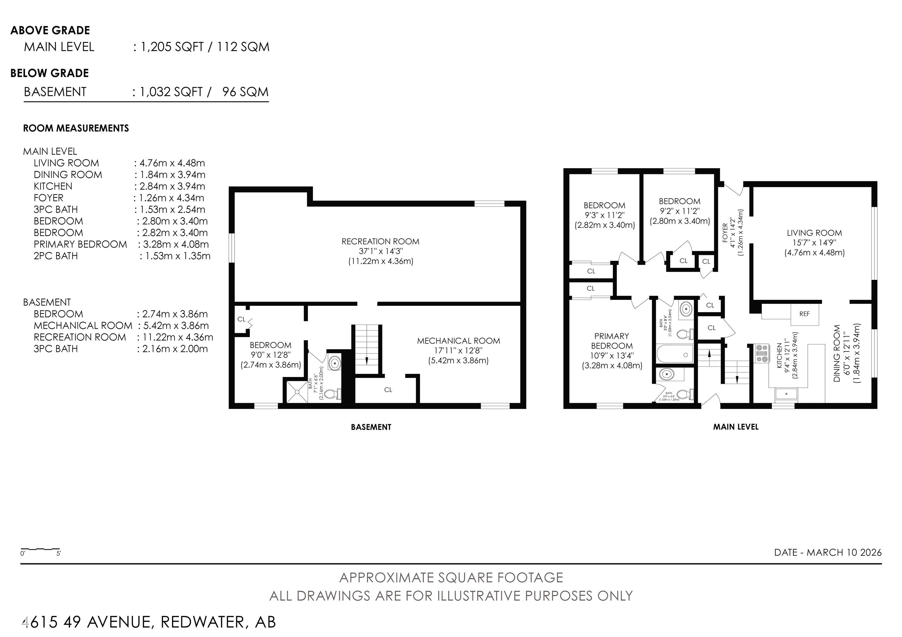 BEAUTIFULLY RENOVATED BUNGALOW IN FAMILY-FRIENDLY REDWATER ? JUST 55 KMS TO EDMONTON! Offering 1,205 sq. ft. on the main floor plus an additional 1,032 sq. ft. on the lower level, this home is packed with space & potential! Natural light floods every corner of the stunning, thoughtfully updated main floor, showcasing a gorgeous kitchen, inviting dining area & bright living room ? all finished to impress. The main floor also features a spacious primary bedroom with a 2pc ensuite, two additional bedrooms & a 4pc bath. The lower level is a blank canvas, already hosting a large family room, an additional bedroom, 3pc bath & utility/laundry room ? ready for your personal touch & finishing ideas! Outside, enjoy the convenience of a 22x24 detached garage, RV parking & a concrete parking pad out front. Redwater offers a tight-knit community with all the essentials, while keeping you within easy commuting distance of the city. Space, style & small town charm ? this one is worth the drive!