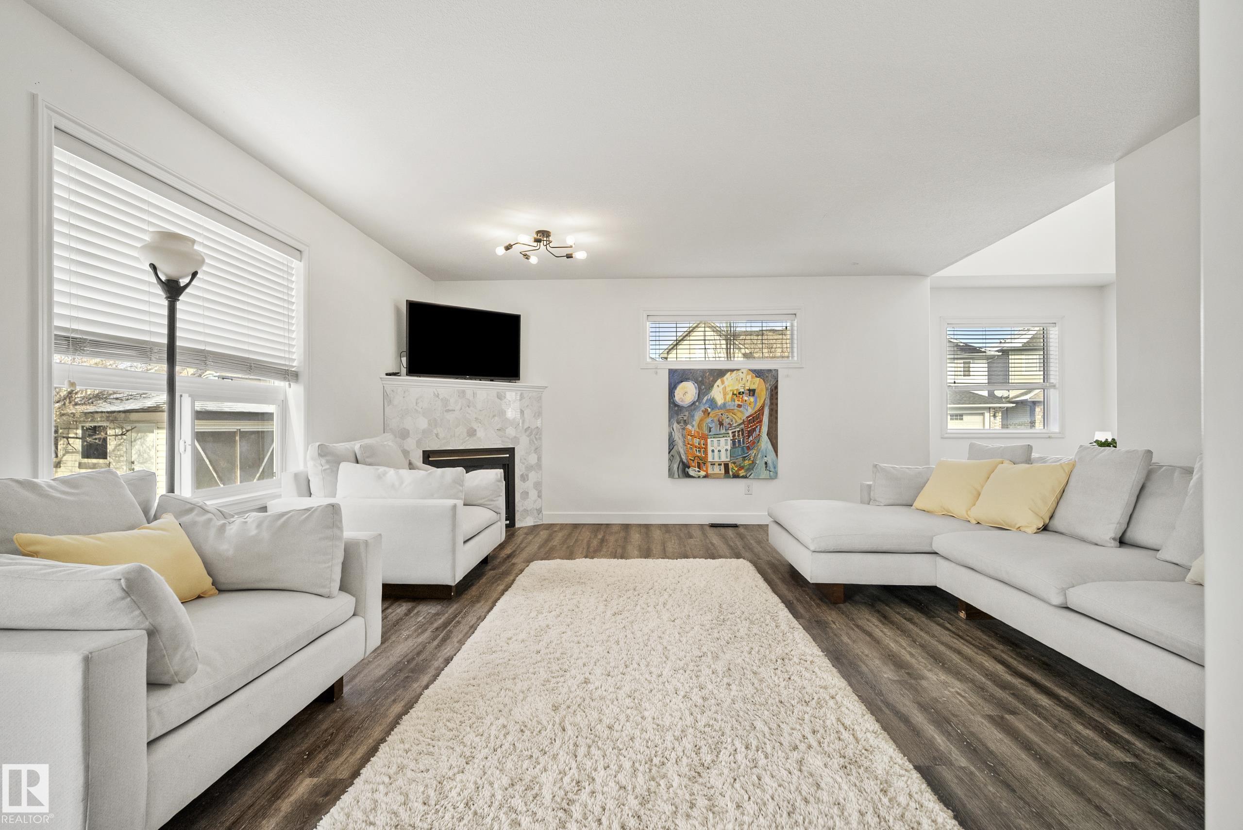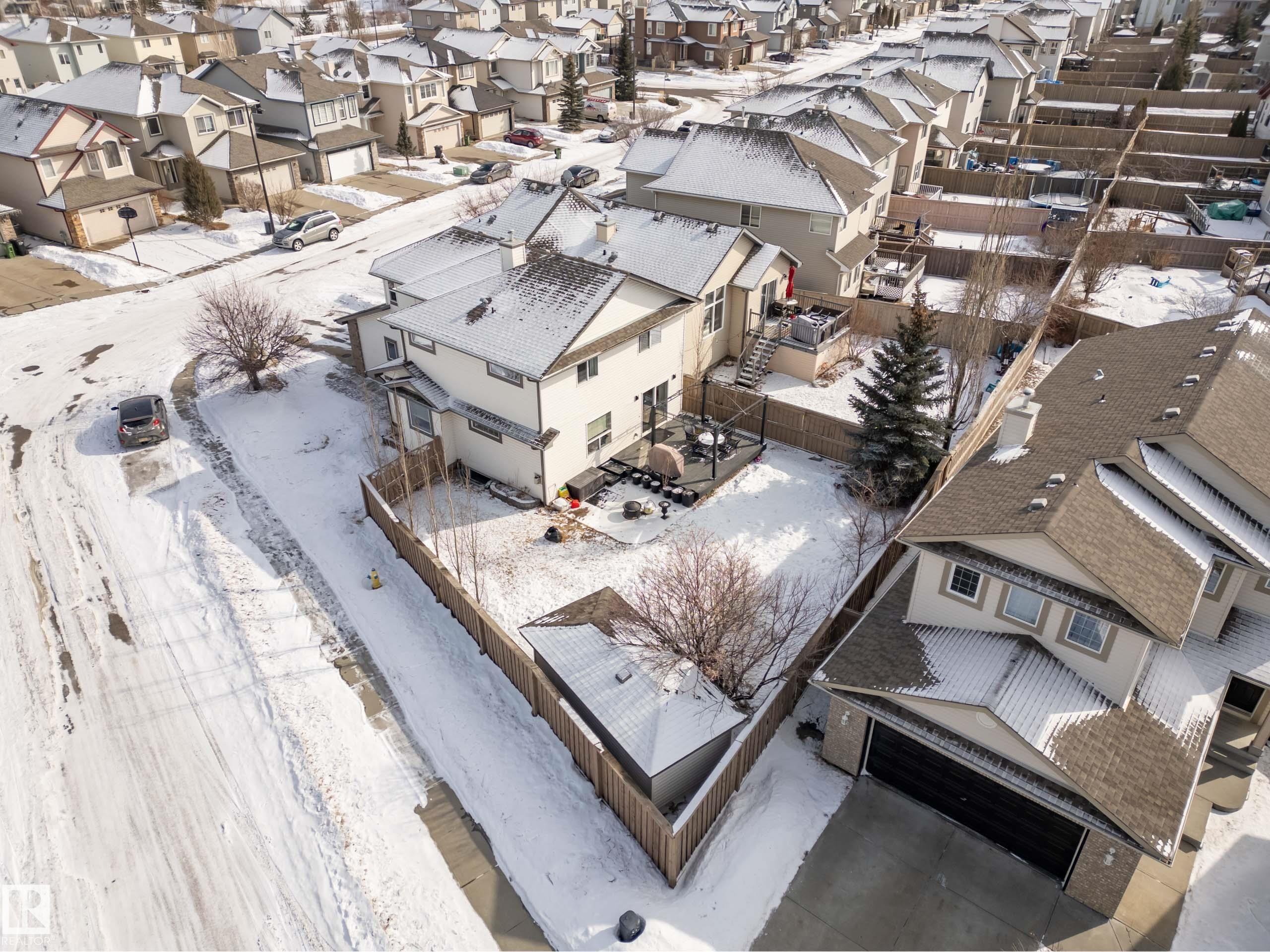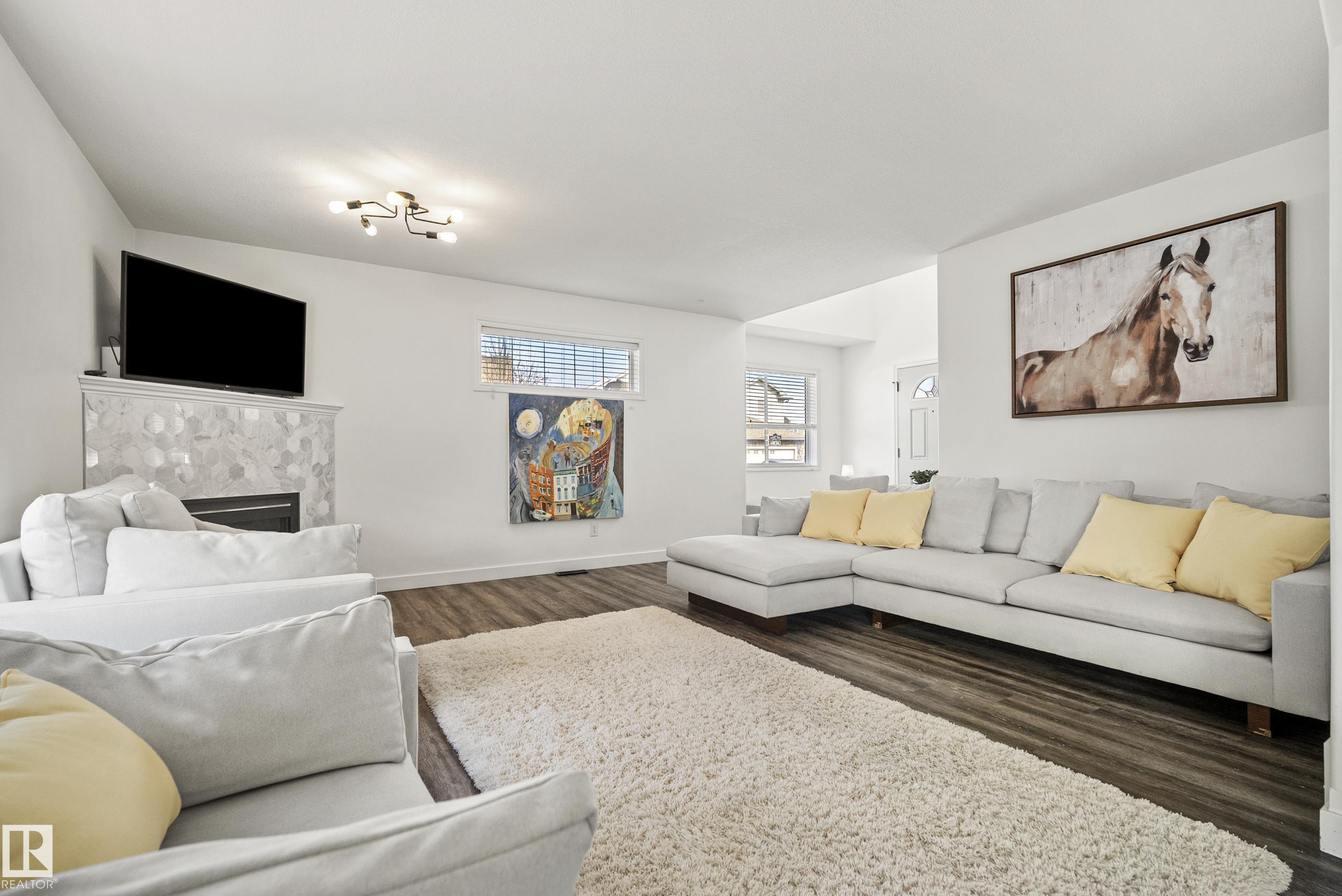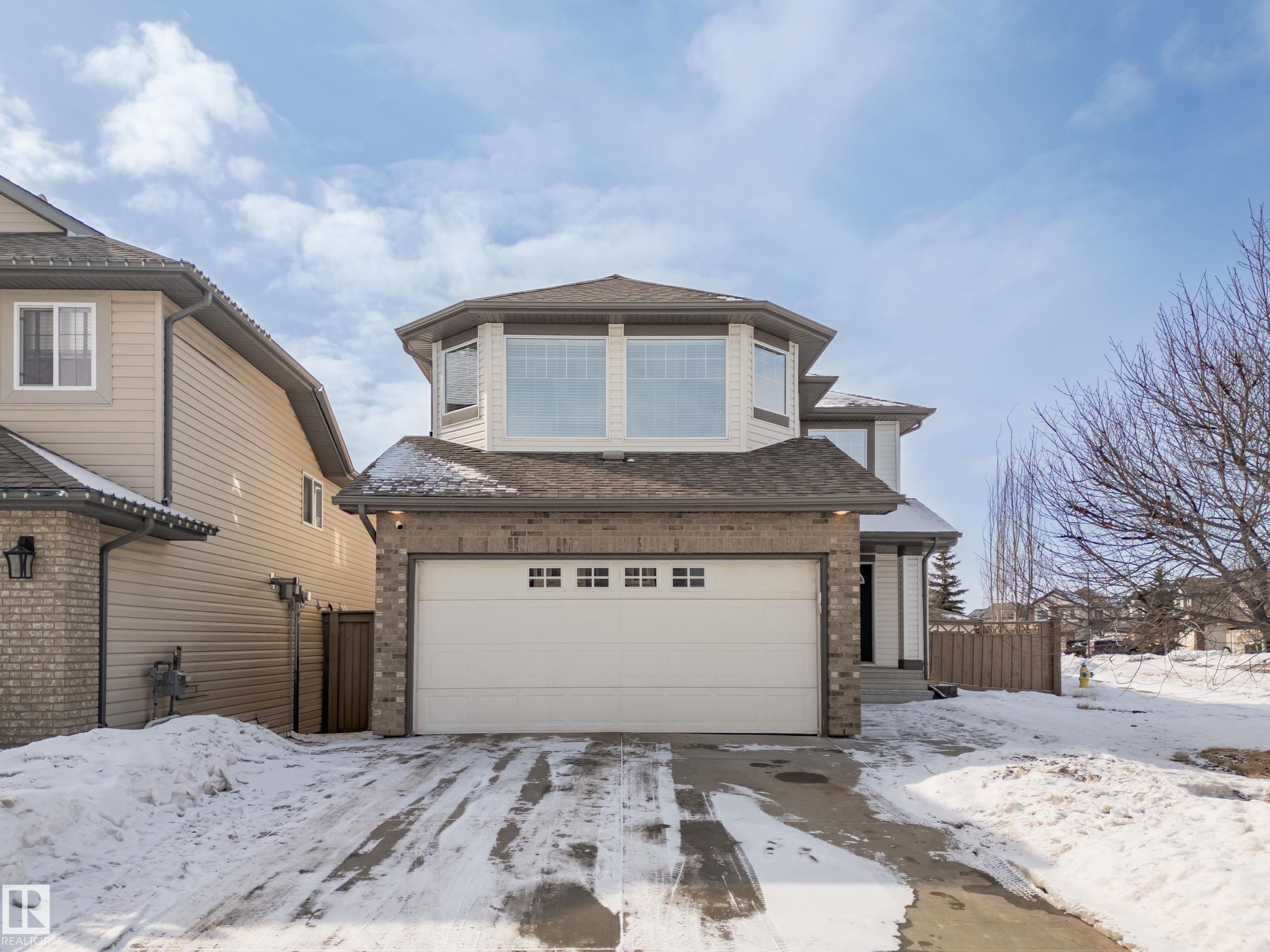 Beautifully renovated, fully finished 2 storey home on a large corner lot in the heart of South Terwillegar! Welcomed by an impressive grand foyer w/ 17' ceiling flowing into the bright & modern main floor flooded w/ natural light from the SW facing yard. The updated kitchen features white quartz countertops, white artisan tile backsplash & premium s/s appliances w/ an induction stove & french door fridge. LVP flooring & modern light fixtures throughout the main floor giving a clean, contemporary feel. Warm & inviting living room w/ gas fireplace & stunning marble tile surround. A convenient 2 pc powder room & laundry complete the main level. Upstairs offers a spacious bonus room w/ vaulted ceilings, the primary retreat w/ 4 pc ensuite & w/i closet, plus 2 additional bedrooms & a 4 pc bath. The fully finished basement features a large rec room w/ recessed lighting, plush carpet & barn door leading to the 4th bedroom. Enjoy A/C & the sunny SW yard w/ deck, exposed aggregate patio, u/g sprinklers & Shed