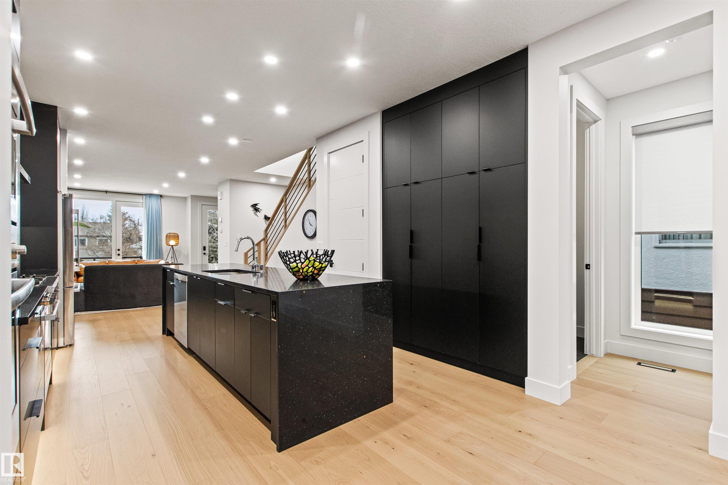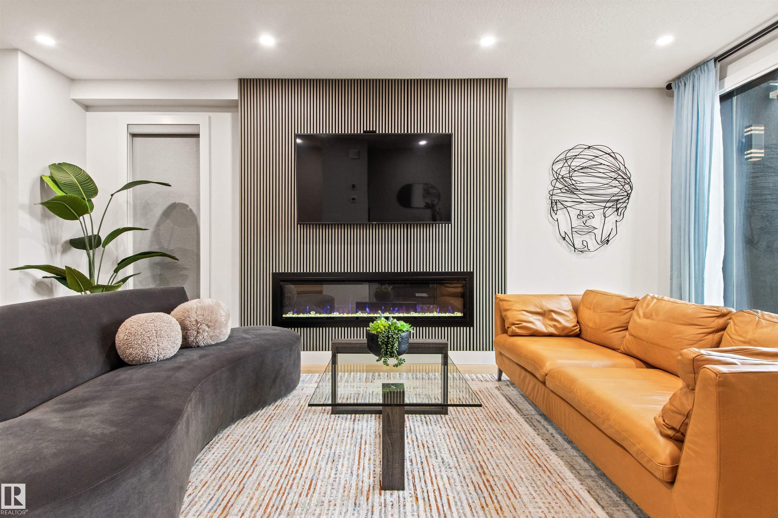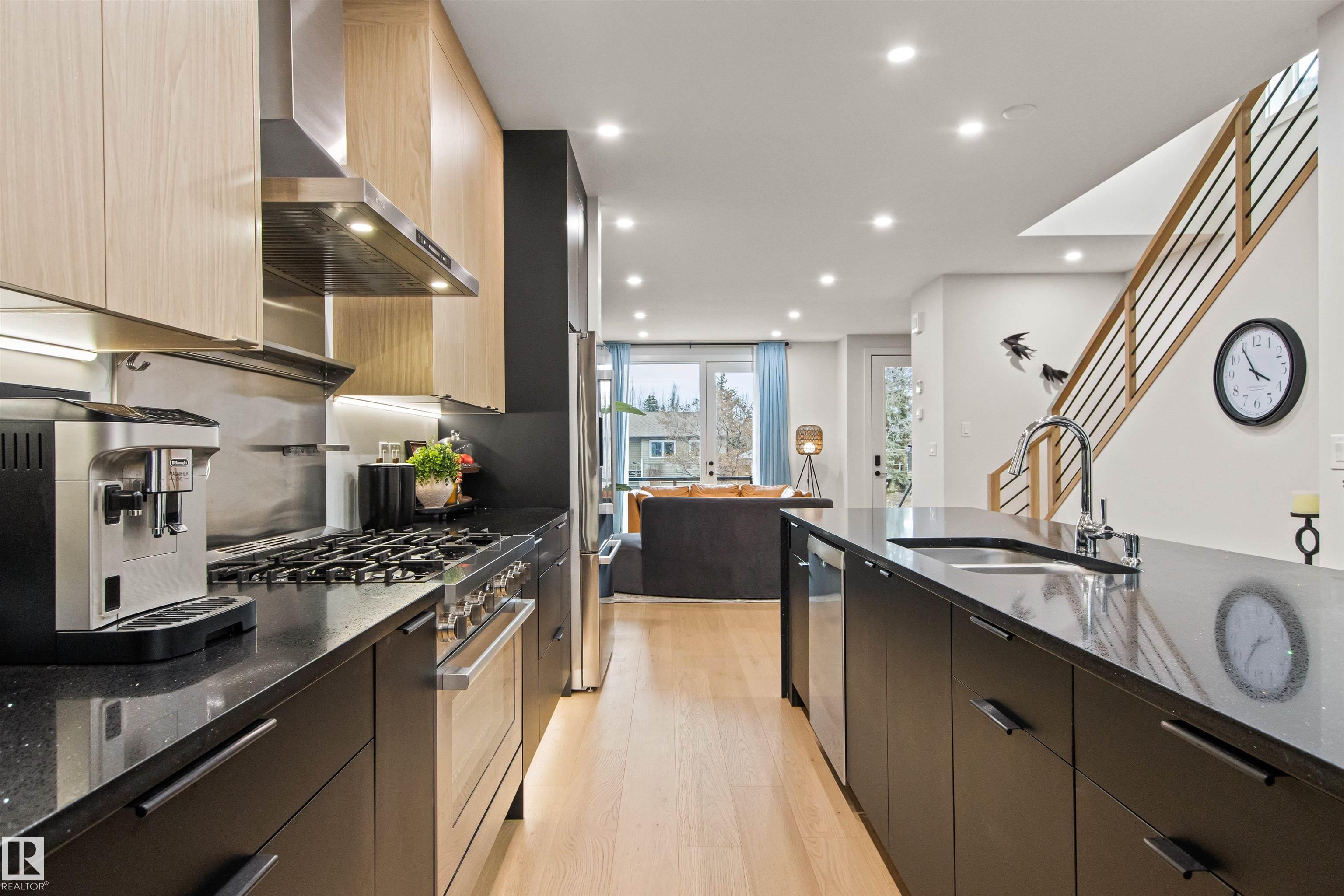 Welcome to Parkview & this truly TURNKEY property! Developed on 3 levels with superb workmanship. Engineered HARDWOOD throughout, 9' CEILINGS, & fantastic layout. Kitchen cabinets & closets by ESSENCE CABINETS. Showstopper kitchen has large waterfall QUARTZ island & high end BOSCH appliances ( including gas stove & 2 ovens: electric & gas). Living room has GARDEN doors leading to a front patio. Dining area, mud room & 2 pc bath complete the main level. Upstairs you find 3 bedrooms (including Primary suite with spacious closet & beautiful ensuite bath) & main bath. Basement has SEPARATE entrance & provides 2 additional bedrooms, family room (with wet bar, dishwasher & mini fridge), full bath, laundry hookup & utility room. NAVIEN tankless water heater, central A/C make life comfortable. Property is FENCED & LANDSCAPED. Exposed AGGREGATE concrete sidewalks & patios, ACRYLIC stucco & metal exterior add to a rich feeling of this property. DOUBLE detached garage is insulated. Make a move!