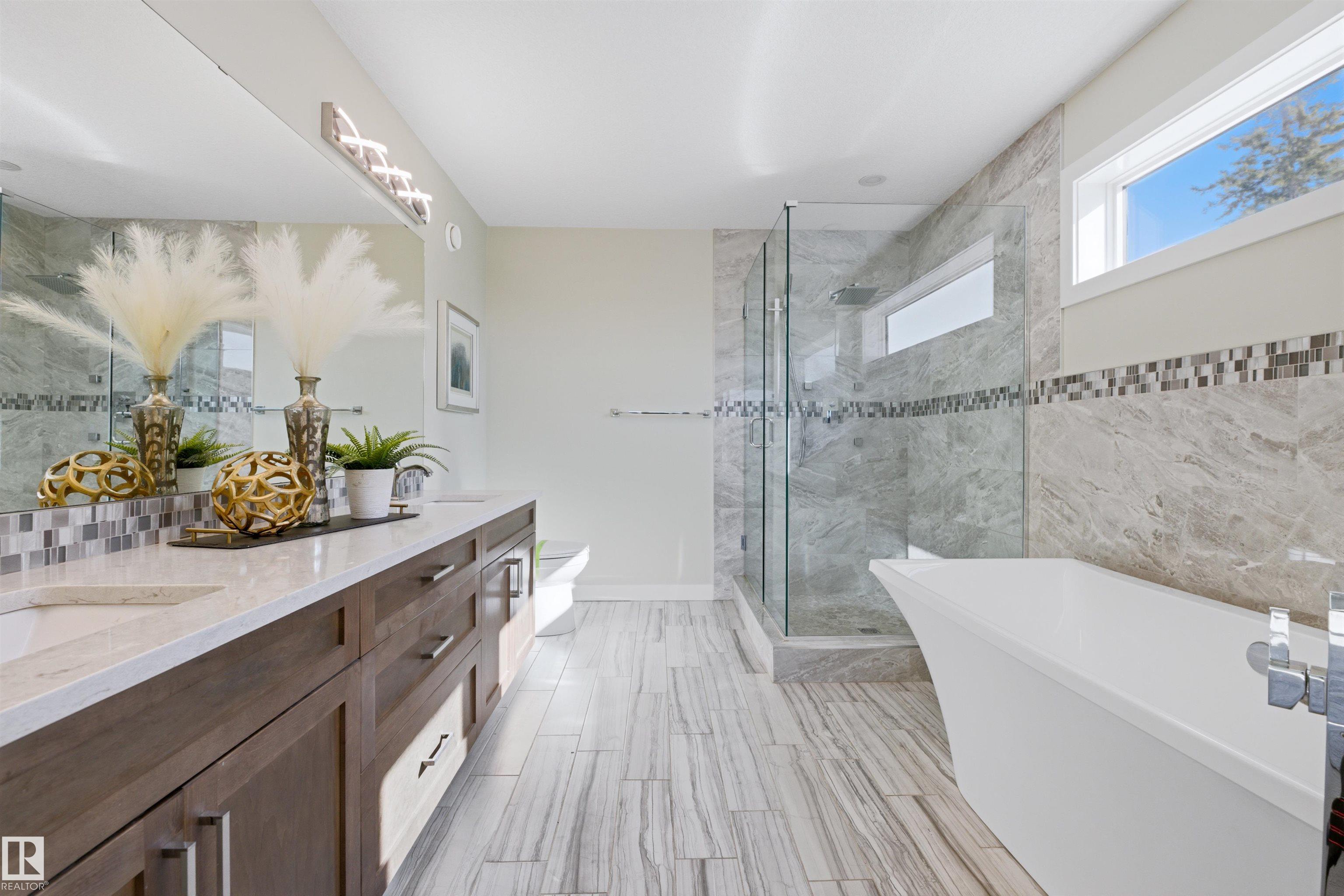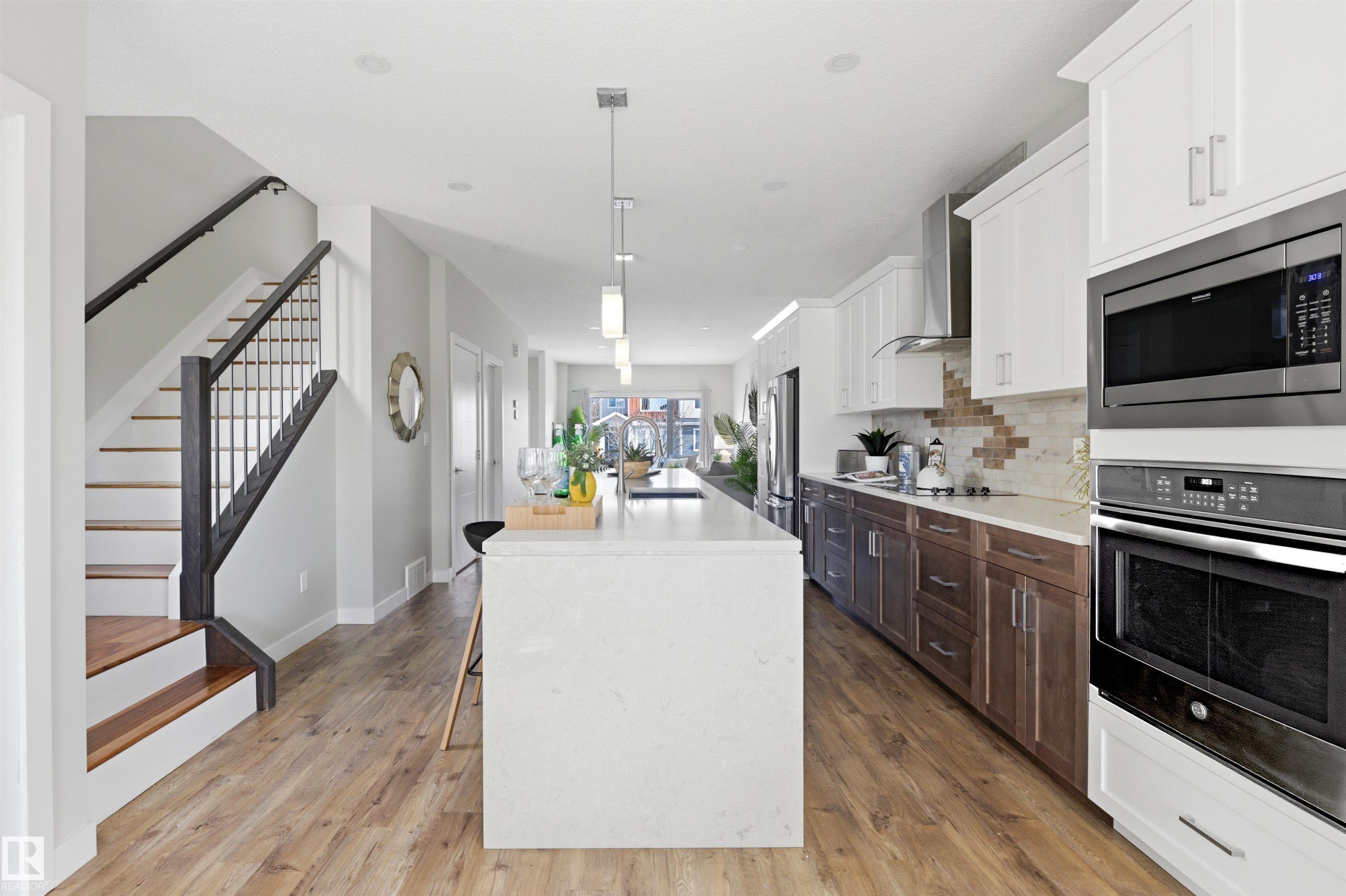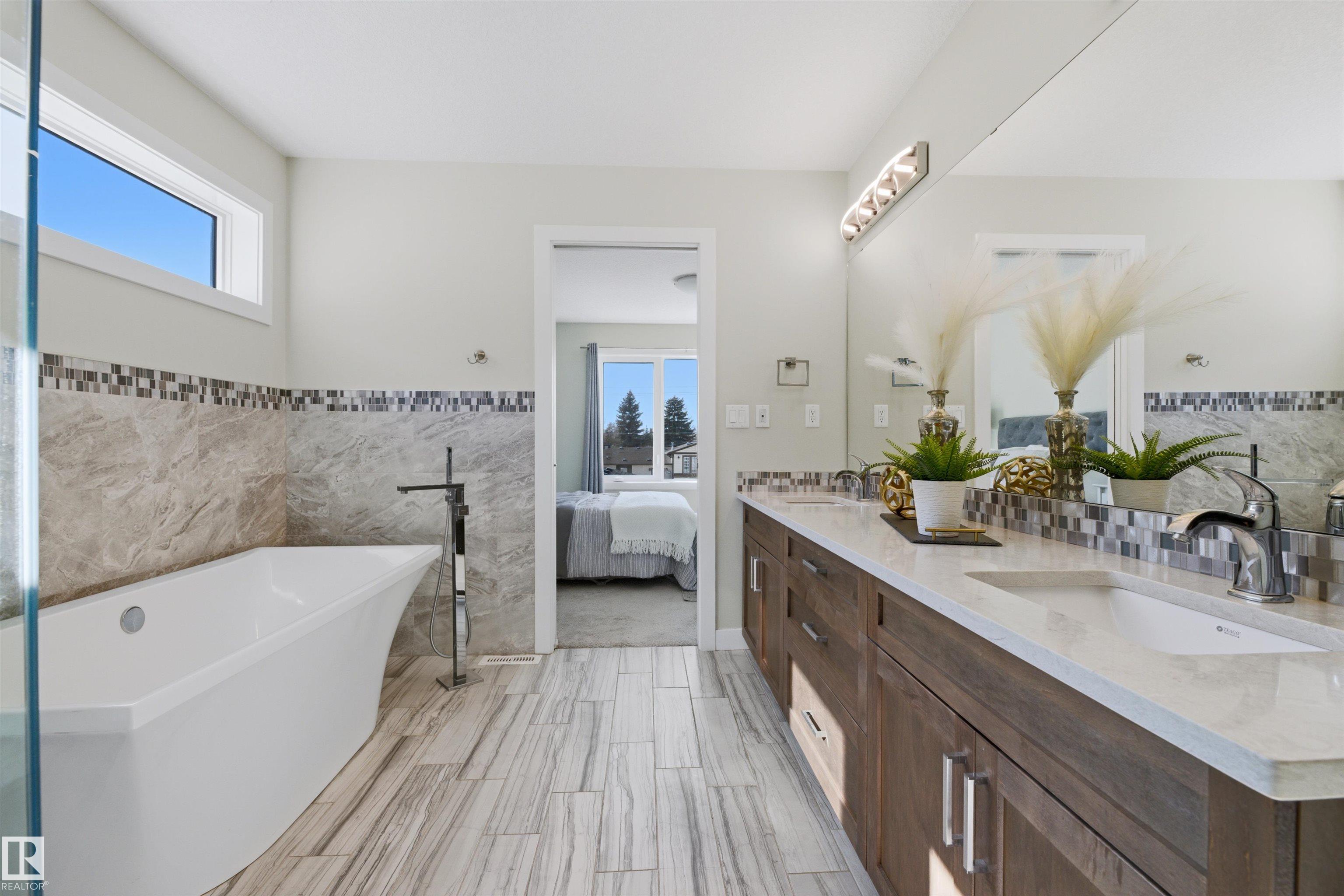 Exceptional value in this extremely well-loved 2-storey home in West Jasper Place, just steps to MacKinnon Ravine/Crestwood, new Valley Line LRT, minutes to Downtown. Open concept main floor is filled with loads of natural light and perfect for entertaining. GOURMET kitchen with GRANITE countertops, Massive island, STAINLESS steel appliances, twin oven/microwave built-in, and high-end dark/light cabinetry. Dining area opens to WEST back yard, massive deck, and double garage. Living area features gas fireplace. 3 generous bedrooms up, including spacious primary bedroom with a 5-piece (spa-inspired) ensuite and soaker tub. Upper floor laundry with sink. Half finished basement has suite potential (side entrance). Beautifully landscaped, stucco exterior. Private, fenced yard. This home is loaded with extras and drips with pride of ownership.